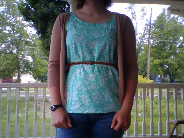 I also made my first piece of clothing this morning! I got this really pretty blue floral fabric awhile ago to make fabric coasters for one of my cousins for Christmas, and had a bit left over. It ended up being just enough to make a pretty tank-top.