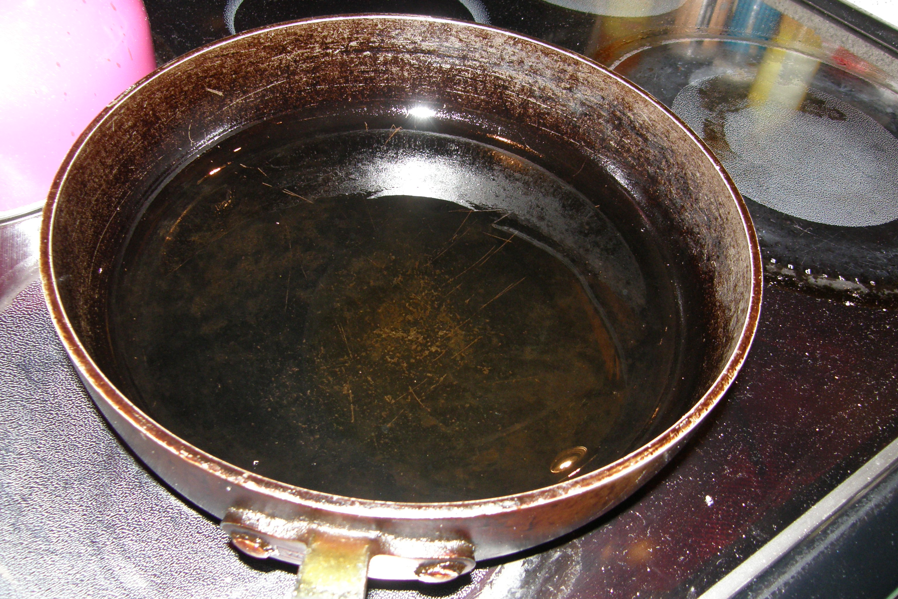 Meanwhile, spray a pan with cooking spray and allow the bubbles to diminish. Then, pour olive oil into the pan so that it covers the entire bottom of the pan.