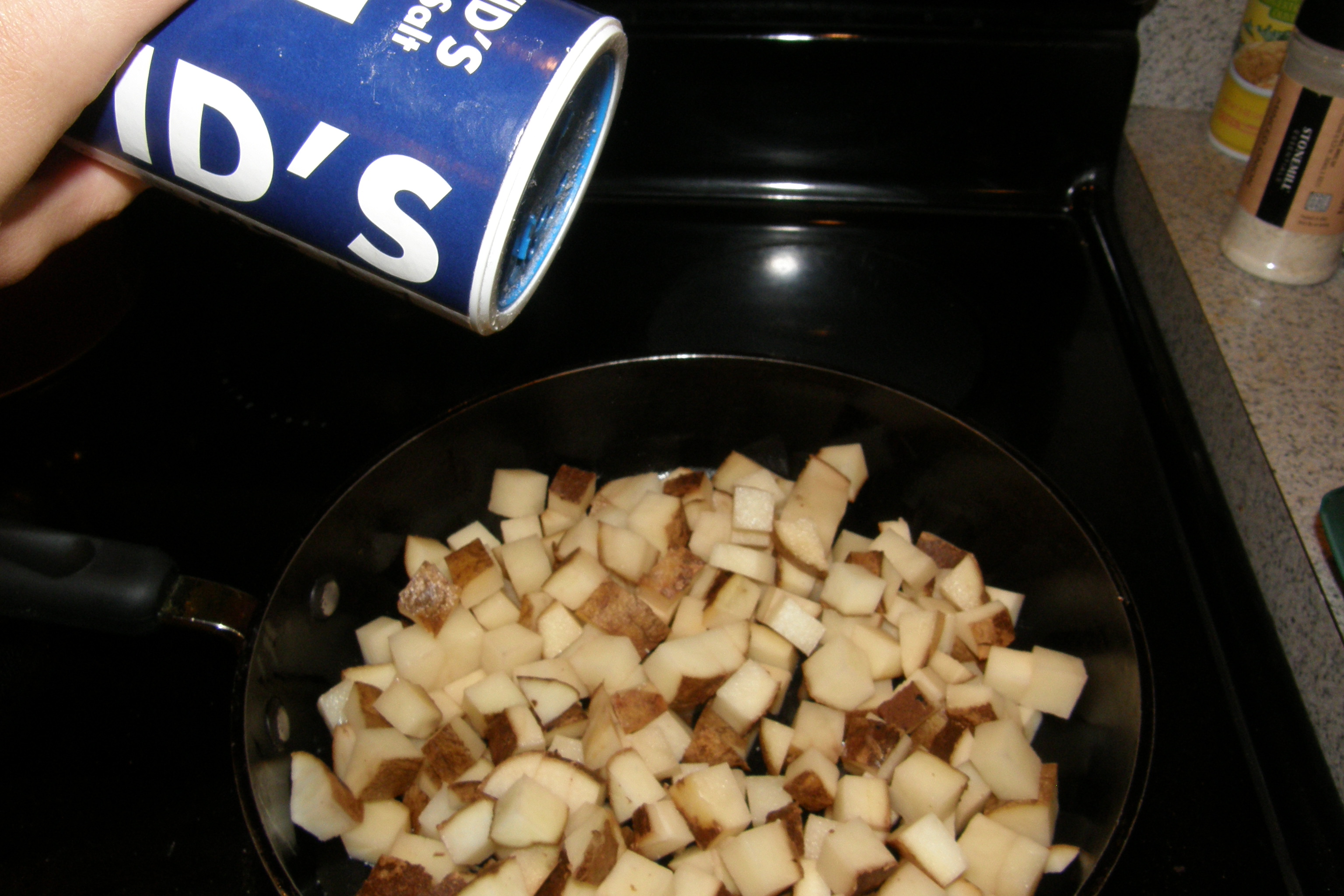 Put your cut up potatoes in the pan, and cook them at medium low heat.