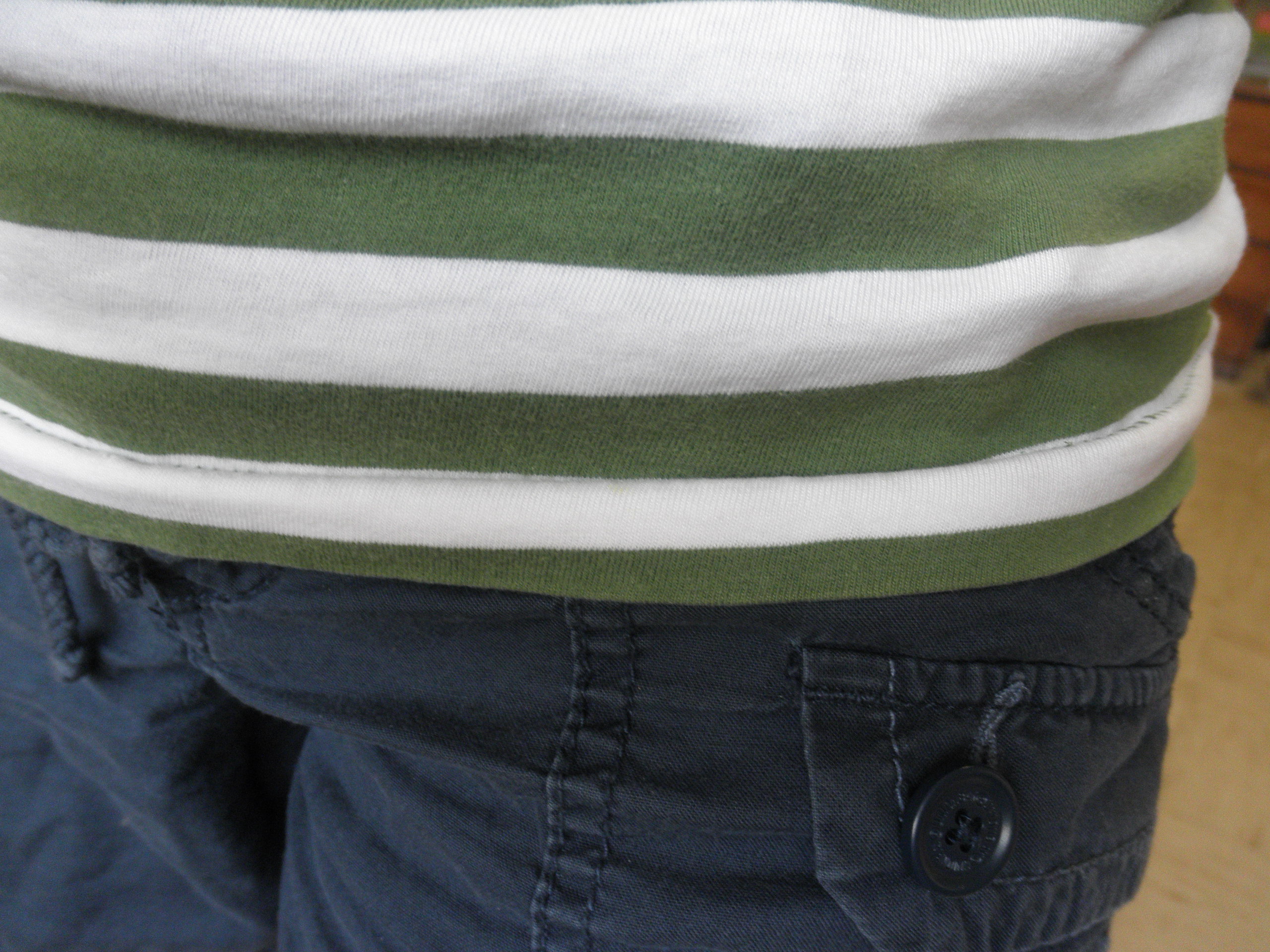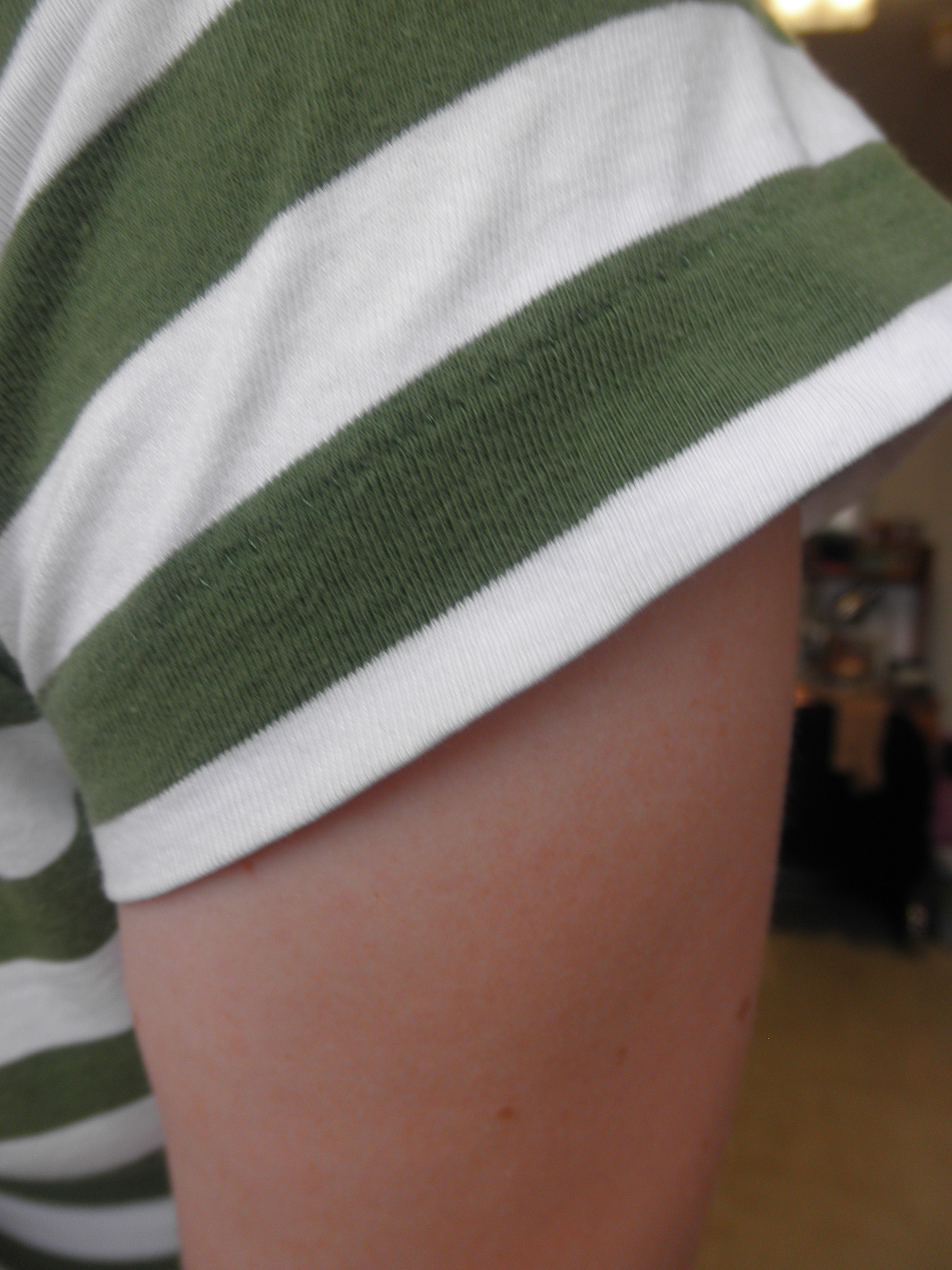 I decided to start with the green and white striped one first. I used a shirt I already had (it was actually long-sleeved) as a guide, and made a simple t-shirt for myself out of it. I used the original hem for the bottom and on the sleeves, which both made it a lot easier to sew and gave it a much more professional look. I simply cut it out, sewed the sides, sewed the sleeves on, and finished the seam on the neckline. It was super easy (I think I finished it in about 2 hours, start from finish) and I love the result. It is the first piece of clothing I’ve made for myself and really worn often. It is one of my favorite shirts now, and I have gotten so many compliments on it (they usually don’t even realize it’s handmade).