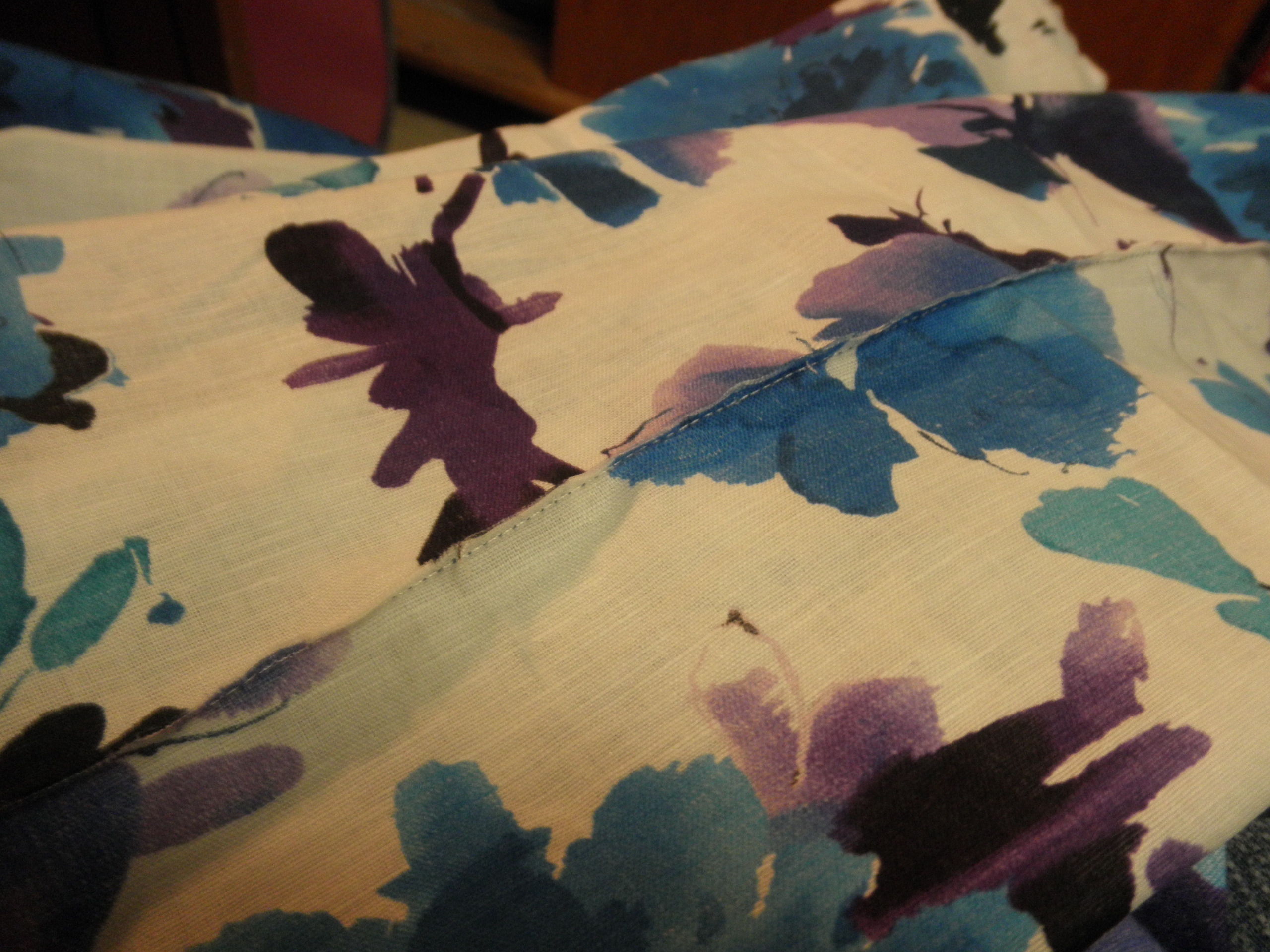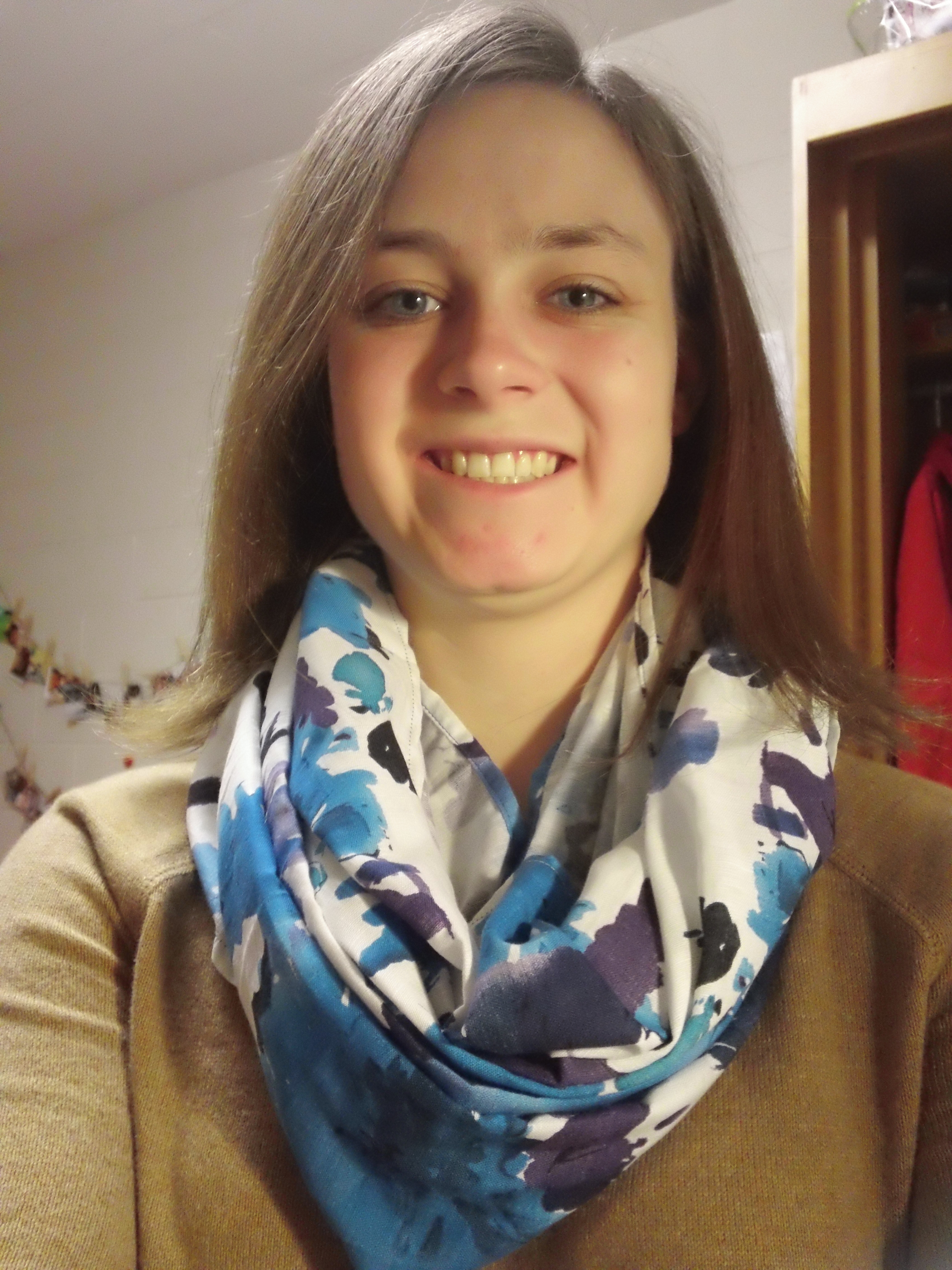 I finally brought out my sewing machine to actually sew a complete project. I went shopping last weekend with some friends, and got the tan sweater I’m wearing in the above photo. If you look at my most recent post, you can see me wearing it with a navy and coral scarf. It was the only scarf that I have that went with it at all. While we were shopping, I tried it on with a navy blue scarf, and really loved the combination of the colors. I’ve had this blue, white, and purple floral fabric from JoAnn Fabrics for awhile. I had intended to make a dress out of it, but I decided that it was far more likely for me to start and finish a scarf rather than a dress, so I cut into it. I believe it is a linen-like fabric, but I’m not really sure. Since it was a relatively easy project and I know a lot of people love infinity scarves (I love them!), I figured I’d share my method.