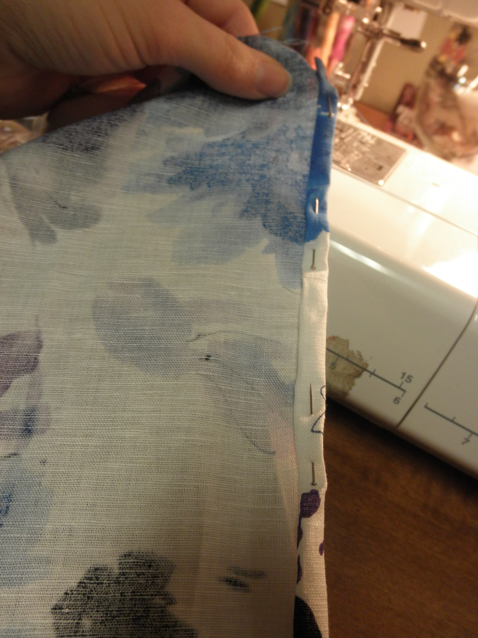 Hem each of the longer sides. Use a rolling hem if you know how to do that (I don’t). Or just fold the fabric under 1/8″ and then fold it over another 1/8″ to enclose the raw edge of the fabric. Sew.