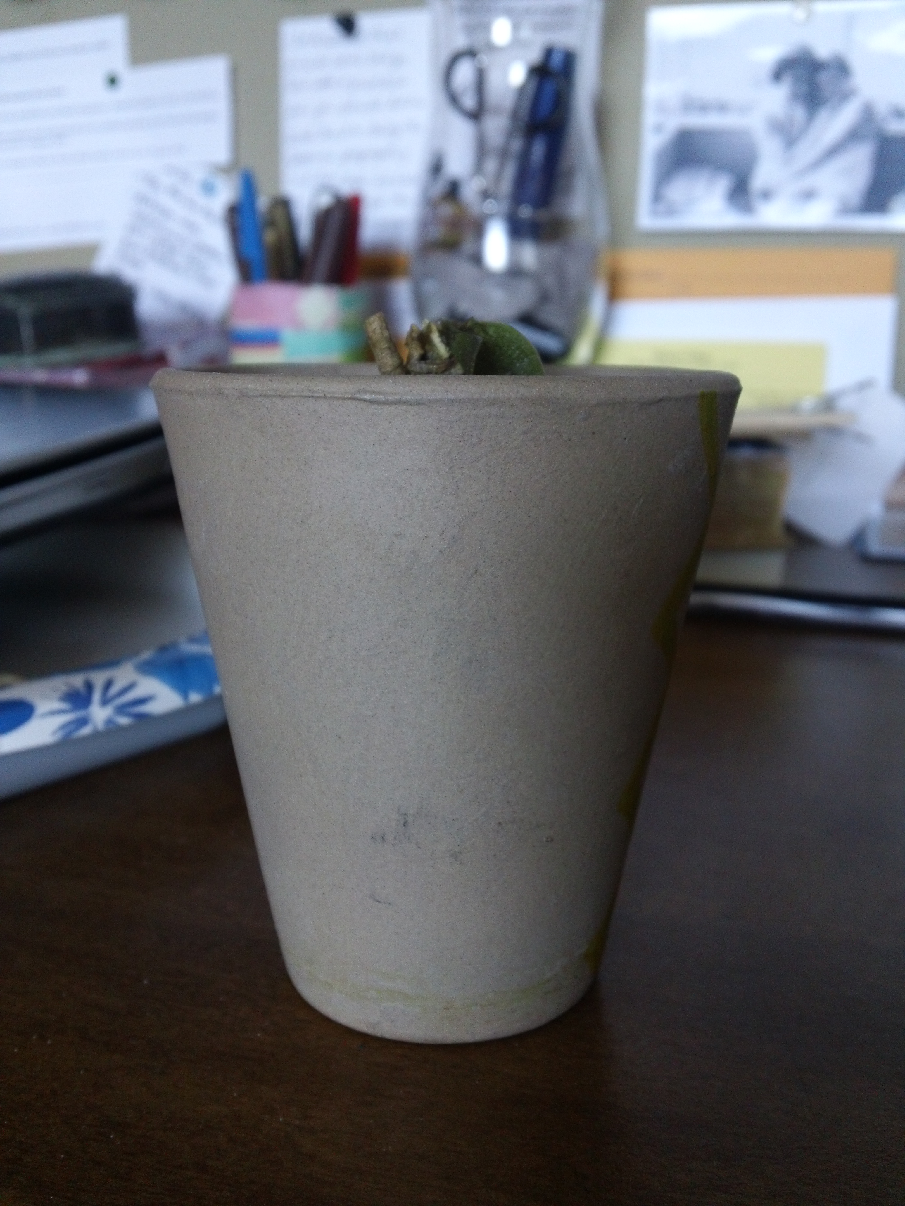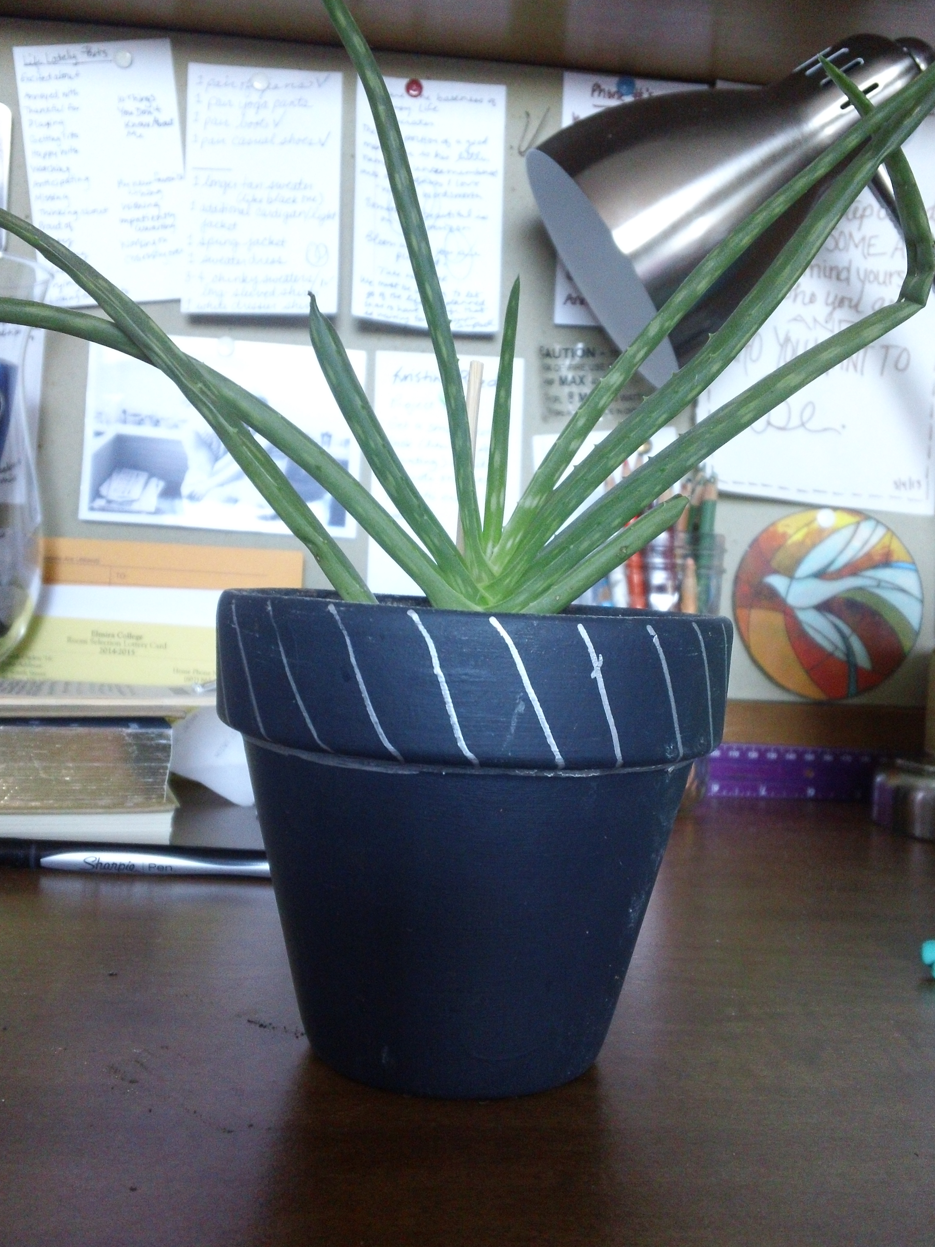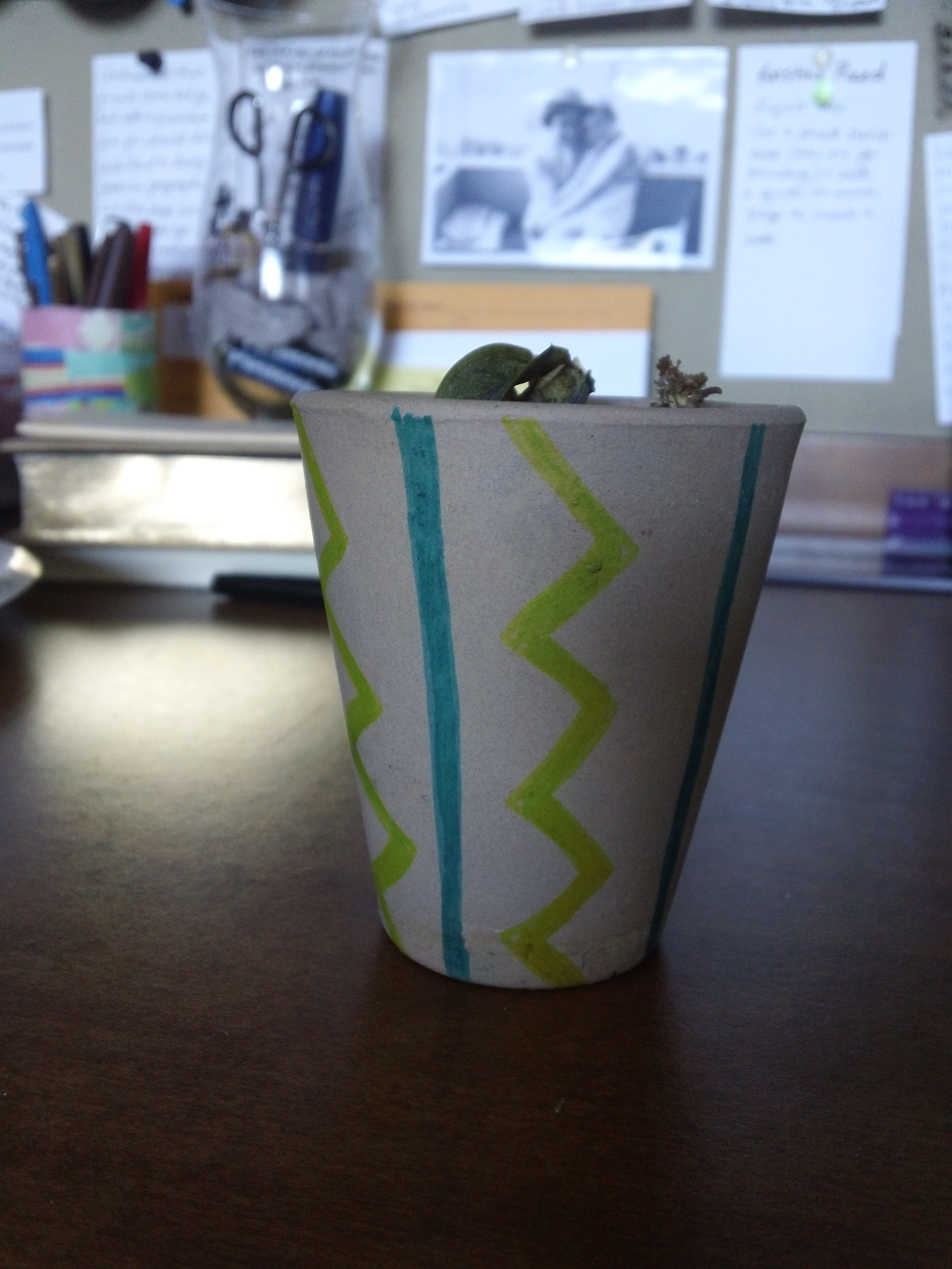 For the first one, I just took the original pot, wiped it off a little, then used two sharpies (yellow and turquoise) to create a zig-zag/stripe design. I love the added pop of color it gives my desk area.
