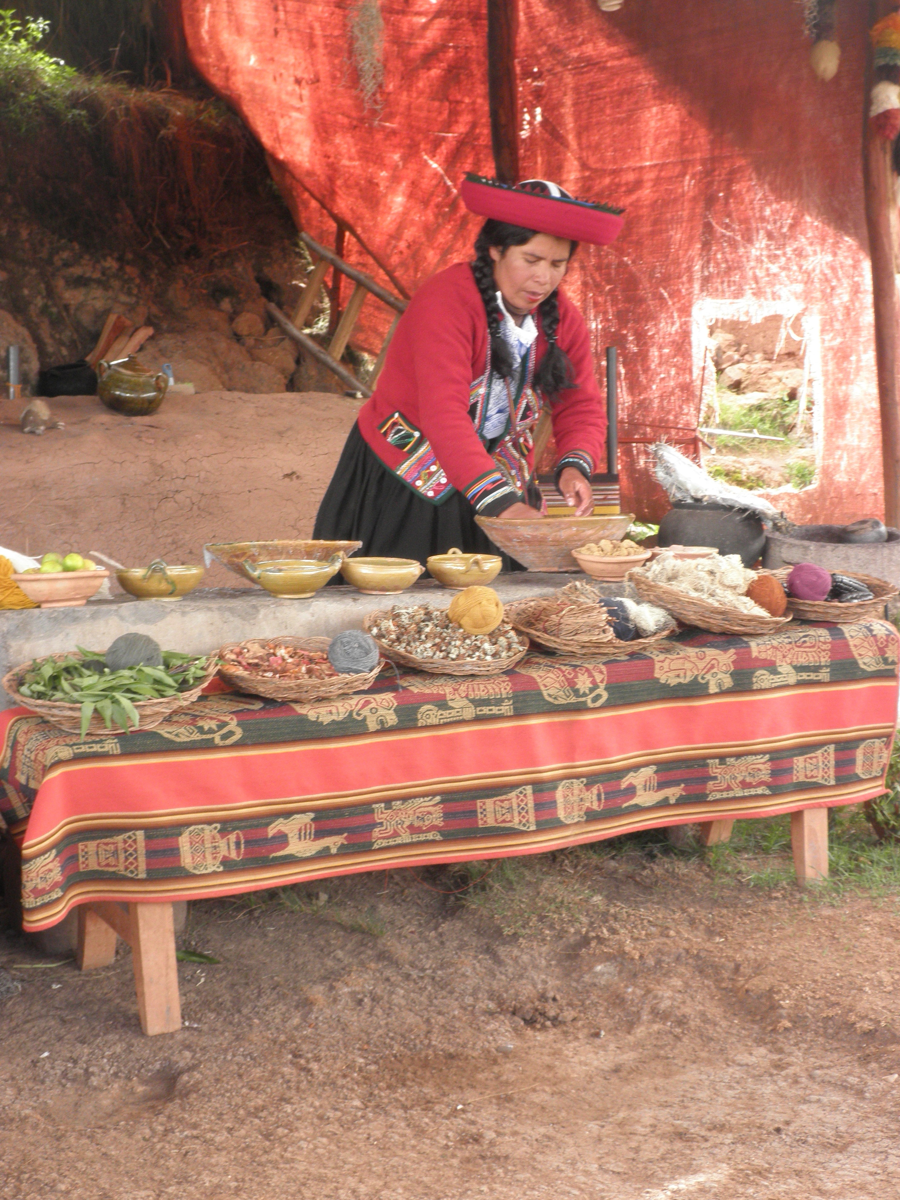 Also in Chinchero, we went to a house where several different families create and sell their textile handiwork. One of the women did a demonstration for us, showing us how they make their dyes and prepare the wool for yarn. They use dyes made from natural sources, mostly plants, but also some animals, such as the blood from certain bugs. They create a shampoo from a certain type of root, so even that part of the process is natural. After the demonstration, several of us bought some of the things they have made. They then allowed us to wear their hats and shawls and take some pictures.