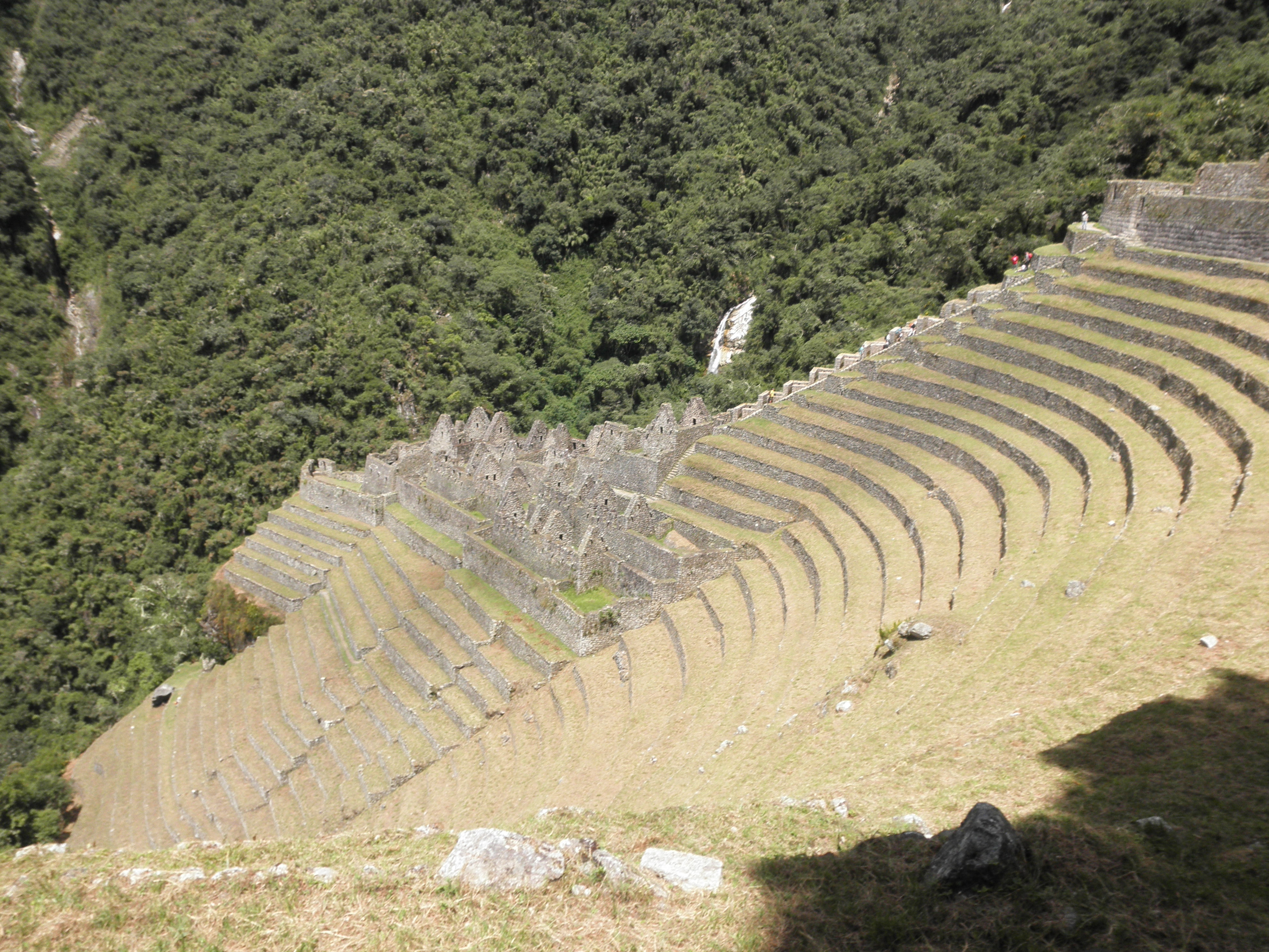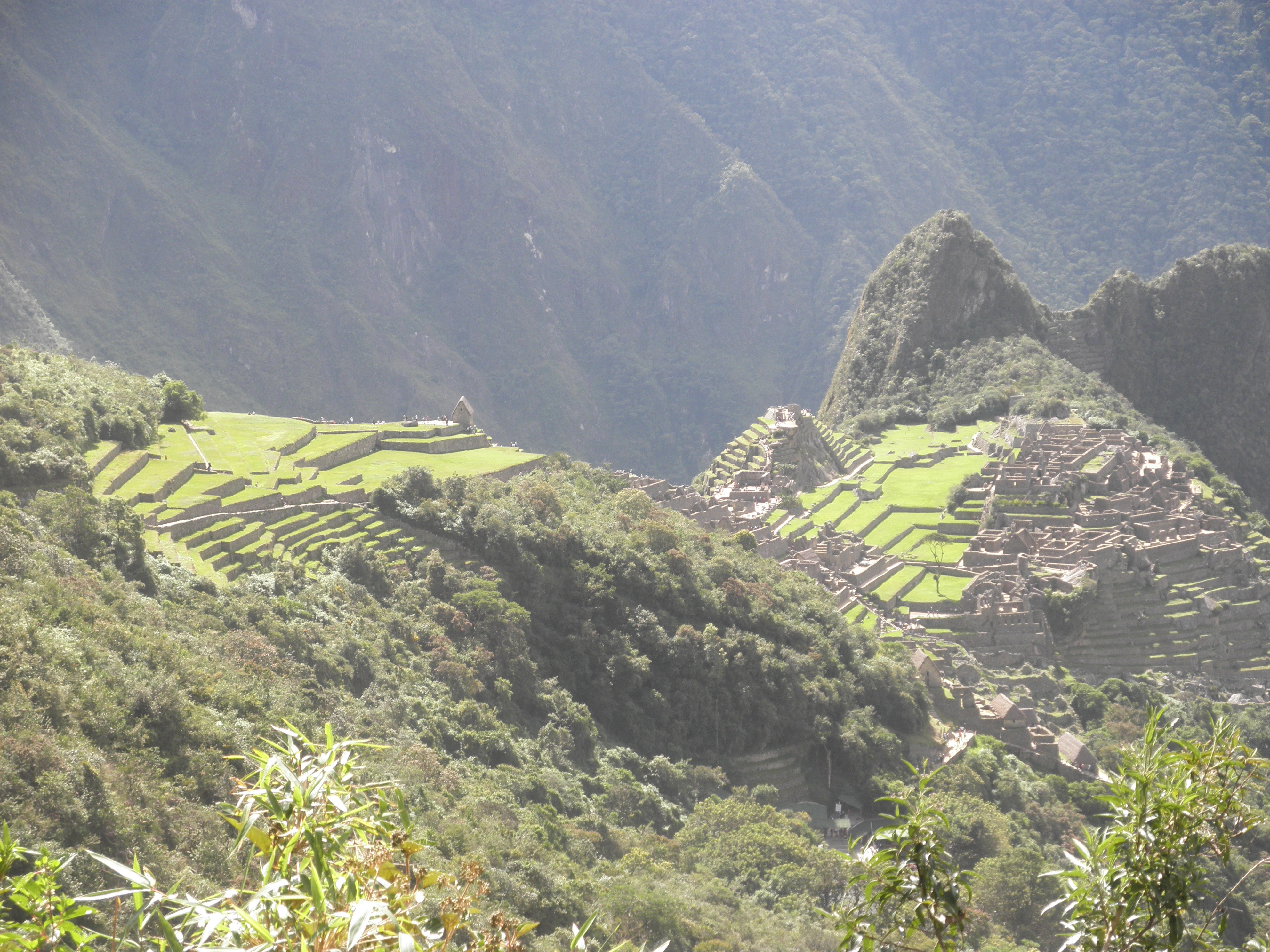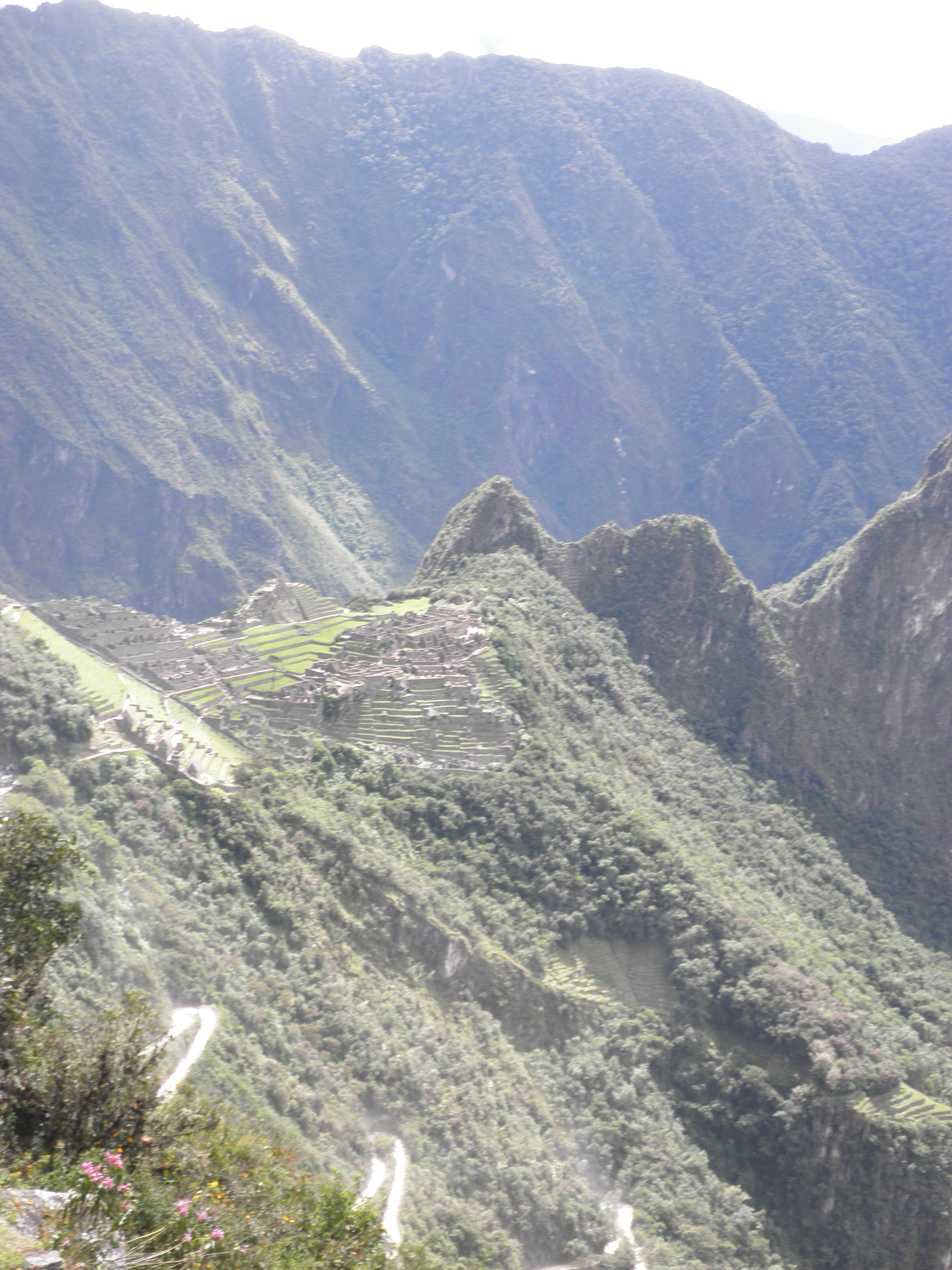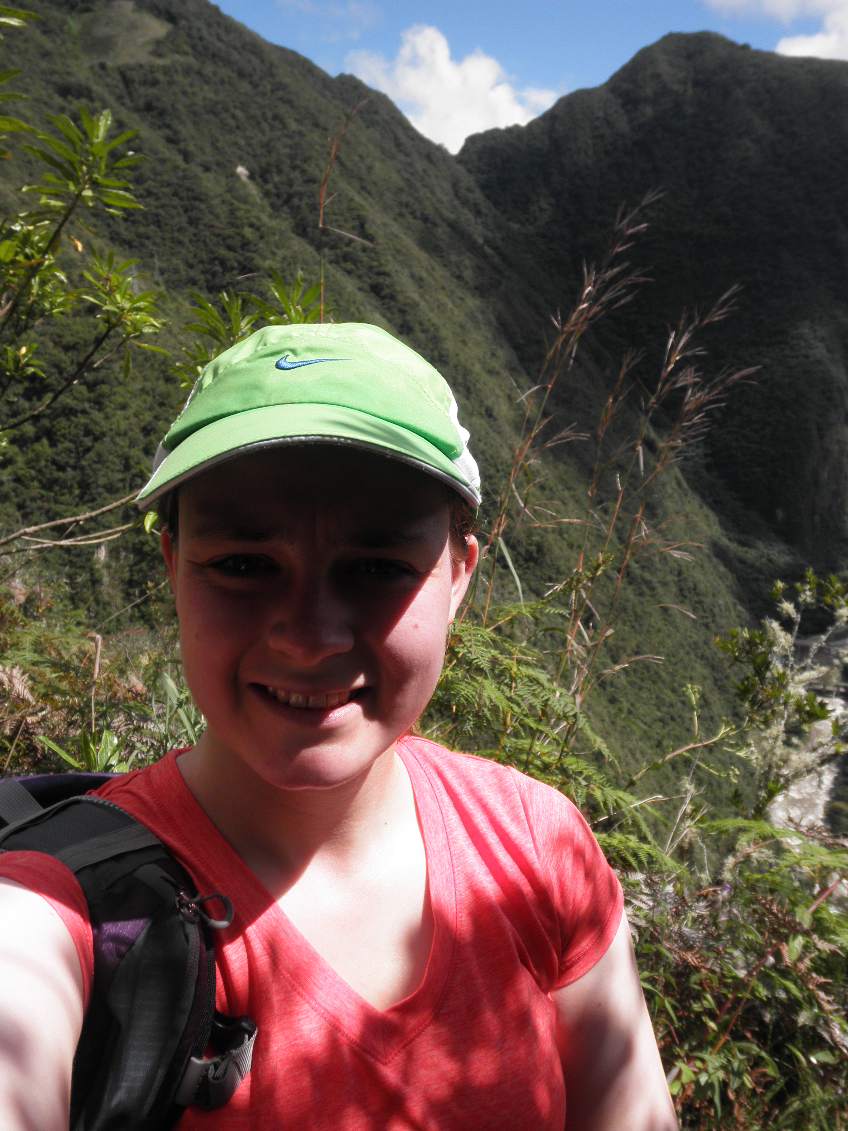 We were supposed to depart from Cusco at 3:30 AM to rejoin the rest of our group at Ollantaytambo, but the bus driver called to say there were problems with the bus, so we waited an hour until the man who planned the trip was able to drive us to Ollantaytambo. It was a “fun” ride since we had to get there quickly and the roads were extremely windy (meaning we both got a bit carsick). We were supposed to meet the other group in time to join them for breakfast, but we were rather late, so we only had granola bars for breakfast (which probably was way less than we should have eaten before a pretty long and somewhat difficult hike). We met them, then headed to the train station to board the train that takes people up to Aguas Calientes. We, however, got off after a short amount of time at the 104 kilometer mark to start the Inca Trail trek. The trek from here to Machu Picchu was a bit difficult, especially after two days of being sick. The first 2 1/2 hours were completely uphill, but after that, things evened out a bit. We stopped briefly for a snack near a waterfall, and also at Winaywayna, an Inca city and site. At one point, I had a lot of trouble breathing (it has been decided that high altitudes and I don’t mix well), but managed to recover and finish the trek. At the very end, right before the Sun Gate of Machu Picchu is a very steep set of stairs that is referred to as the “Gringo (white people) Killer”, but it wasn’t quite as bad as our guide had made it sound.