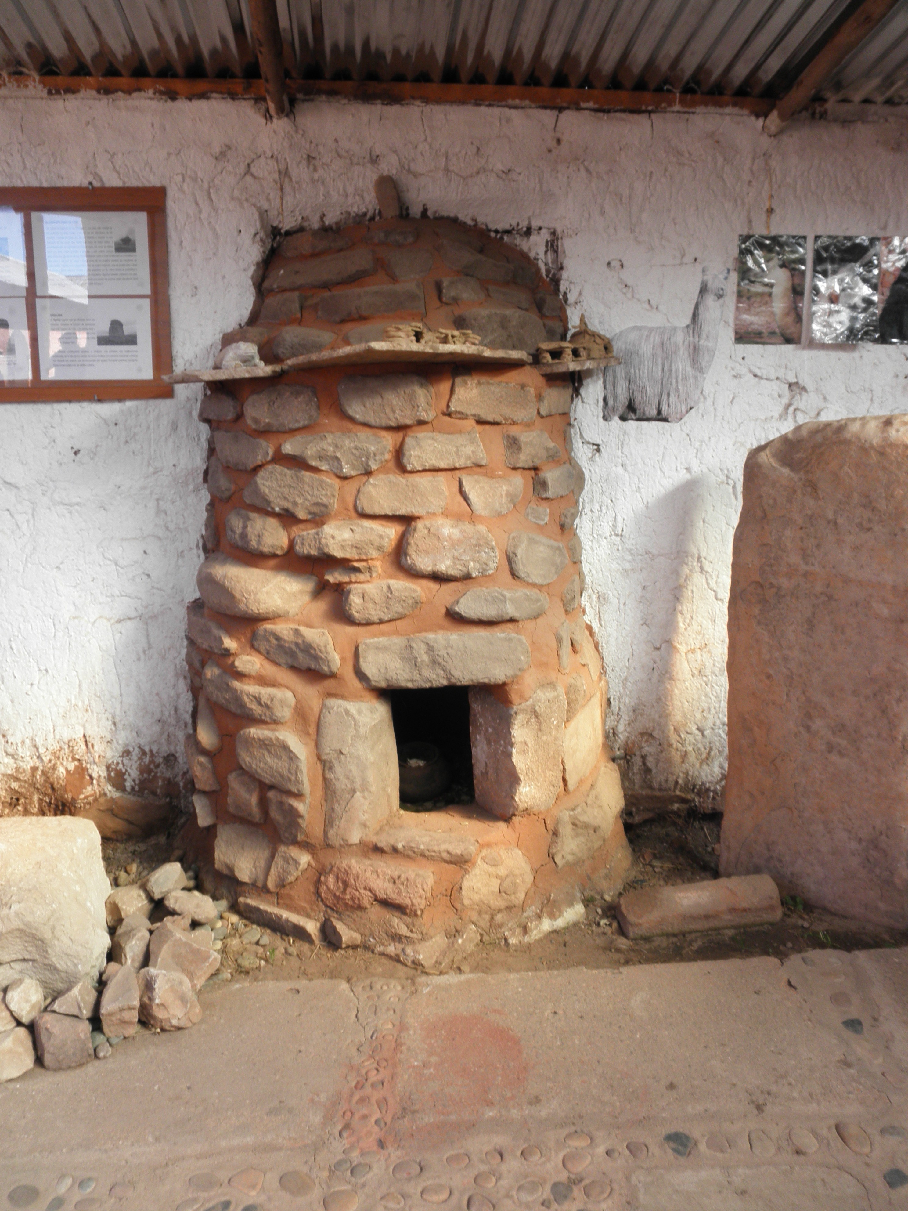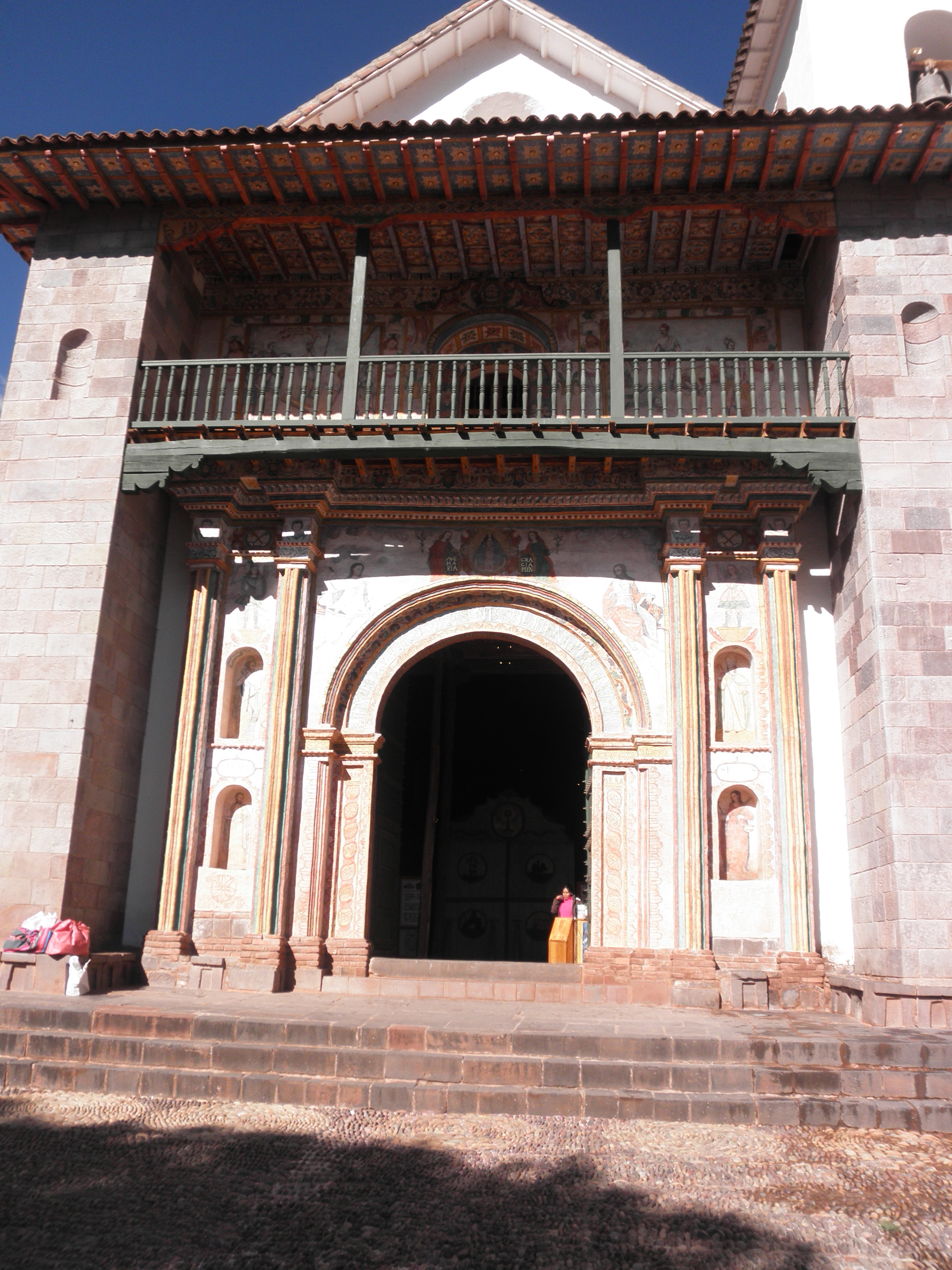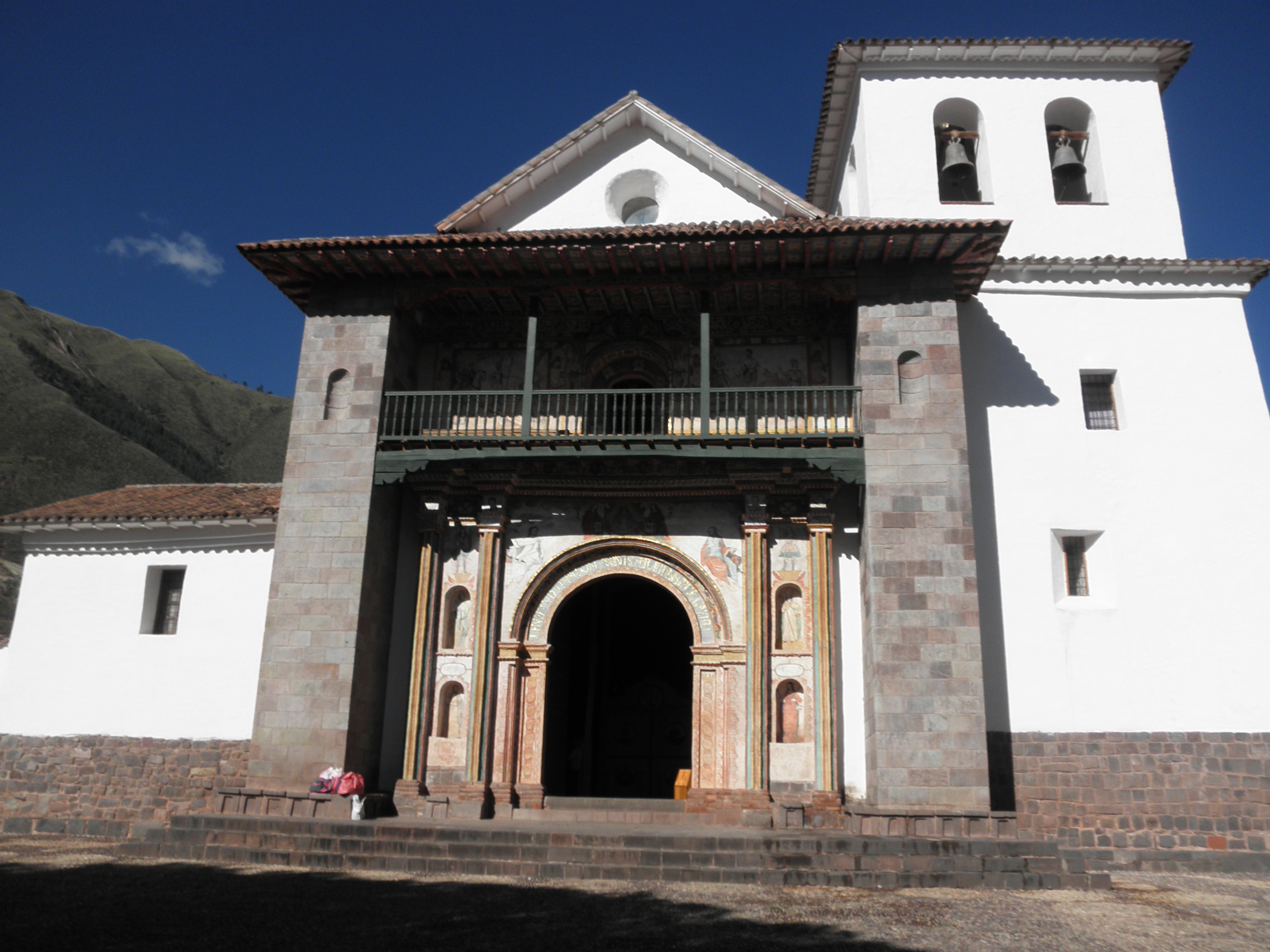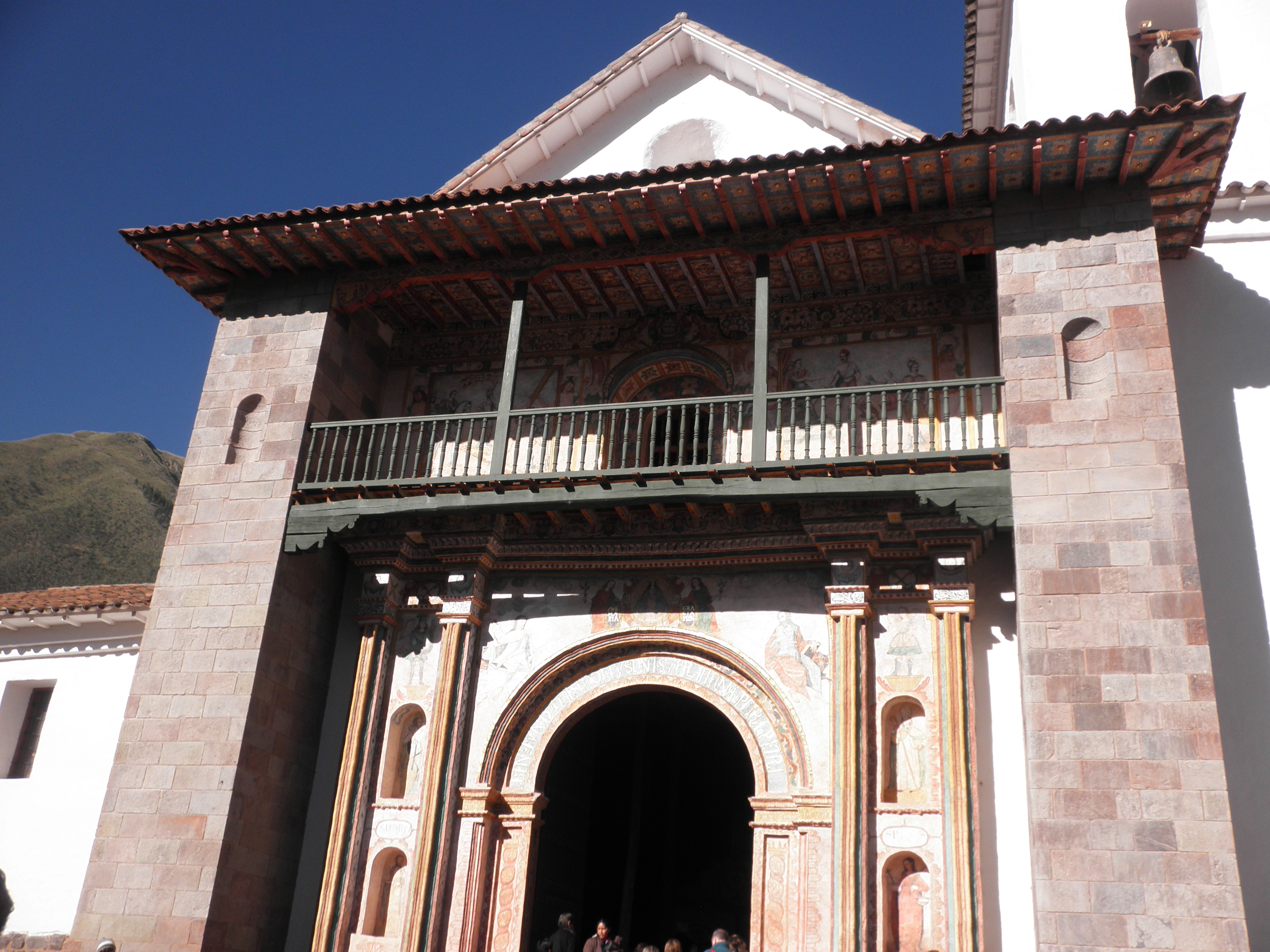 Our first stop was Andahuaylillas, a church that is often called “The Sistine Chapel of the Americas” because of its amazing murals on the walls and ceilings. It was originally built by the Jesuits, who commissioned the murals, and for awhile was owned by the Dominicans during the time the Jesuits were driven out of Peru by the Spanish because they had gained too much power. After the Independence Revolution, the Jesuits returned and regained ownership of the church. Because of the two different influences, there are two altars and two pulpits with very different styles. The Jesuit altar/pulpit is covered with murals, while the Dominicans built an intricately carved wooden pulpit. Unfortunately, we weren’t able to take pictures inside the church. Another interesting part of the church is one of the doorways, where “I baptize you in the name of the Father, Son, and Holy Spirit” is written in five different languages: Spanish, Latin, Quechua (still spoken by the indigenous people in many parts of Peru), Aymara (still spoken in some areas of Peru near Lake Titicaca), and Pukina (now extinct).