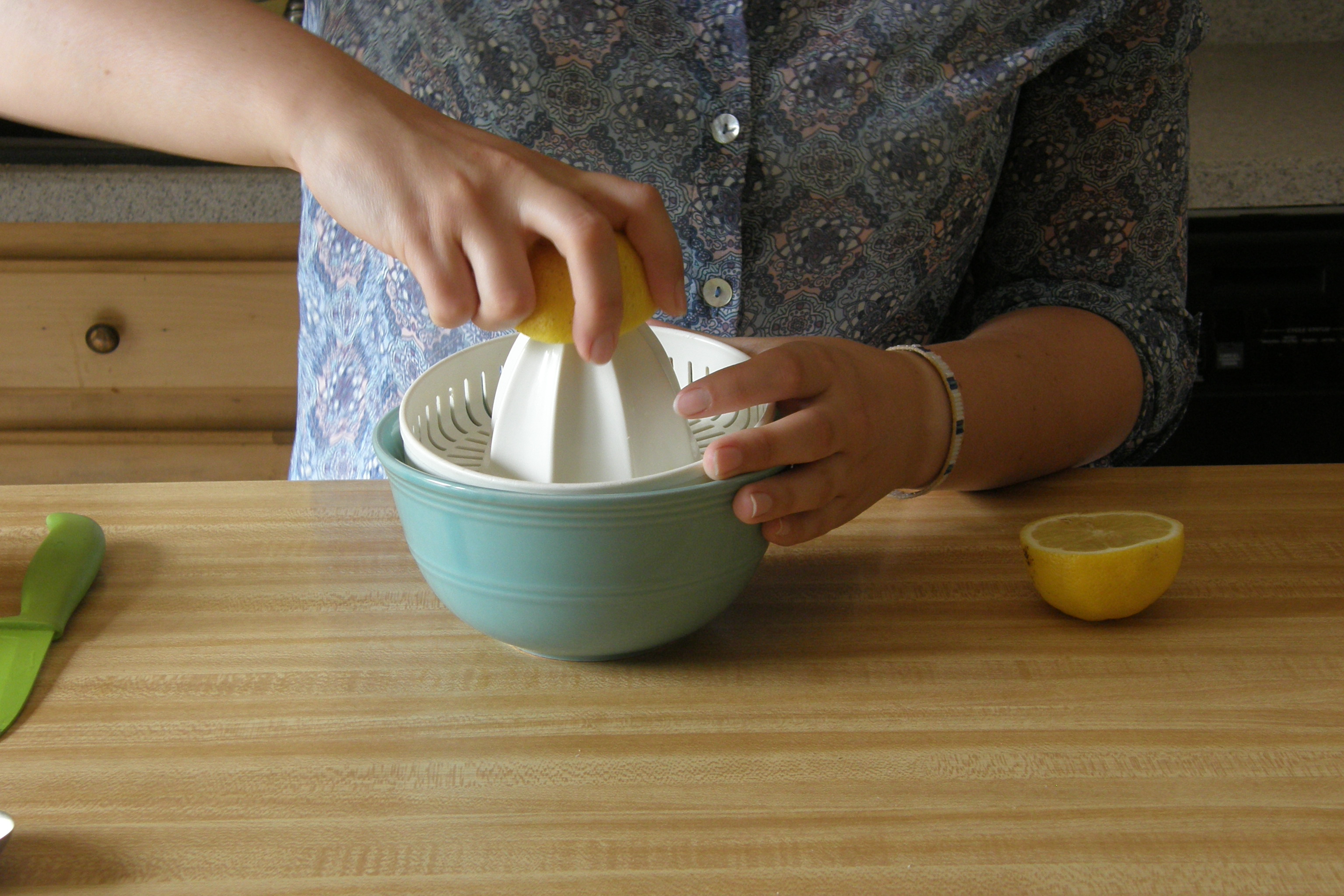 2. Using a hand juicer (or any other kind of juicer you have), press down on the lemon and move it in circles around the ridges to squeeze the juice out of the lemon. I usually do this over a medium-sized bowl.