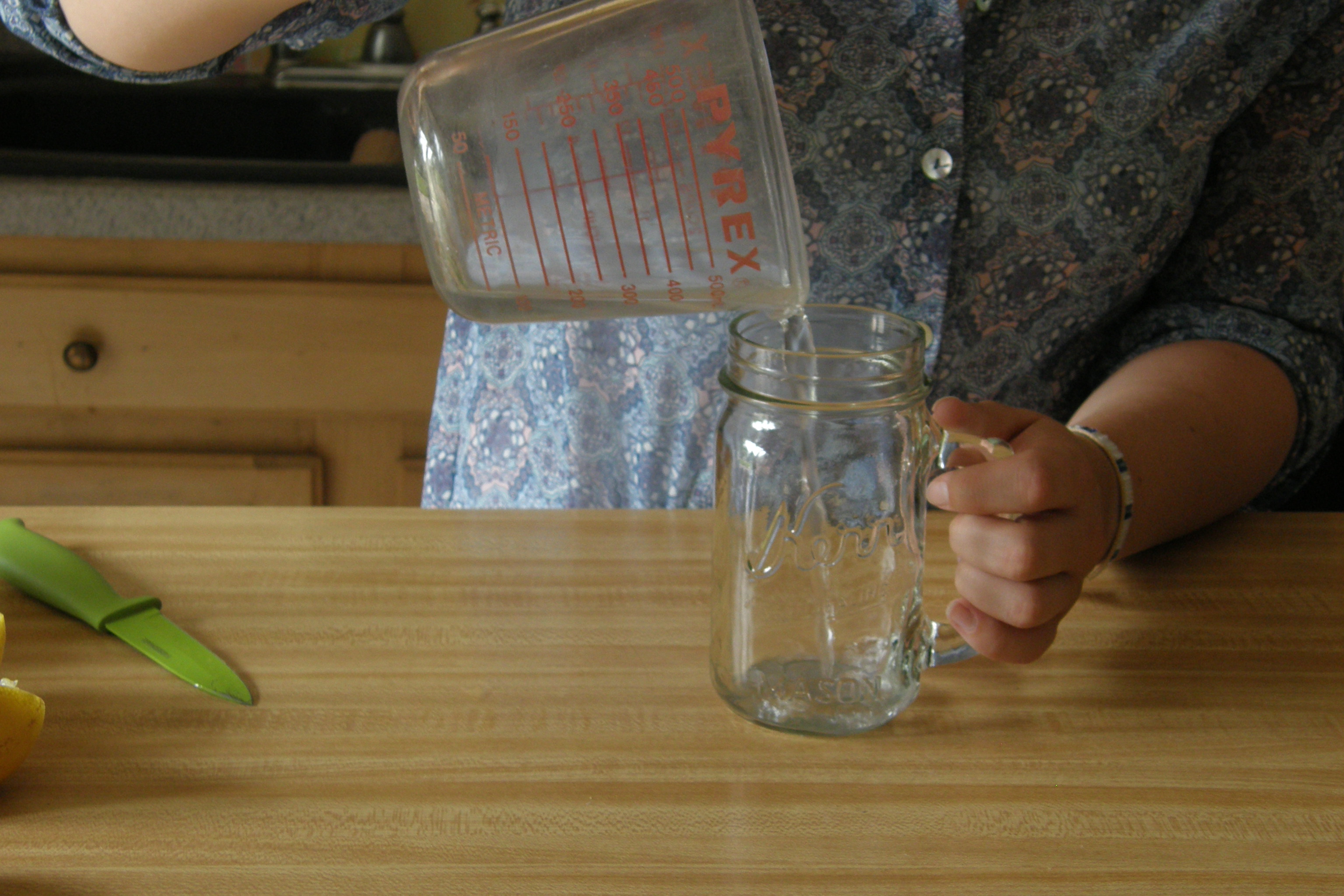 3. Pour 1/4 cup of hot water (the hottest water that you can get out of the tap should be fine) into your glass.