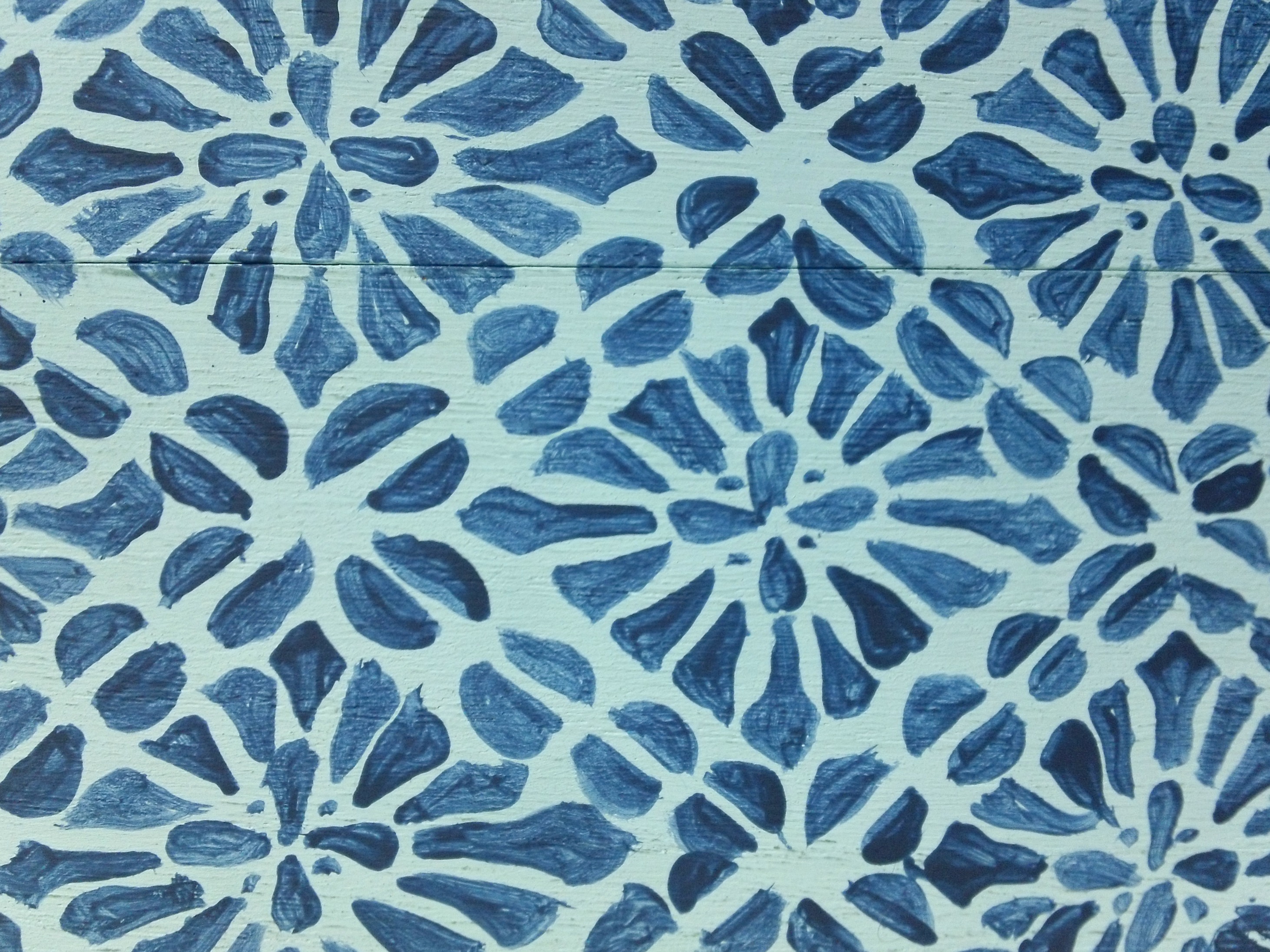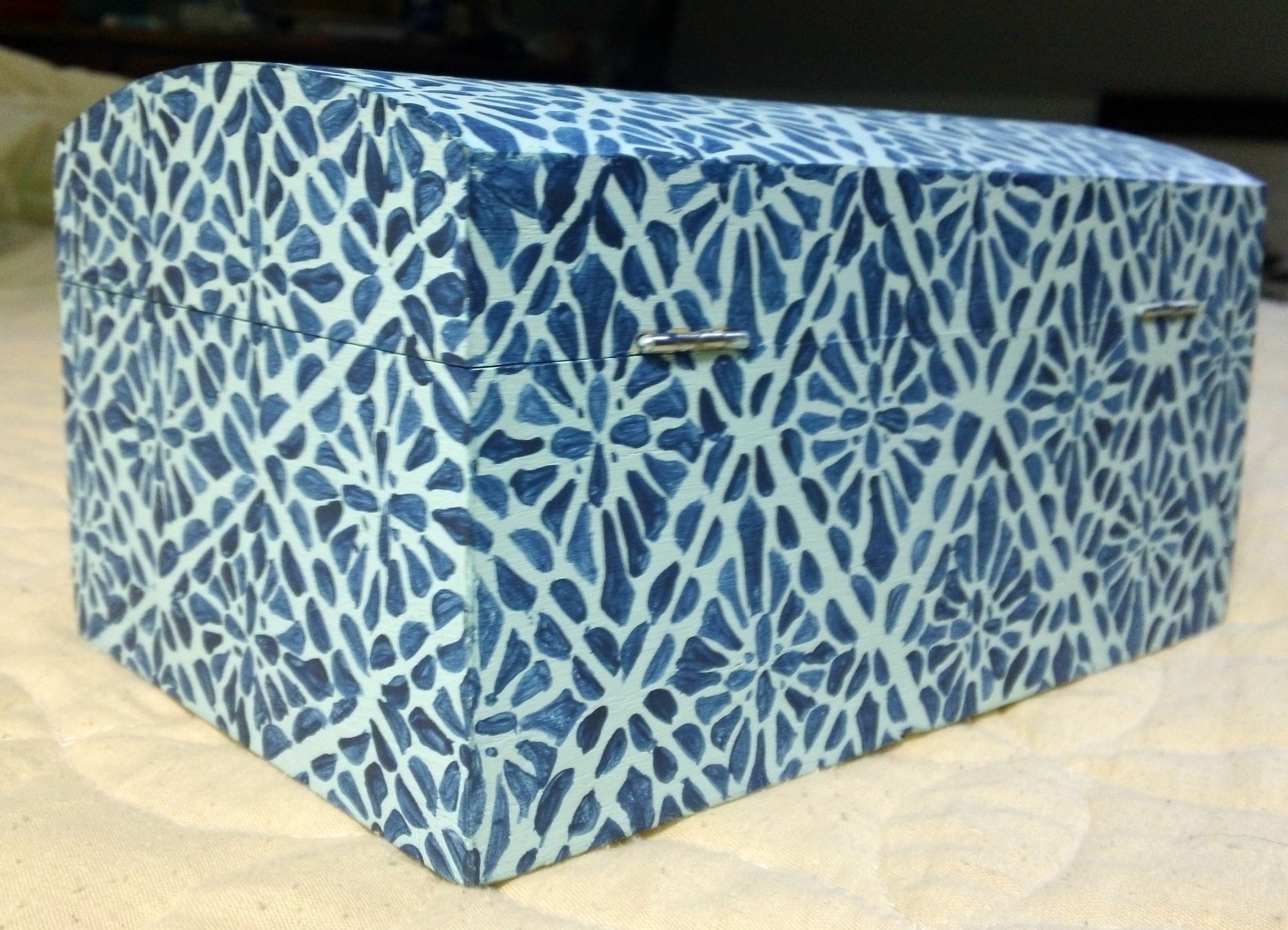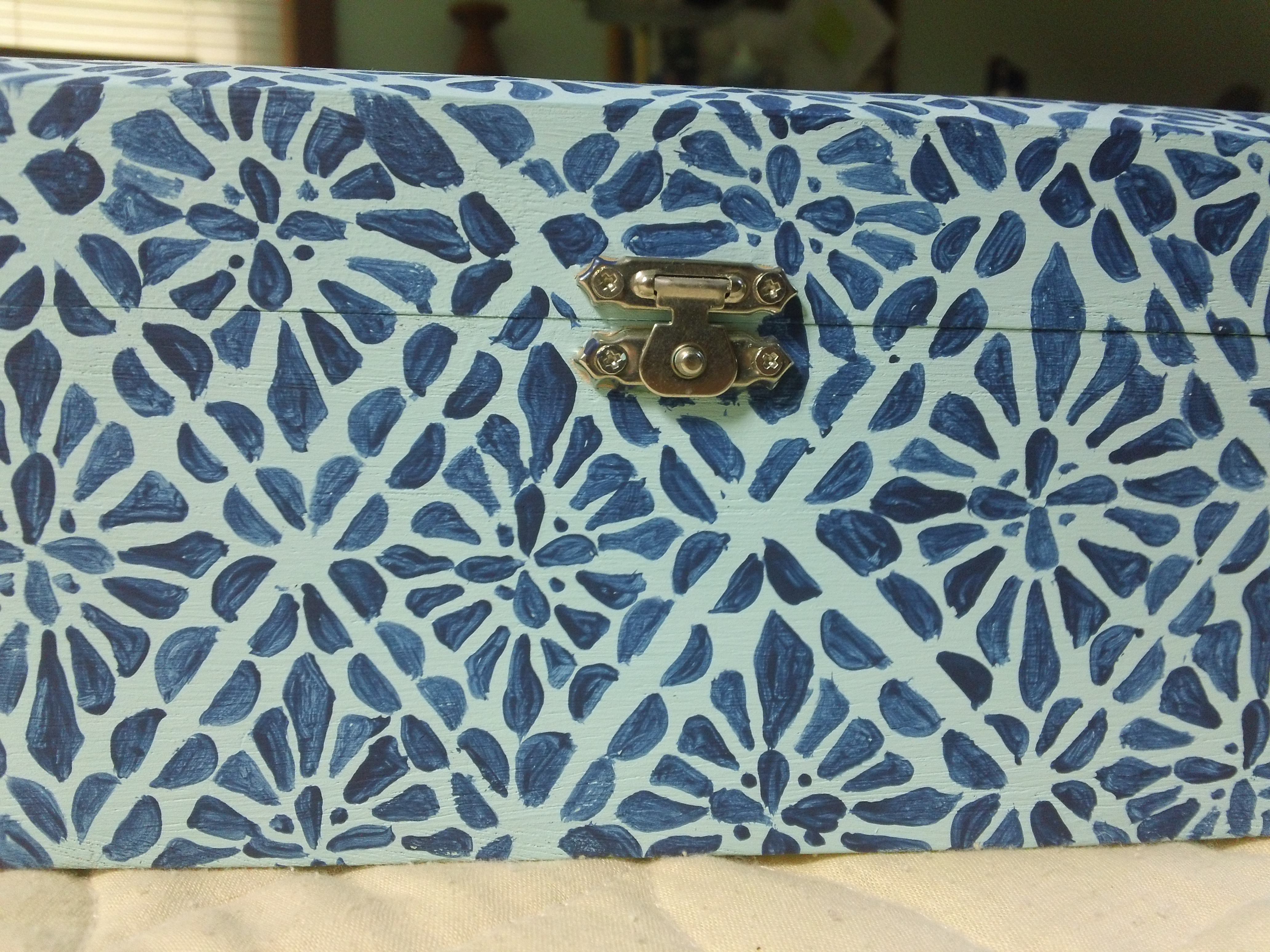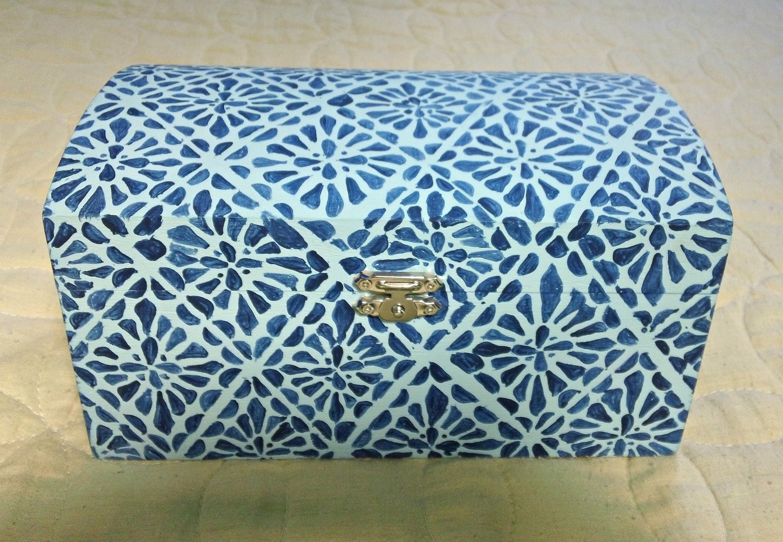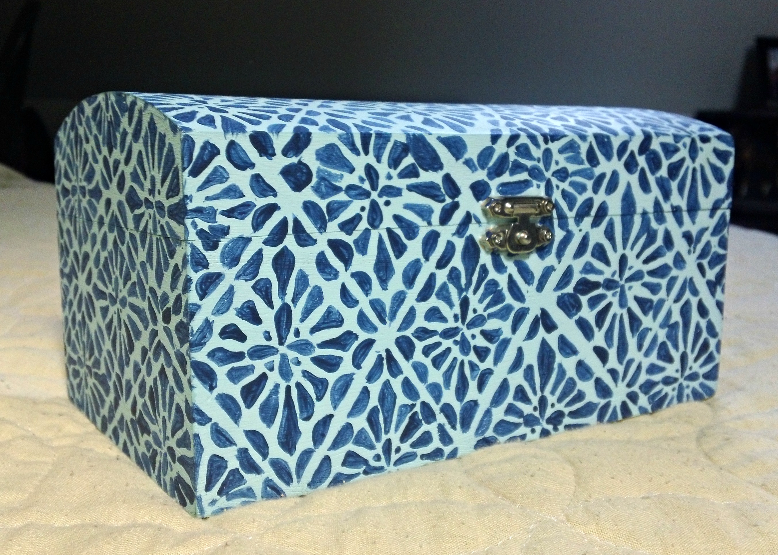 For the first box, I decided to take a design I had seen in a wallpaper and free-hand it onto the box. I first painted a base coat of the bottom color and then painted over it with a navy blue. Although I am very happy with the end result, it was definitely a bit of a challenge- I probably should have chosen an easier pattern! The whole box (I painted the top and all four sides) took me at least 5 hours to paint.