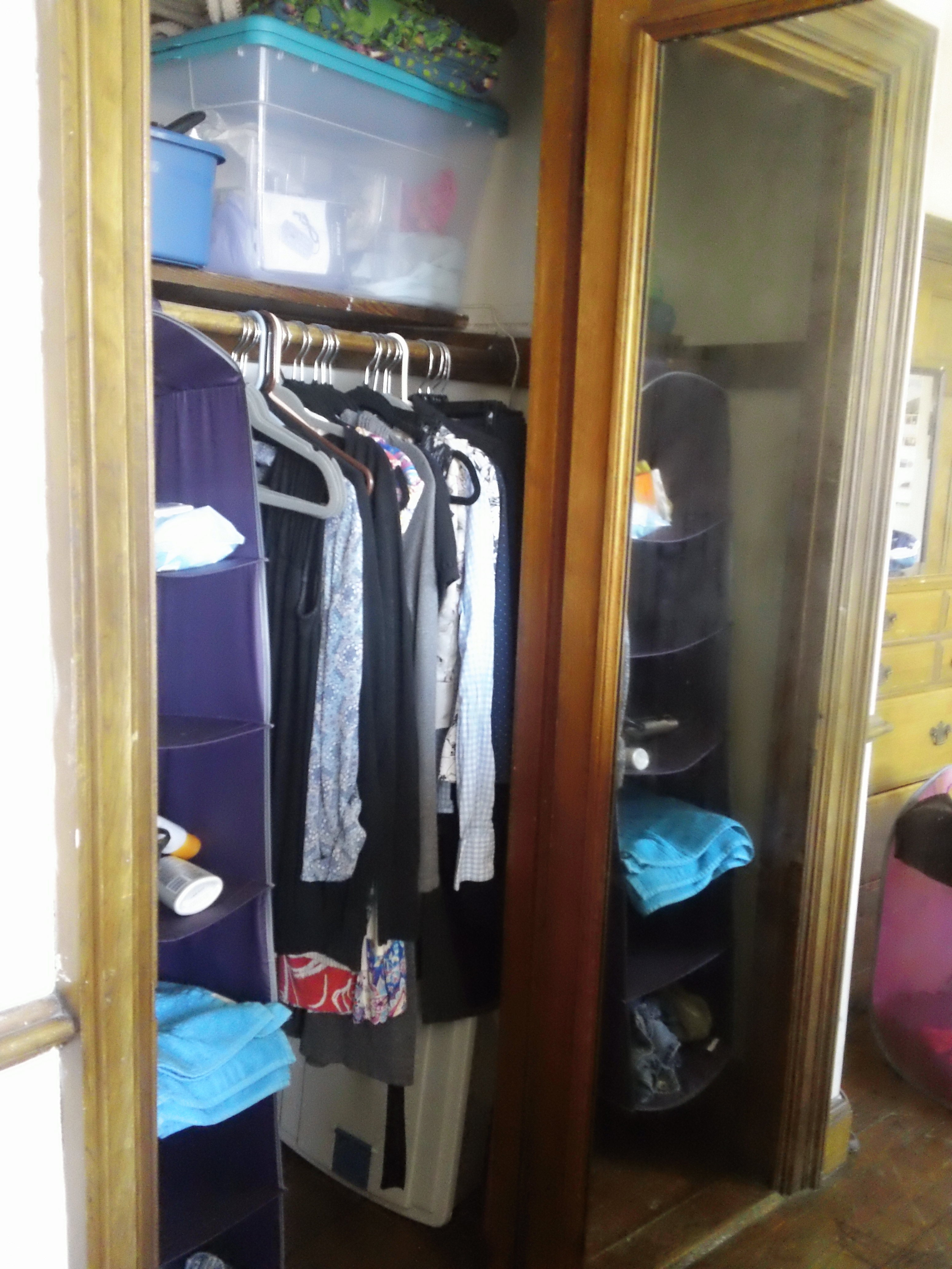 The closets aren’t huge, but they do have quite a bit of vertical space (it would be nice if there were more shelves, but there there isn’t much I can do about that). There are hooks all along the walls within the closet though, which are nice for hanging coats and bags up. The door has this huge full-length mirror built into it, which faces inside toward the closet when the door is closed. Unfortunately, it is very old and therefore foggy.