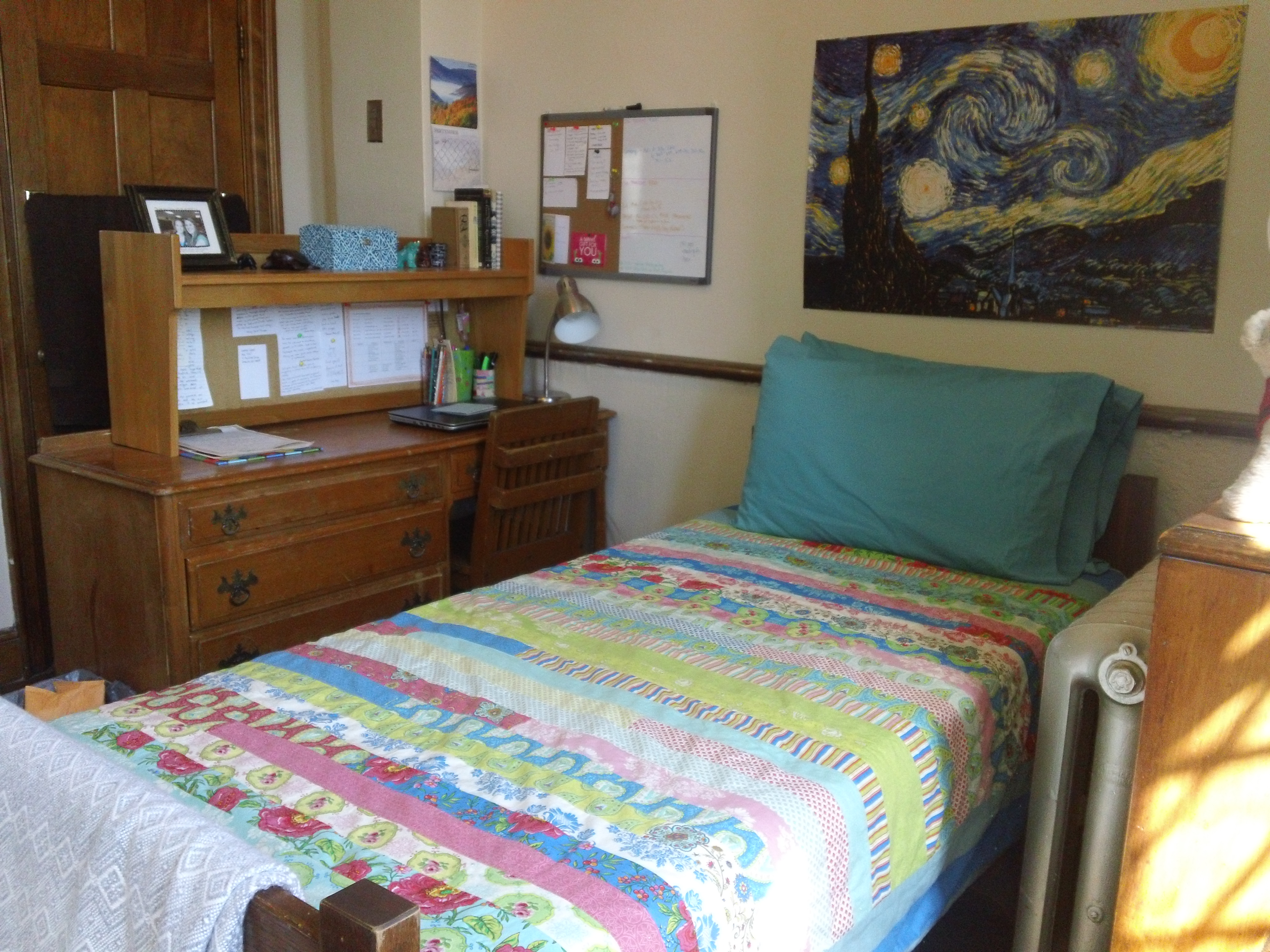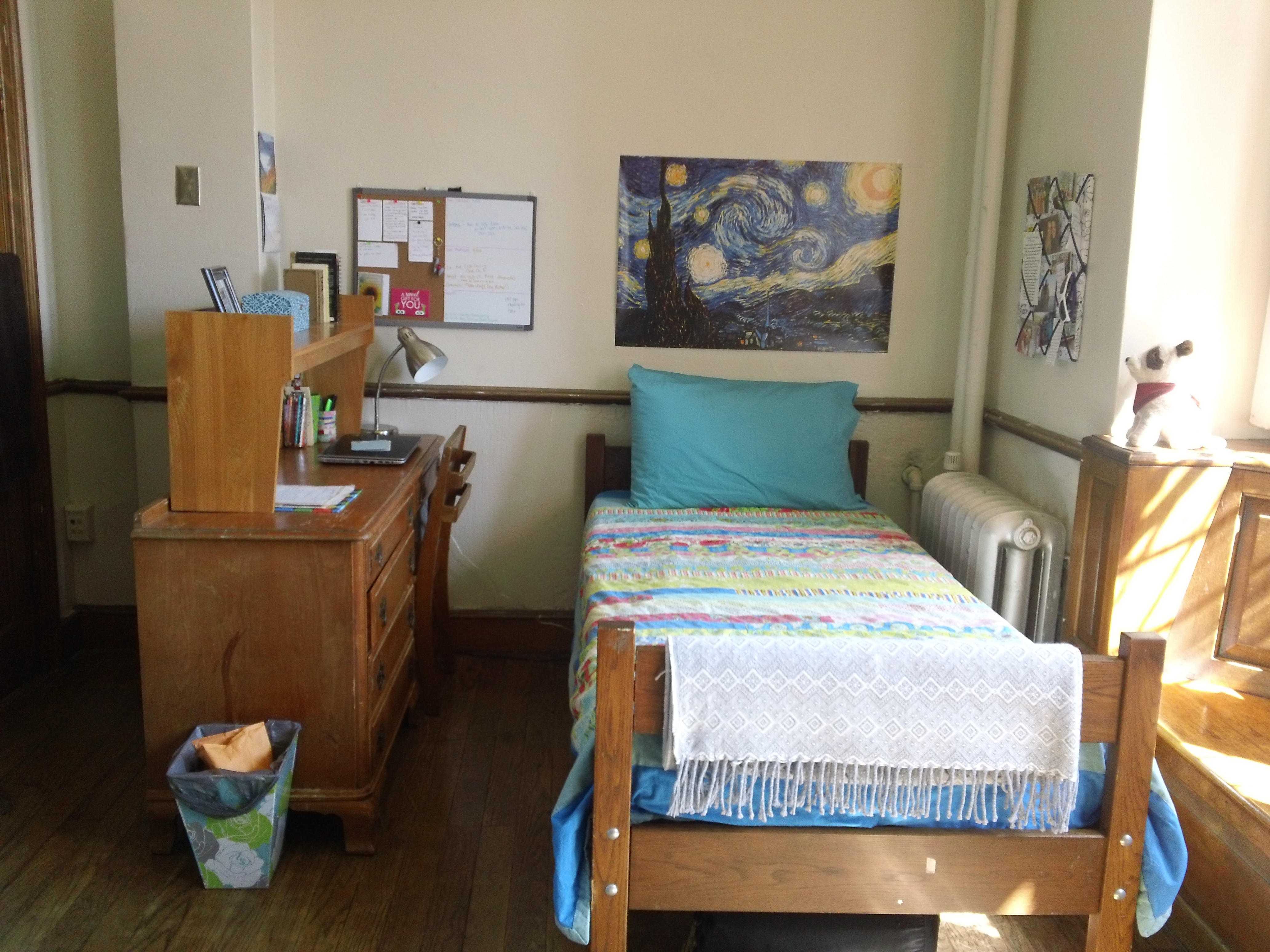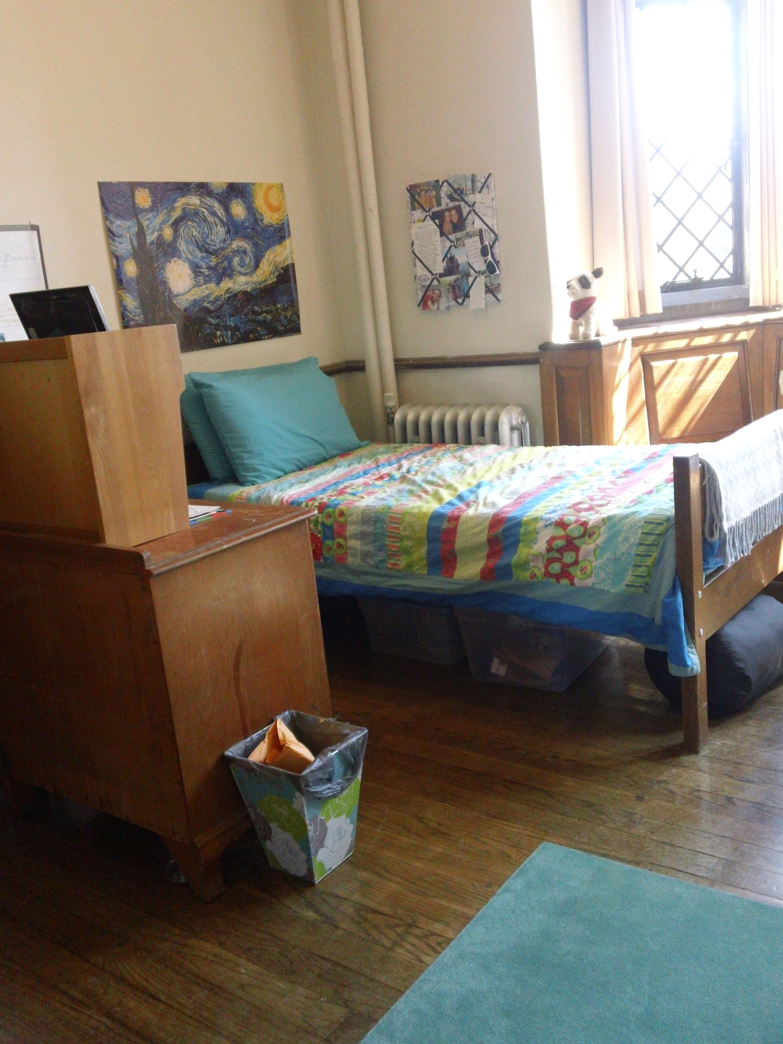 I am once again living in a dorm room on campus this year. As is typical with many campuses, the upperclassmen dorms are quite a bit nicer than most freshmen dorms. The building I am living in this year was built in the 1920s and is definitely older in style. All of the rooms have wood floors, old windows with lots of panes, and plenty of charm (and, of course, those little quirks that come with older buildings). No two rooms are the same, and my roommate and I definitely hit the jackpot. We have a huge window seat, windows that span almost the entire wall, high ceilings (the room directly above us is similar in size but has much lower ceilings, so this is definitely a plus), and it’s a pretty large room. In fact, it’s one of the nicest rooms I’ve seen in the building so far (a couple have their own bathrooms or fireplaces). So basically what I am saying here is that I love our room :).
