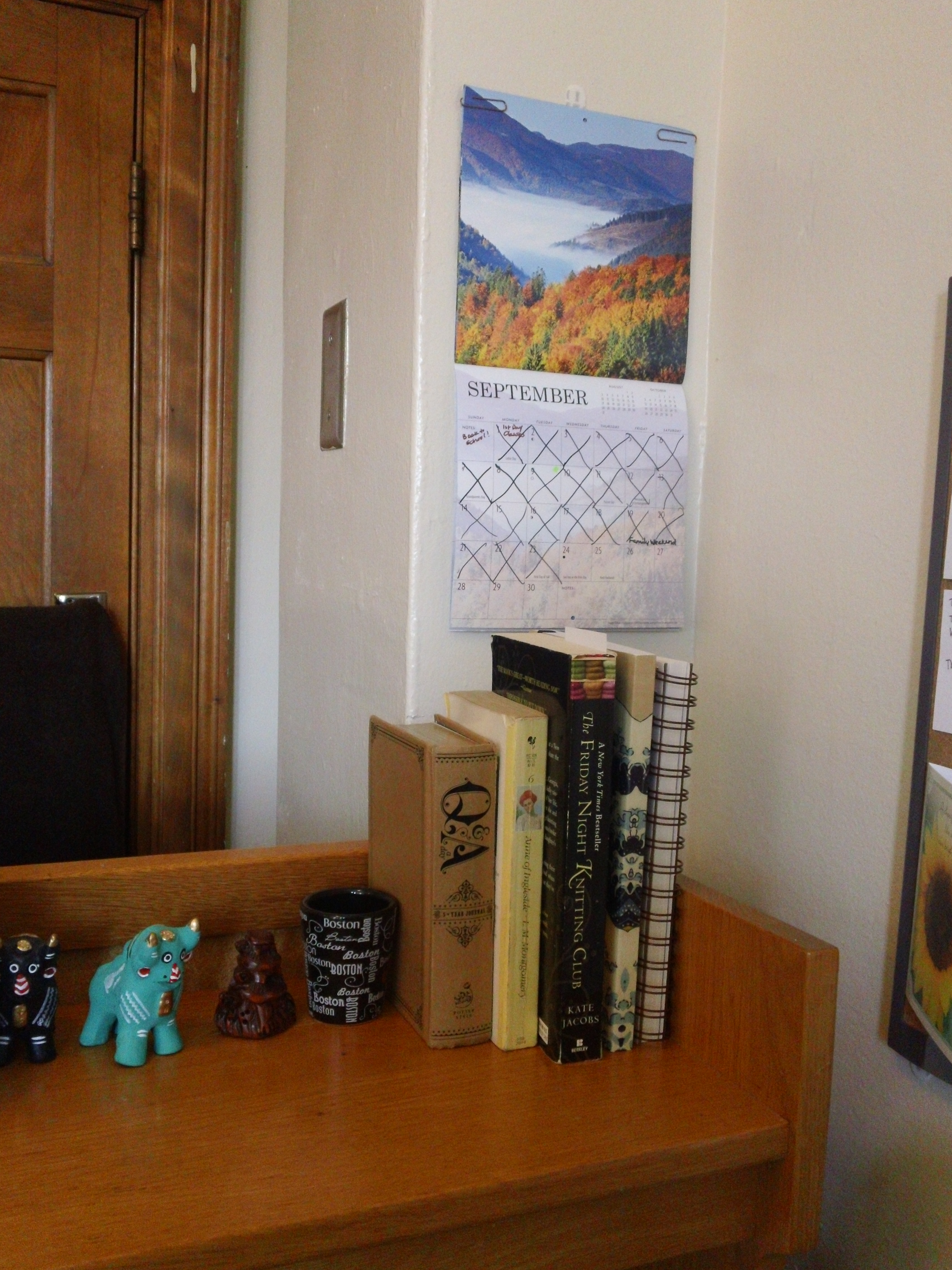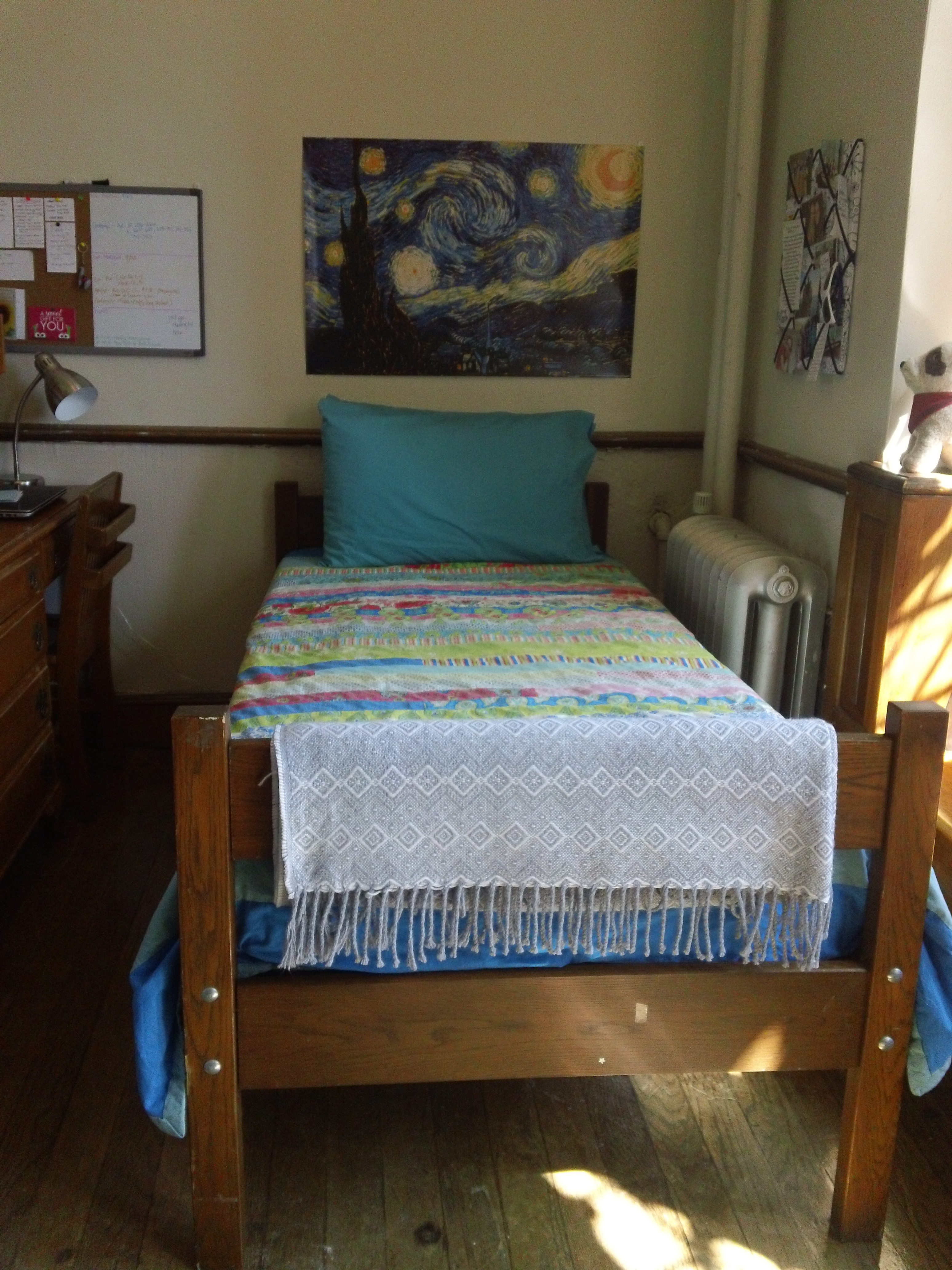 *Sources: the sheets are from Target, the pillowcases are from Walmart, I can’t remember what fabric I used when I made the quilt, turtles are from various vacations (Boston, Muir Woods in CA, Peru, and Rhode Island), ceramic bulls from Peru, all furniture provided by college, rug from Target.