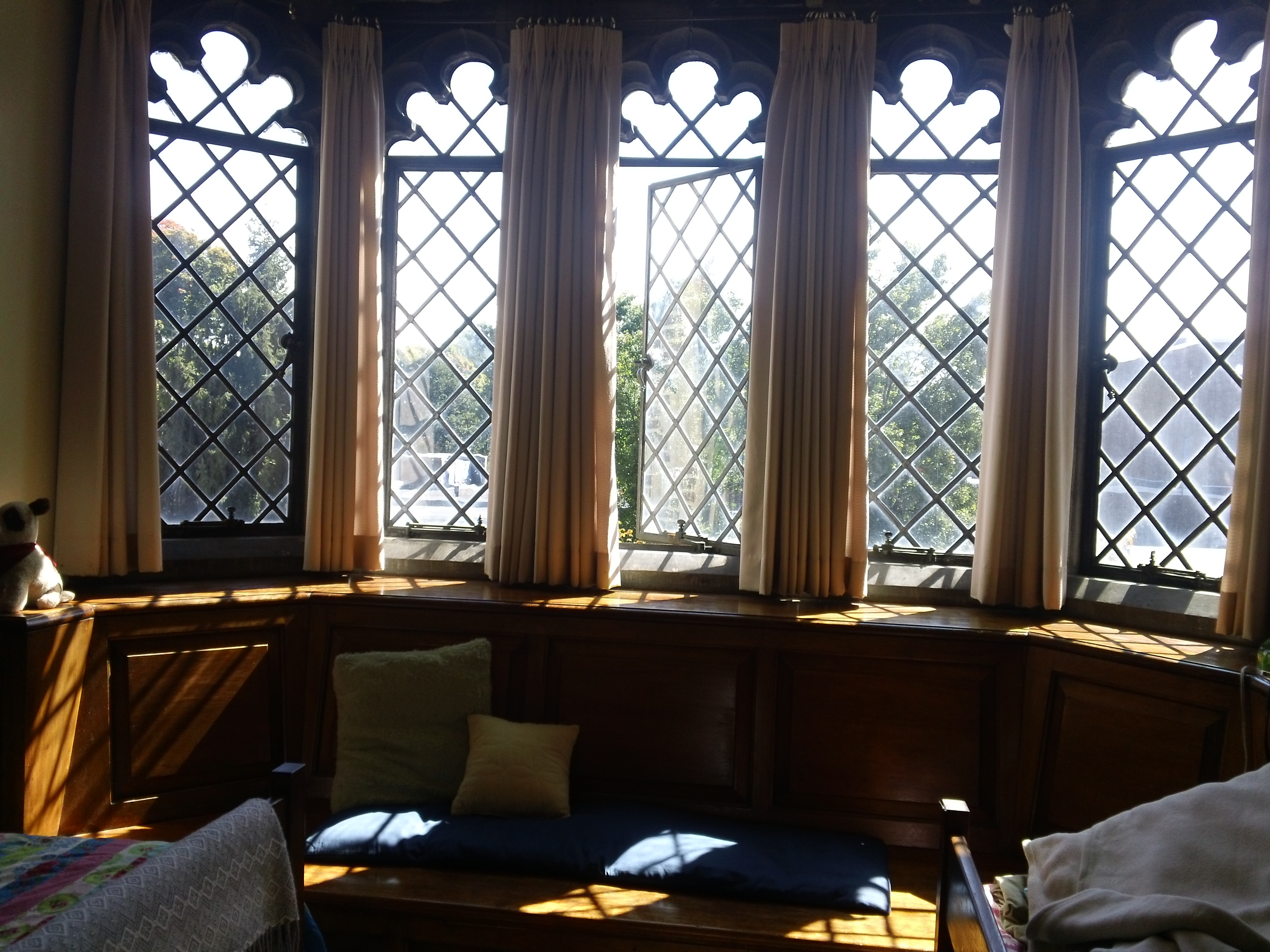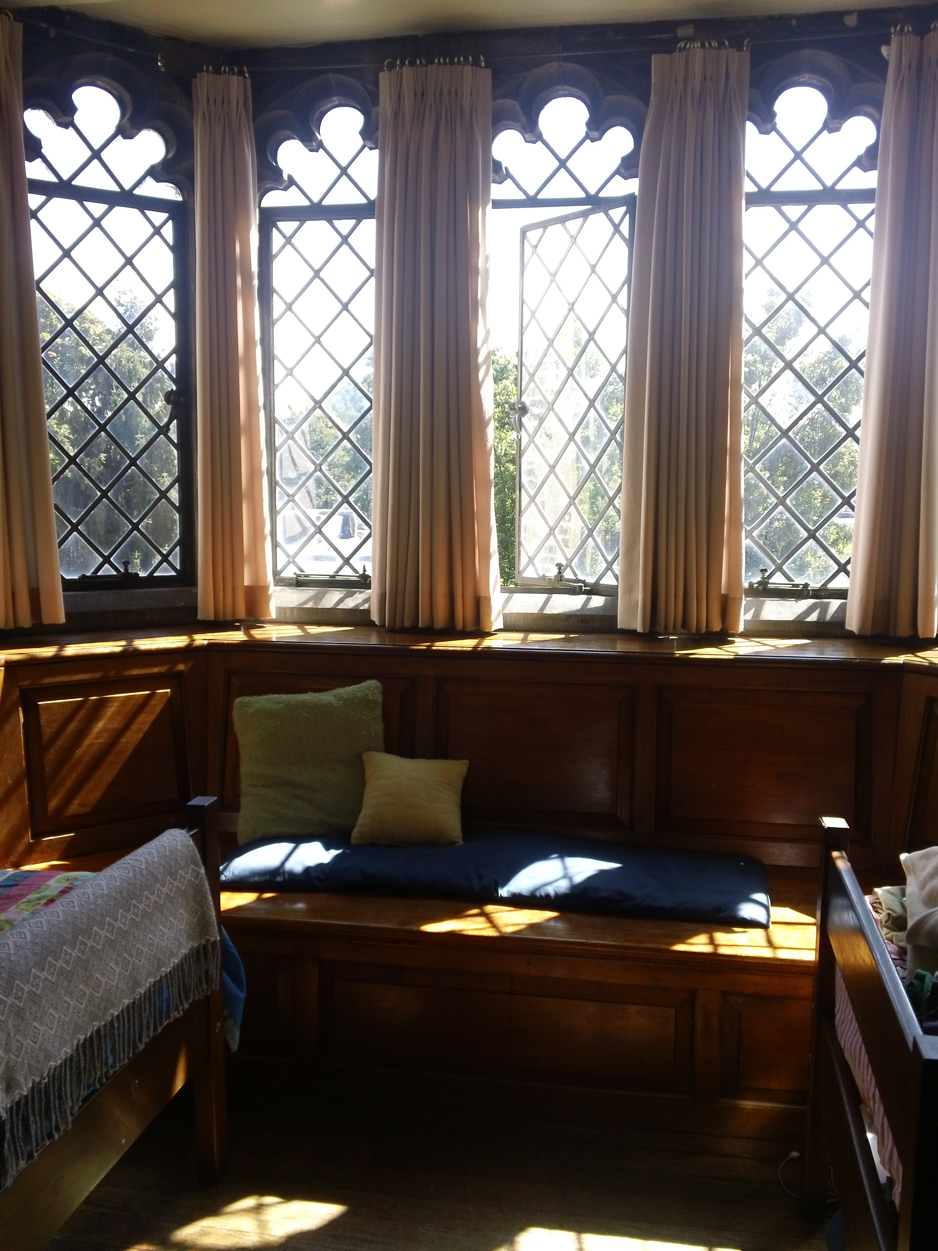 And here is the beautiful window seat and windows! We really need to get more pillows to make it a little comfortable. There’s a pretty deep ledge above the window seat, and that is where we actually sit most of the time. That way the sun shines right on you. The wood is very slippery, so we’re trying to figure out how to prevent our pillows from sliding right off.