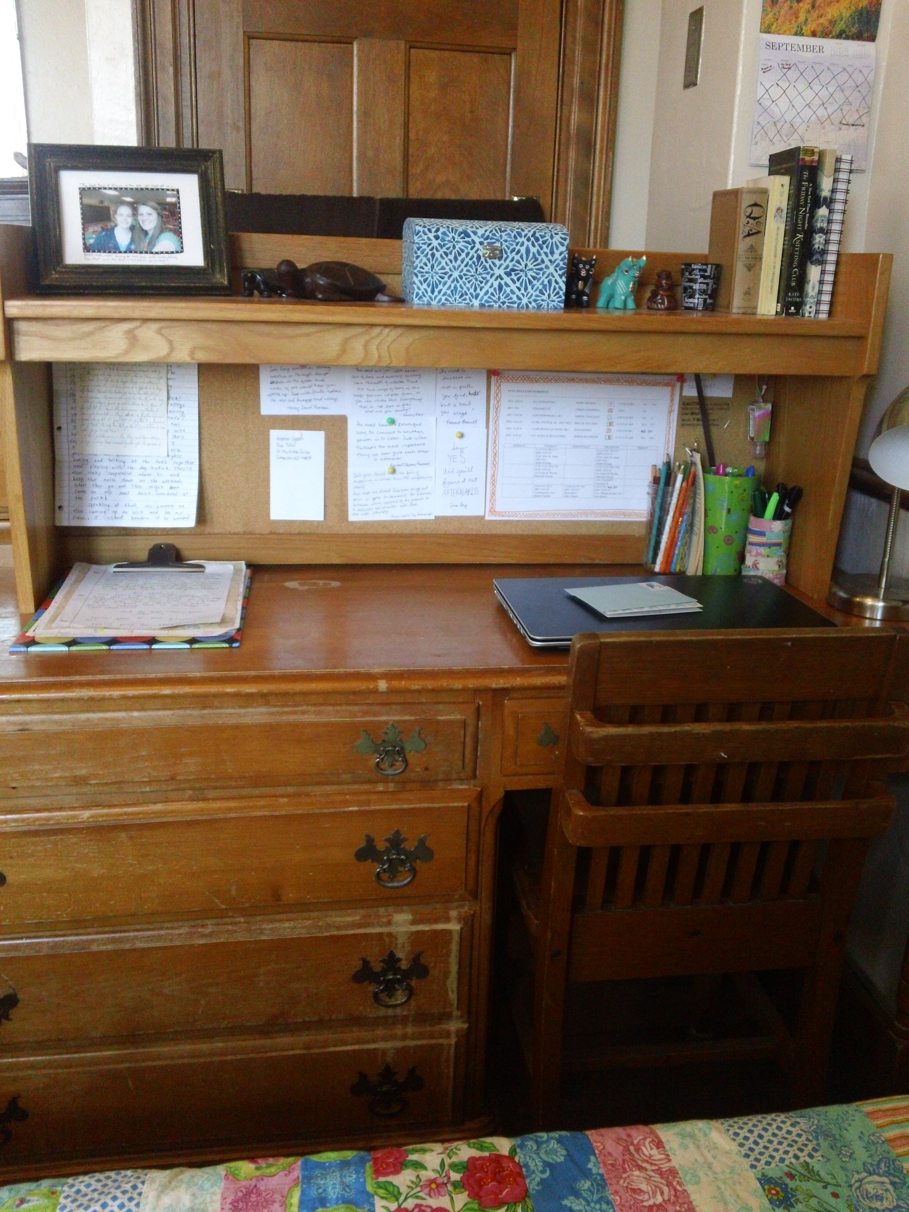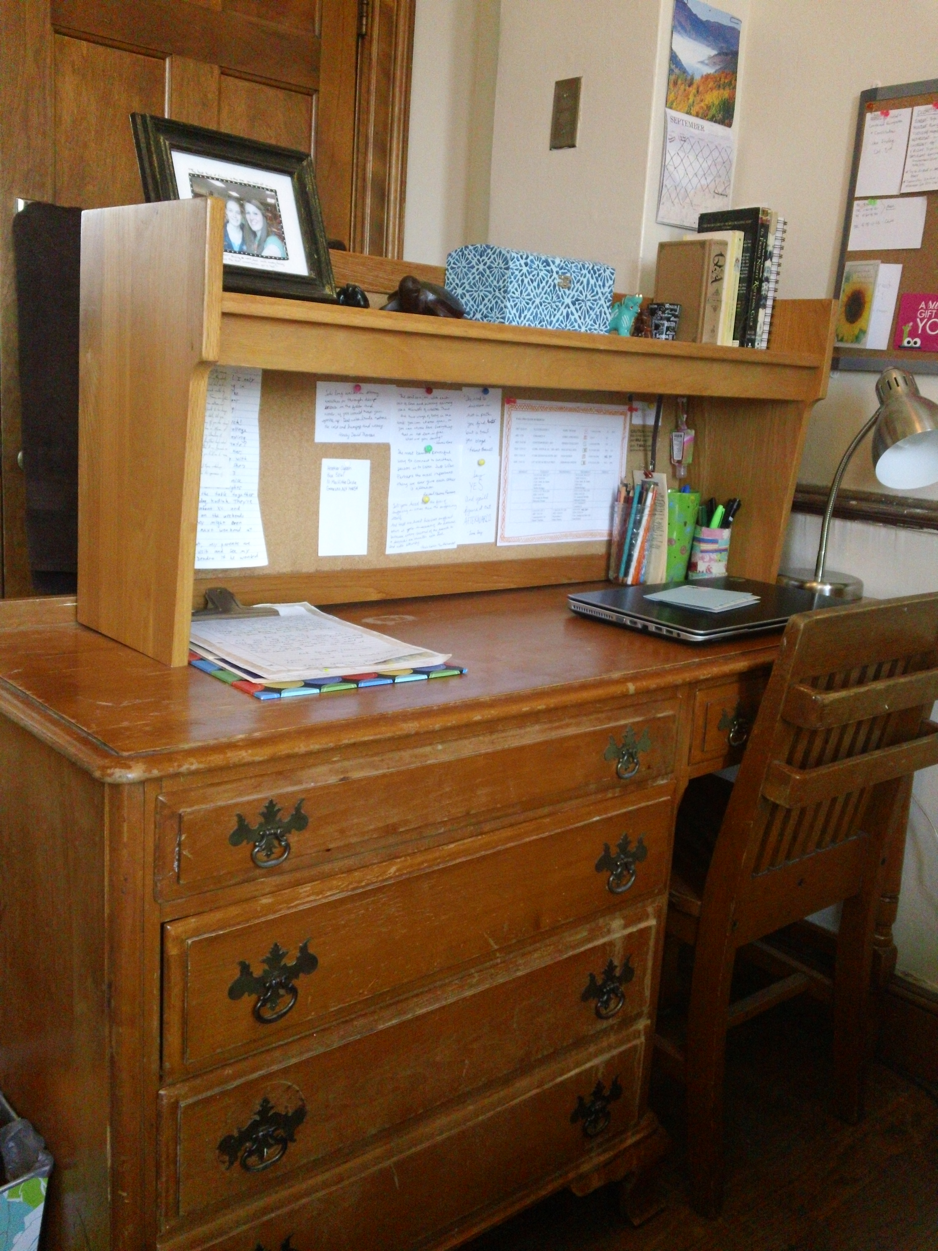 You can see how the desk fits next to the bed here. The hutch is not original to the desk, but very nice as it has a bulletin board that I have promptly filled up.