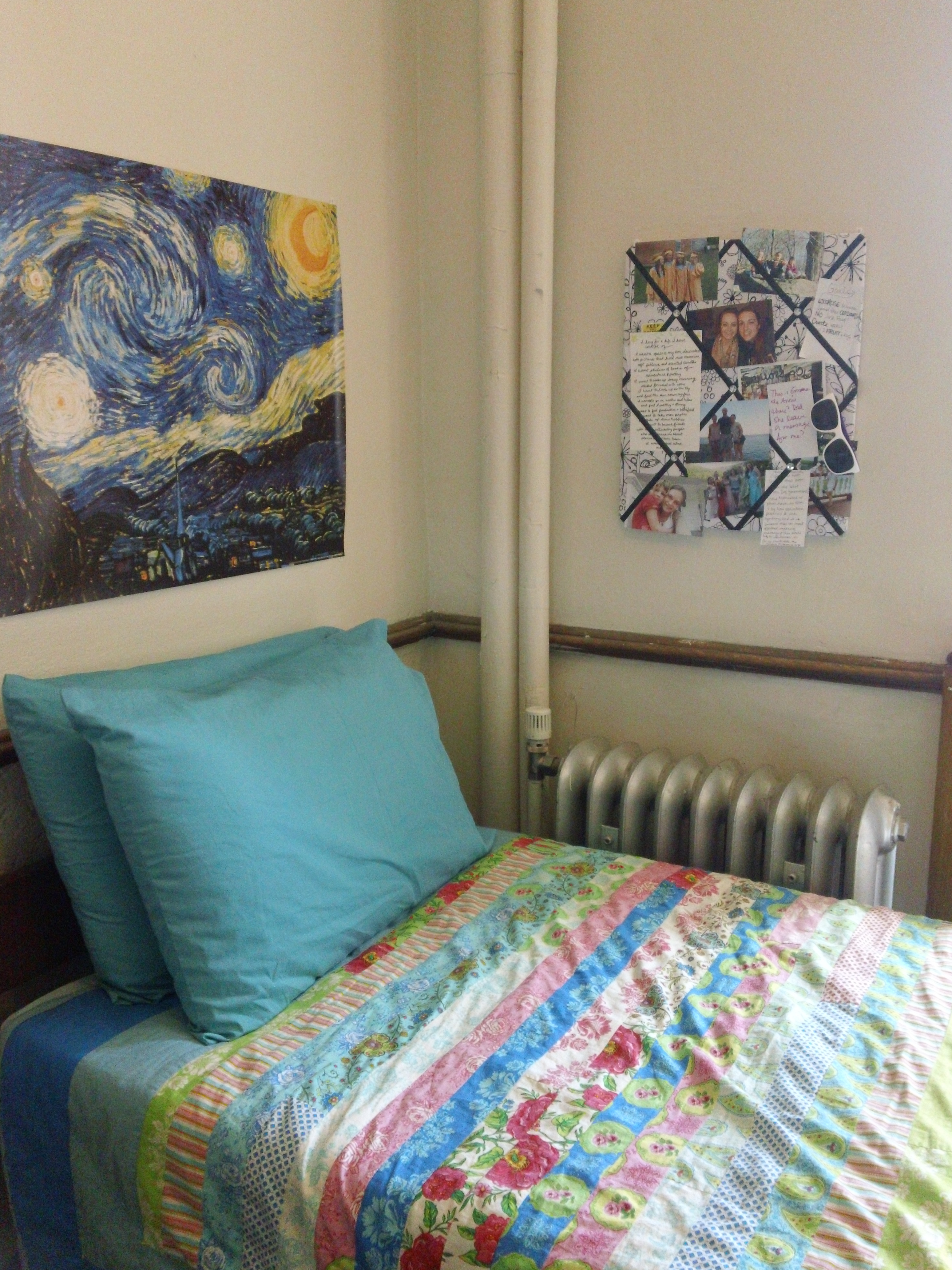 Above my bed is my Starry Night poster. I probably should have hung it up a bit higher since the ceilings are way higher than you can tell in this photo, but command strips are expensive, so it’s staying put. To the right is my memory board which is already filling up quickly.