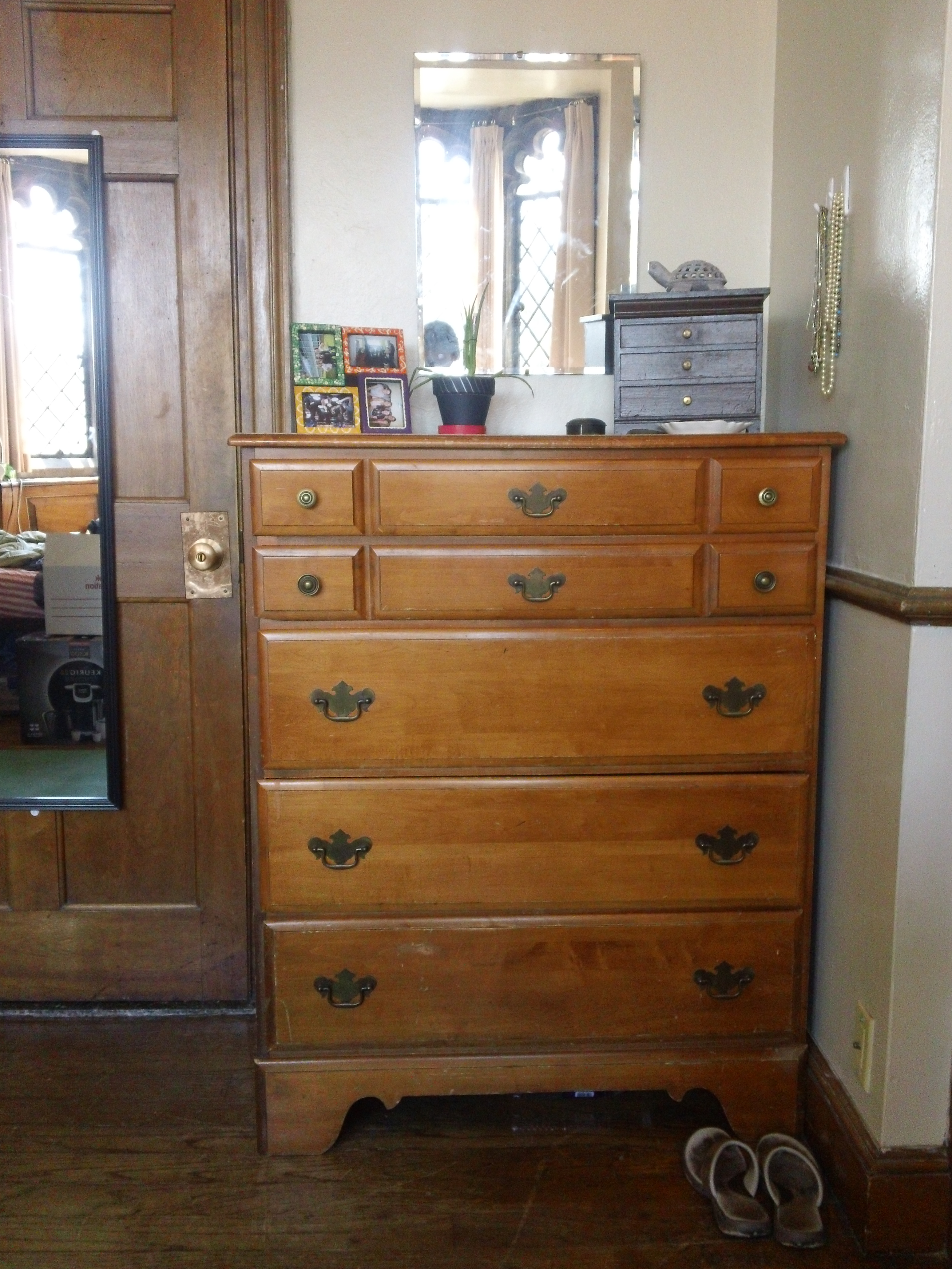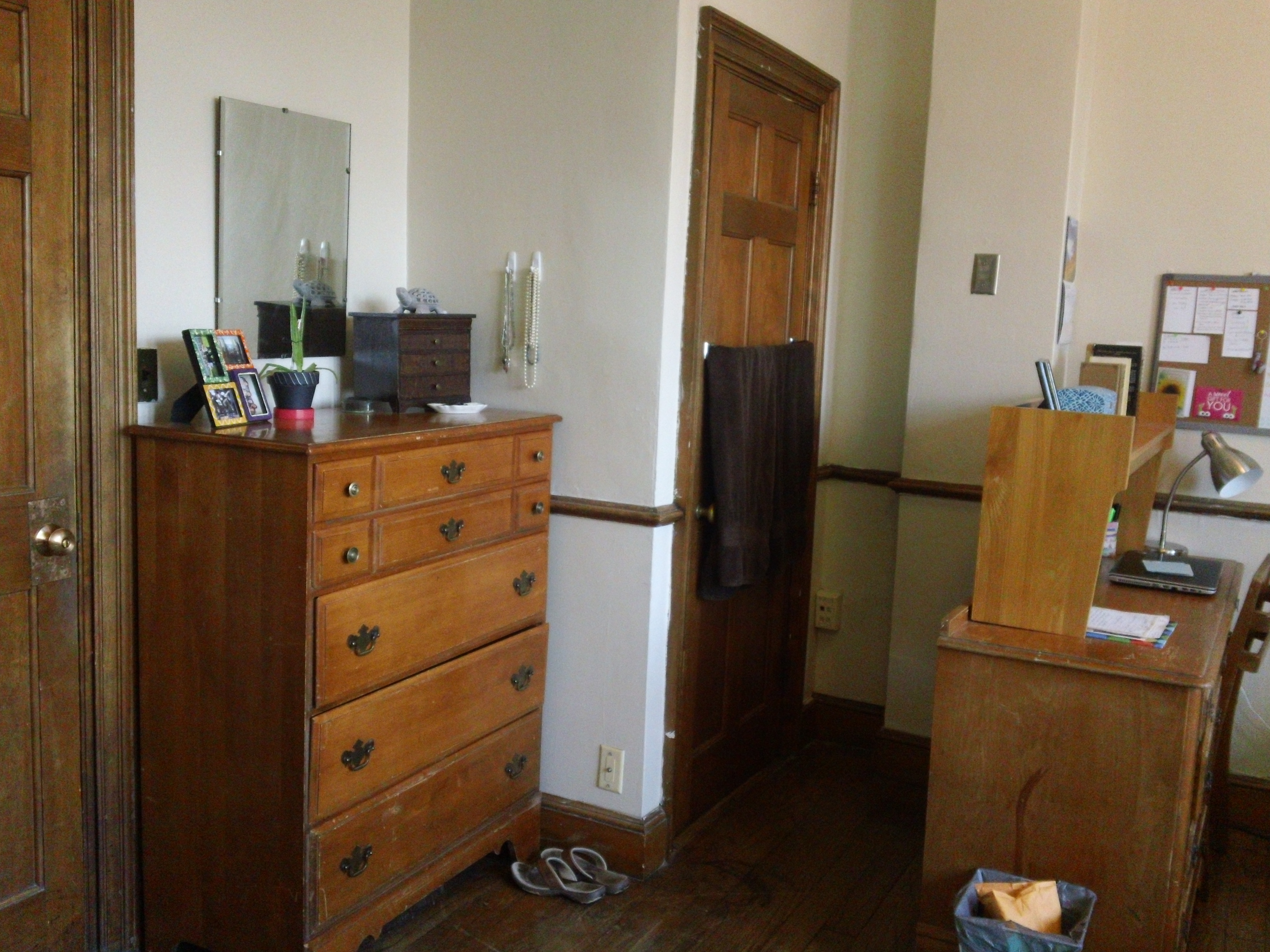 My dresser is to the right of the door and MUCH larger than other ones I have had at college. I had a lot of problems fitting all of my clothes in the closet/dresser last year, but actually have extra room this year. The mirror above the dresser was already there.