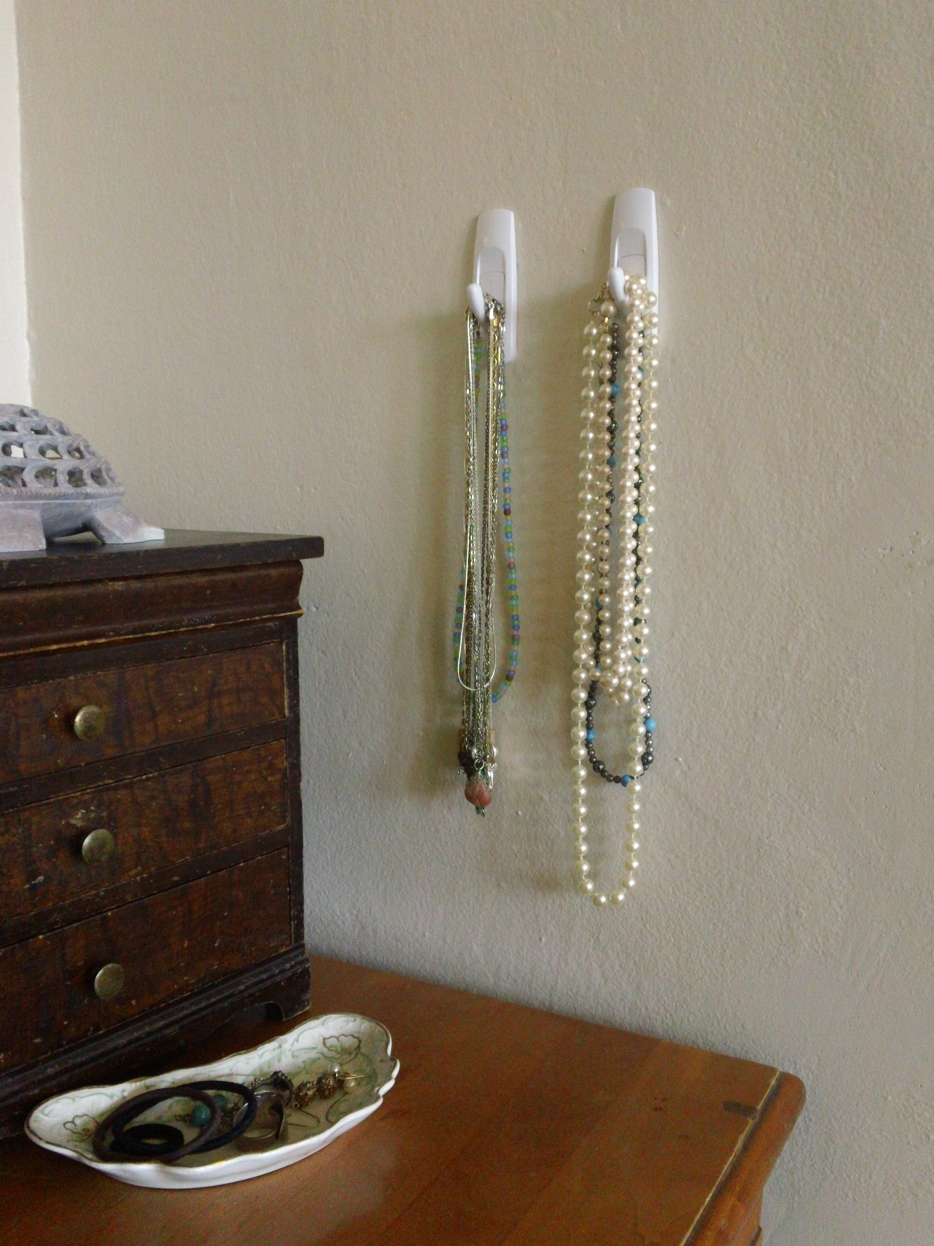 I store my necklaces on two command hooks to the right of my dresser. The rest of my jewelry is stored in the small bone dish and a heart-shaped container that used to be my mom’s.
