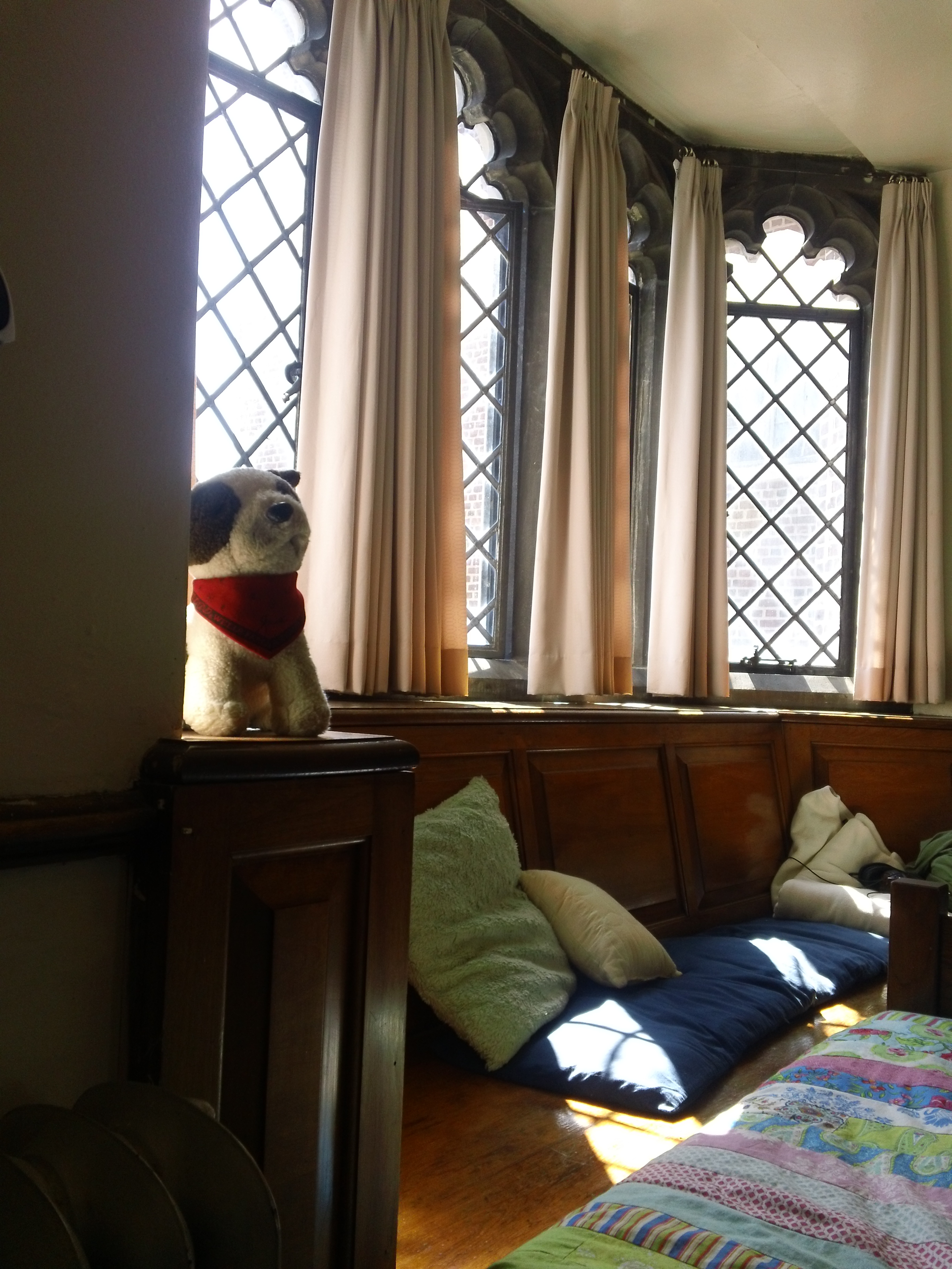 And…last but not least, my view from my bed! It really does make me happy every time I see it! Also, see the little puppy sitting on the ledge? He’s pretty much the only stuffed animal I’ve ever really cared about (there’s also Spikey, the teddy bear, that I left at home). His name is Jack and this is his first time at college. I realized that sometimes you just need a stuffed animal to cuddle with, so I decided to bring him along. He’s a little worse for wear (he’s missing an eye and his nose had to be reattached a long time ago because my real dog chewed it off), but he’s still in pretty good shape.