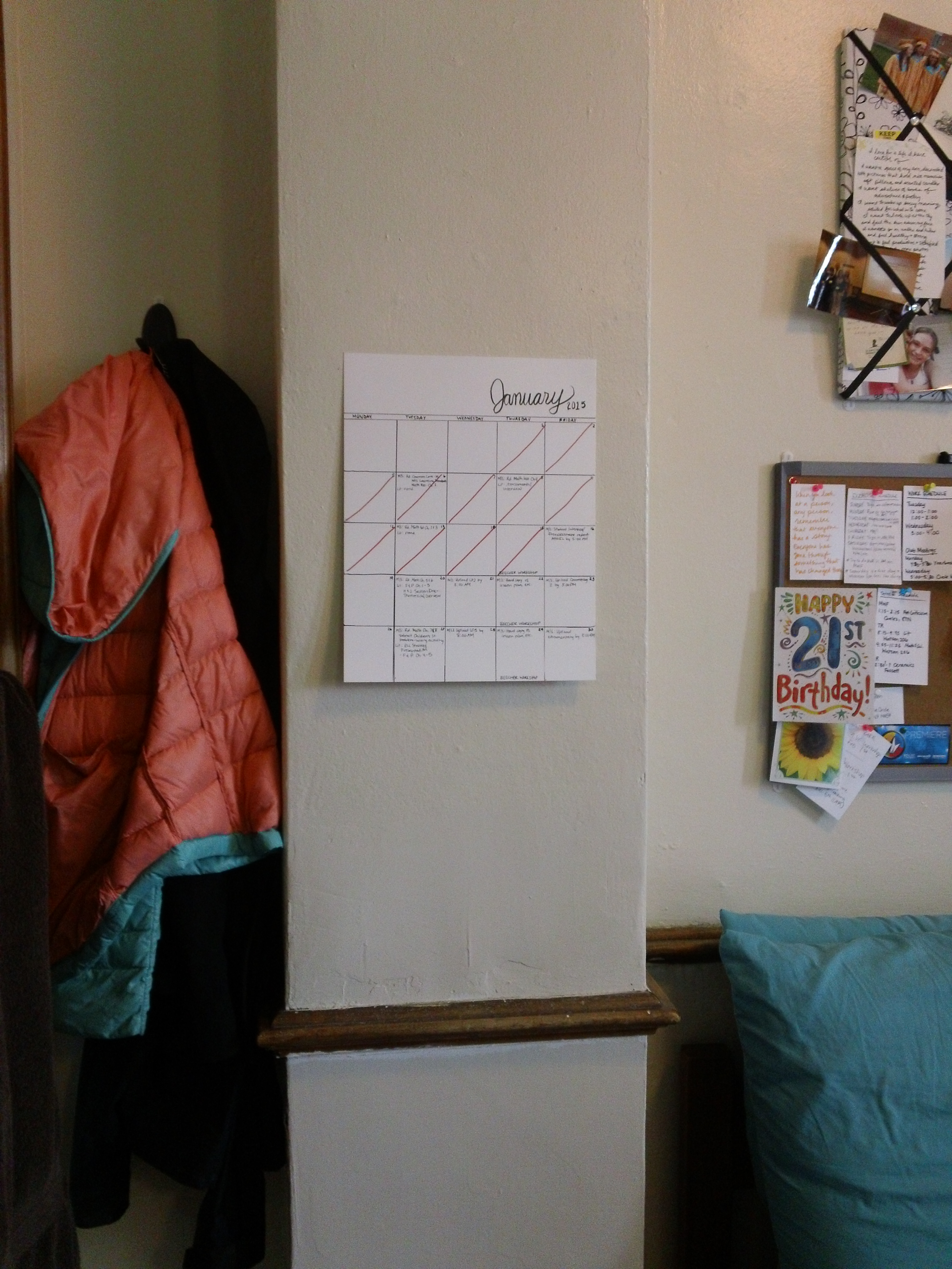 I know I’ve shown photos of my junior year dorm room already, but we moved the room around a few months ago and I also changed up the walls a bit, so I decided I’d share the new-and-improved space. In November, when the heat finally kicked on, we decided that we probably shouldn’t have our beds next to the old radiators. The radiators get very hot to the touch and my roommate actually burnt her hand on hers one night while she was sleeping, so it just didn’t seem very safe. I tried several ways of rearranging the room, but ultimately settled on just switching the bed and the desk. It took a little getting used to, but I actually think I like it this way better. It seems much more open.