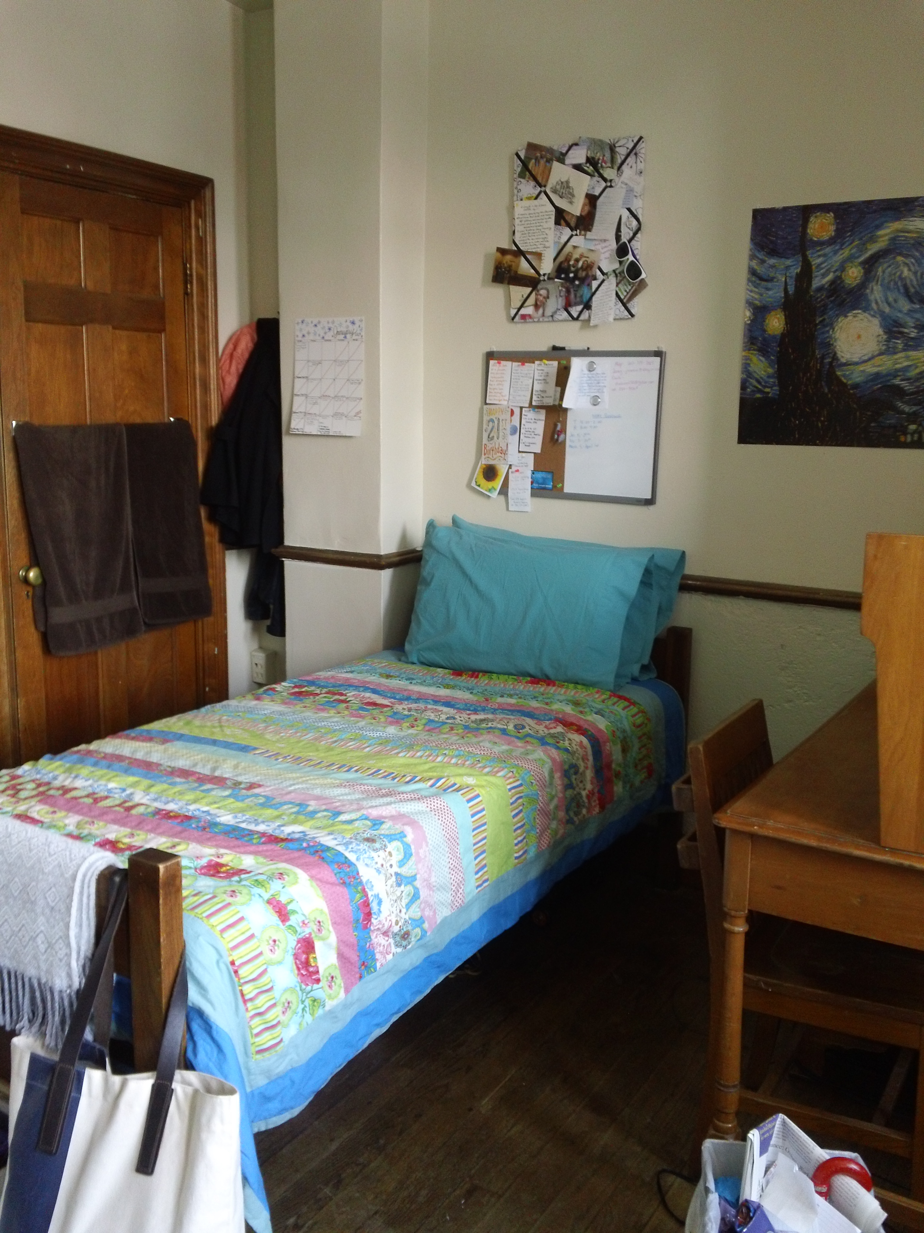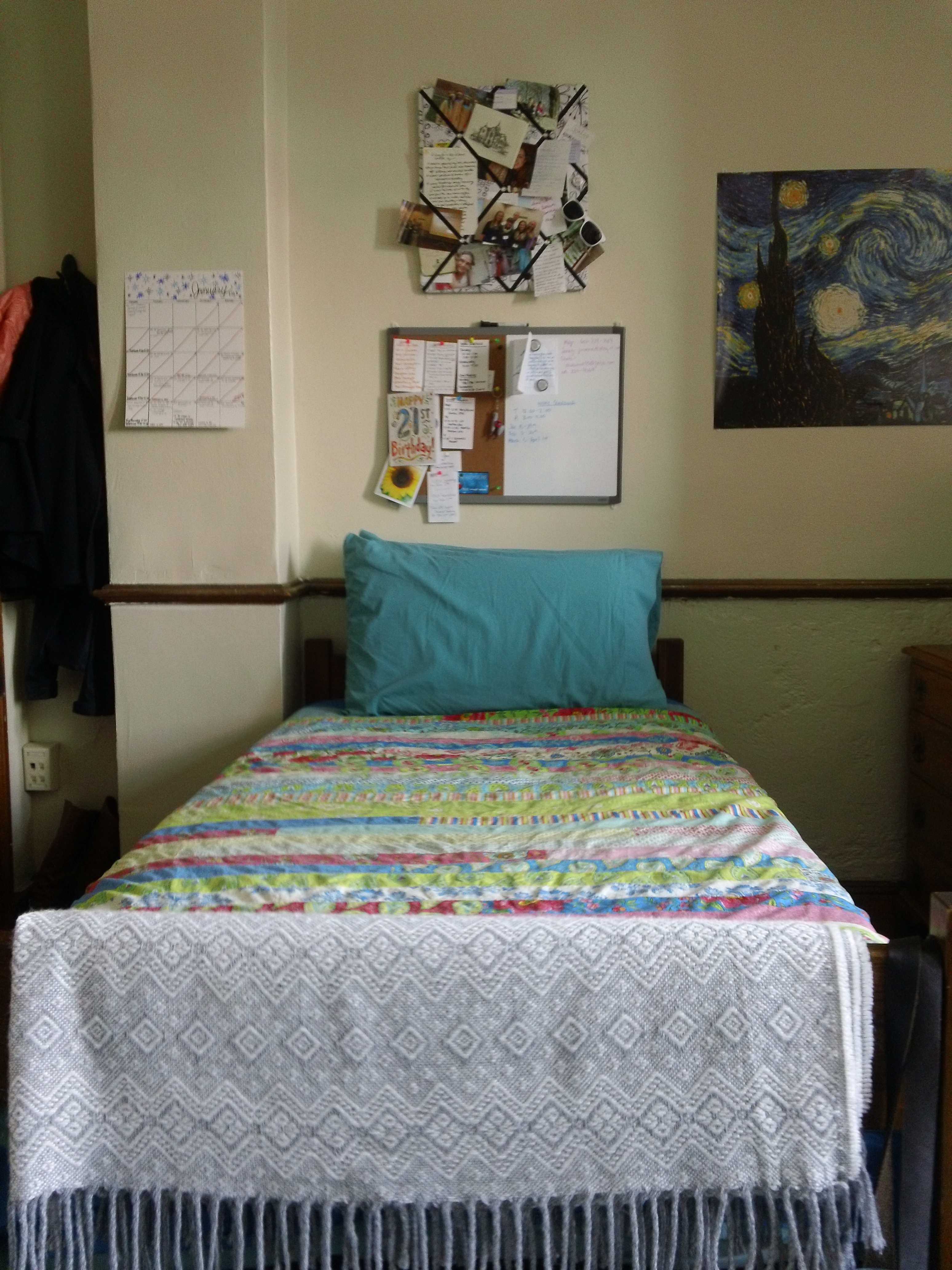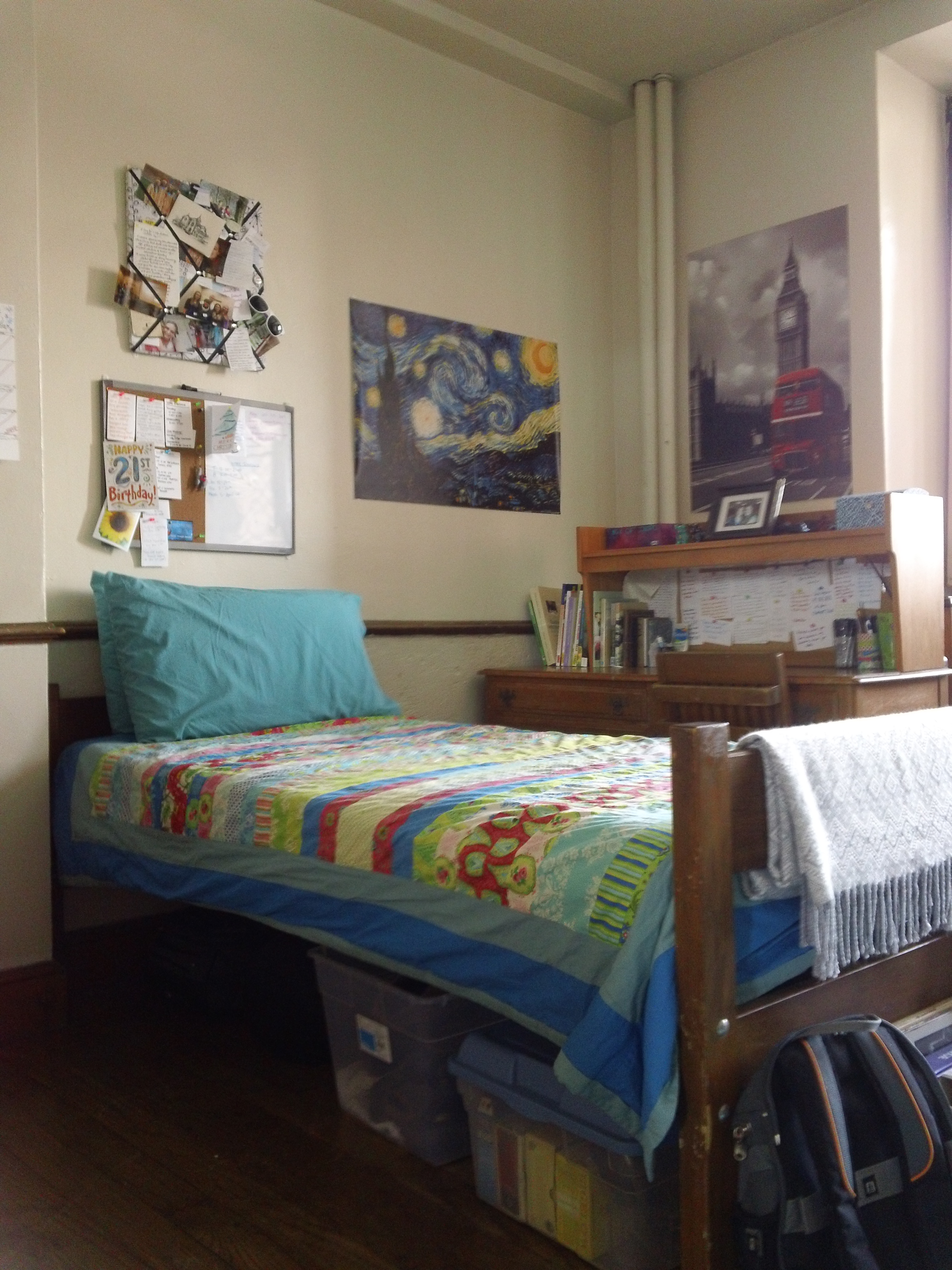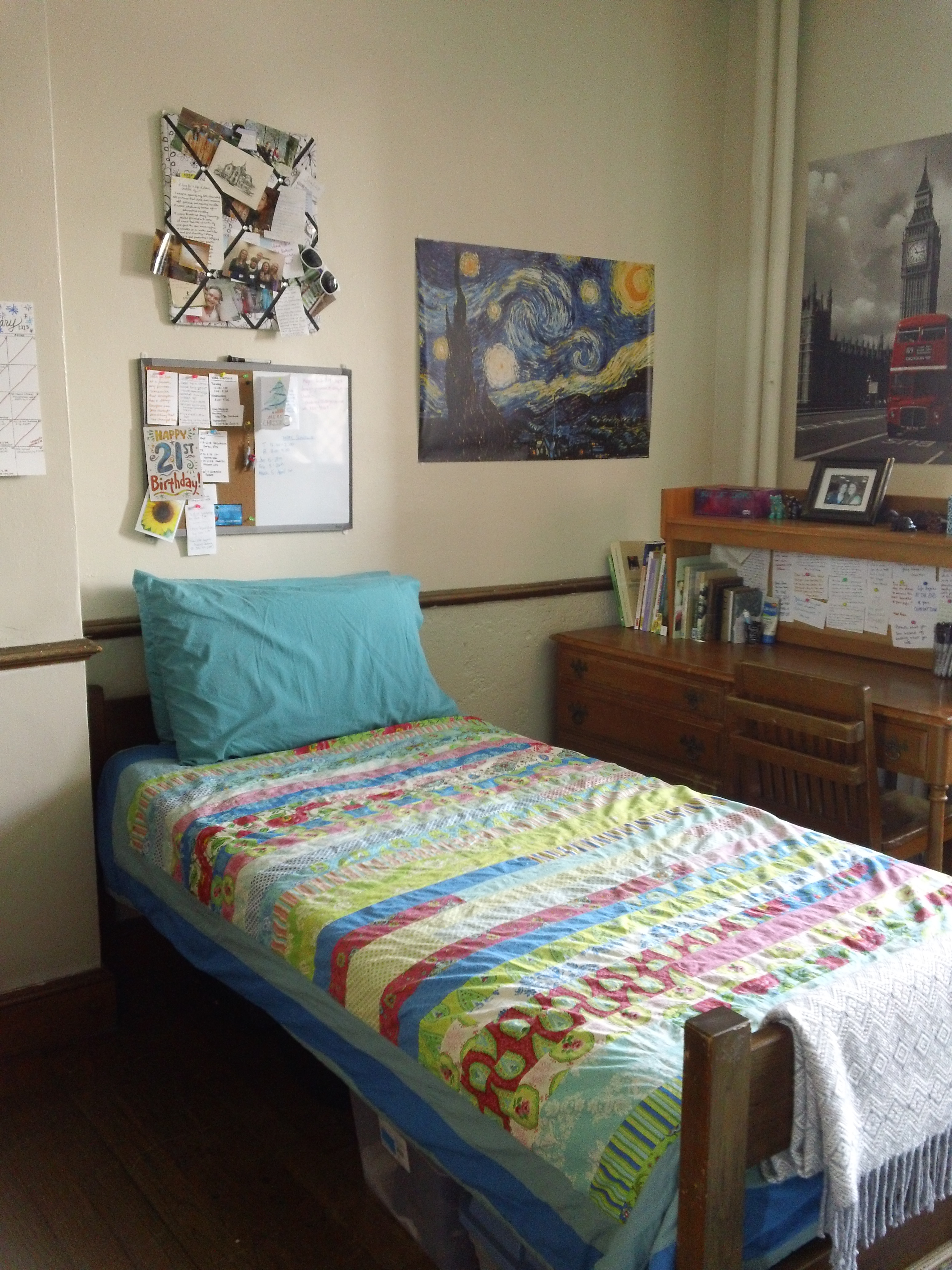 So there it is! My rearranged dorm room. As I said in the original post, I really love my room this year. The windows do get pretty cold in the winter because they aren’t insulated and they don’t appear to be sealed very well, but it is totally worth the amount of sunshine we get all throughout the day.