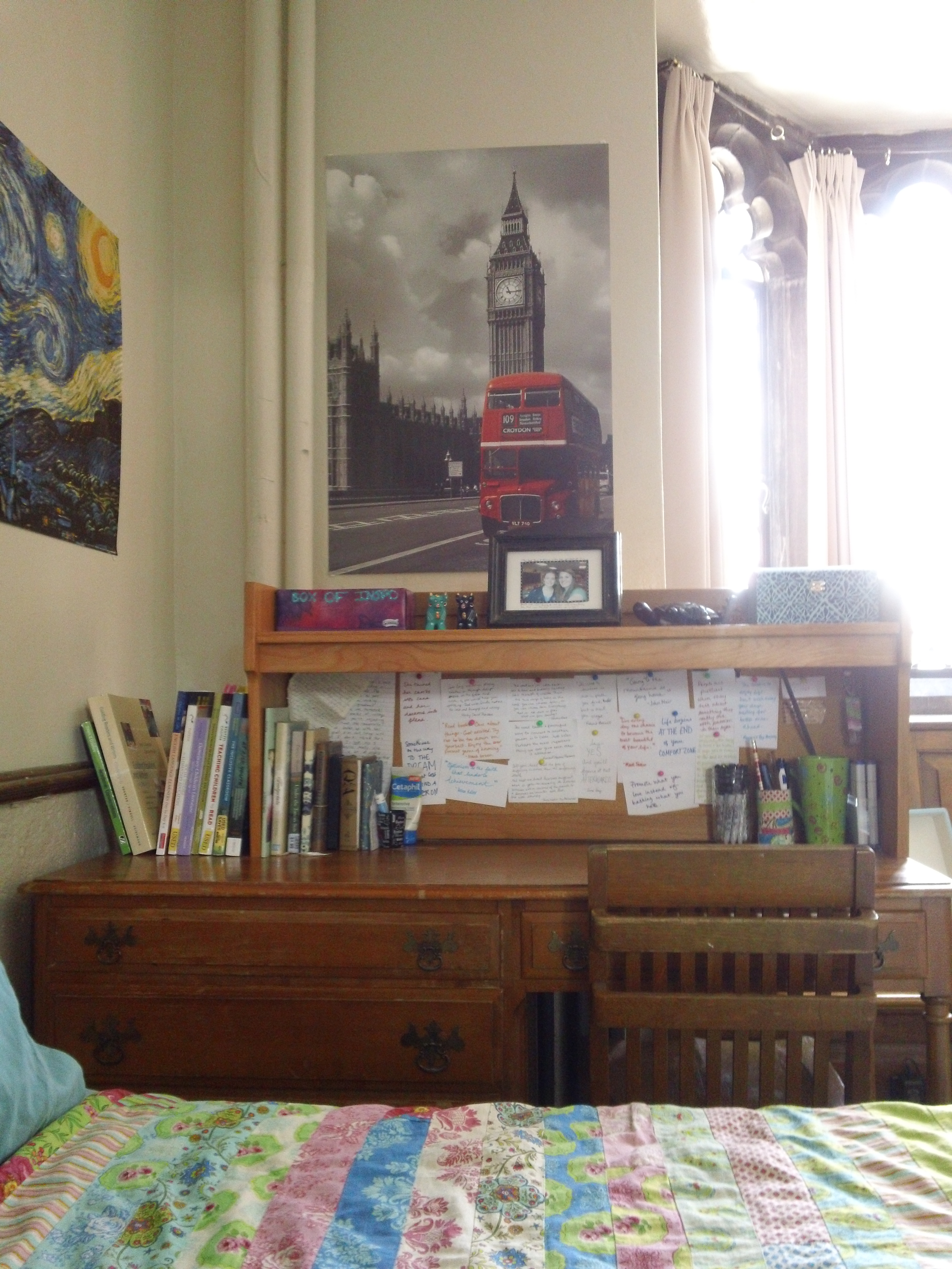 I also put up my Big Ben poster. I’ve had it forever (my brother gave it to me for Christmas one year), but hadn’t put it up yet this year in my dorm. Our room is now very British (my roommate has a British flag, London collage frame, and London artwork on her side of the room). I keep all of my textbooks to the left of the hutch and all of my journals/books for fun on the inside of the hutch.