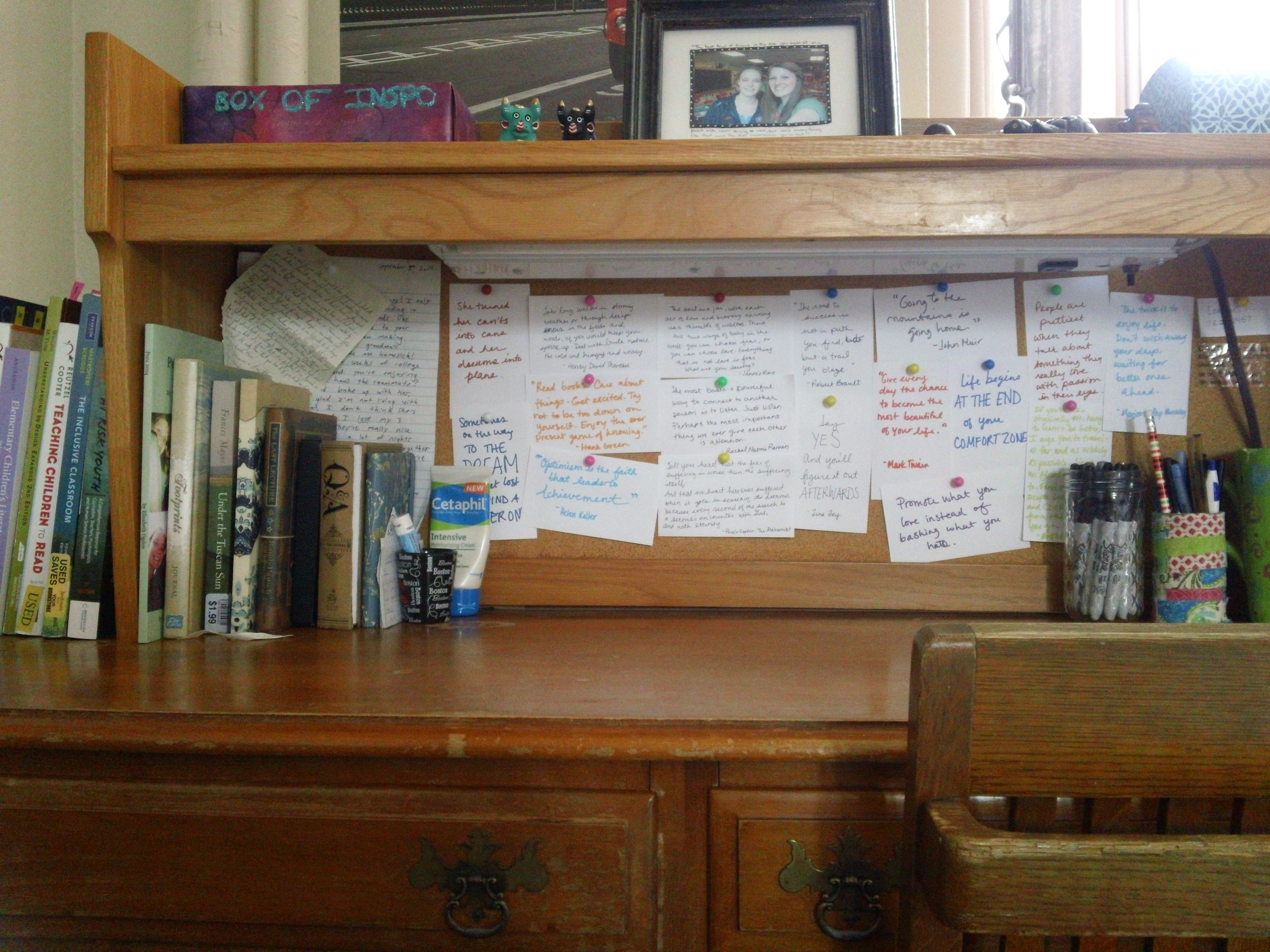 I moved my Starry Night poster up and over a bit and moved my memo board (the one with the ribbon) above my bulletin board/white board. I like that I can put pictures, cards, and other mementos in a place that’s easier to see and enjoy. My monthly calendar (mostly just for assignments) dresses up the post to the left of the bed.
