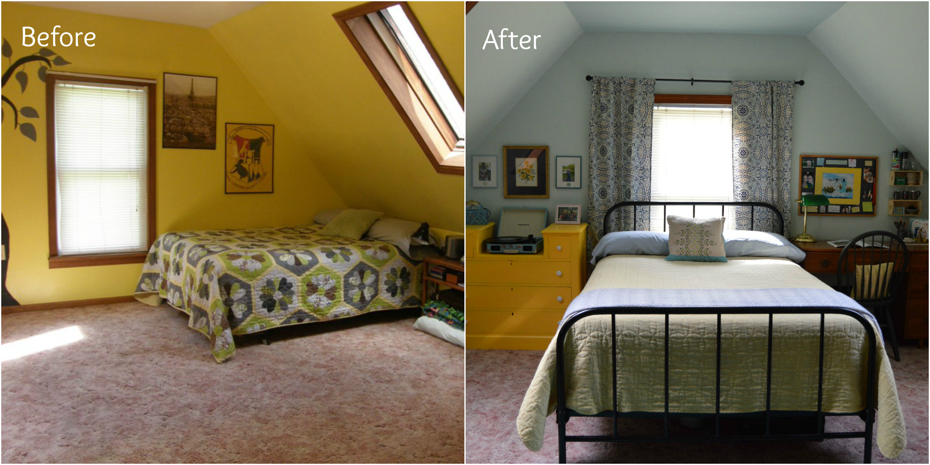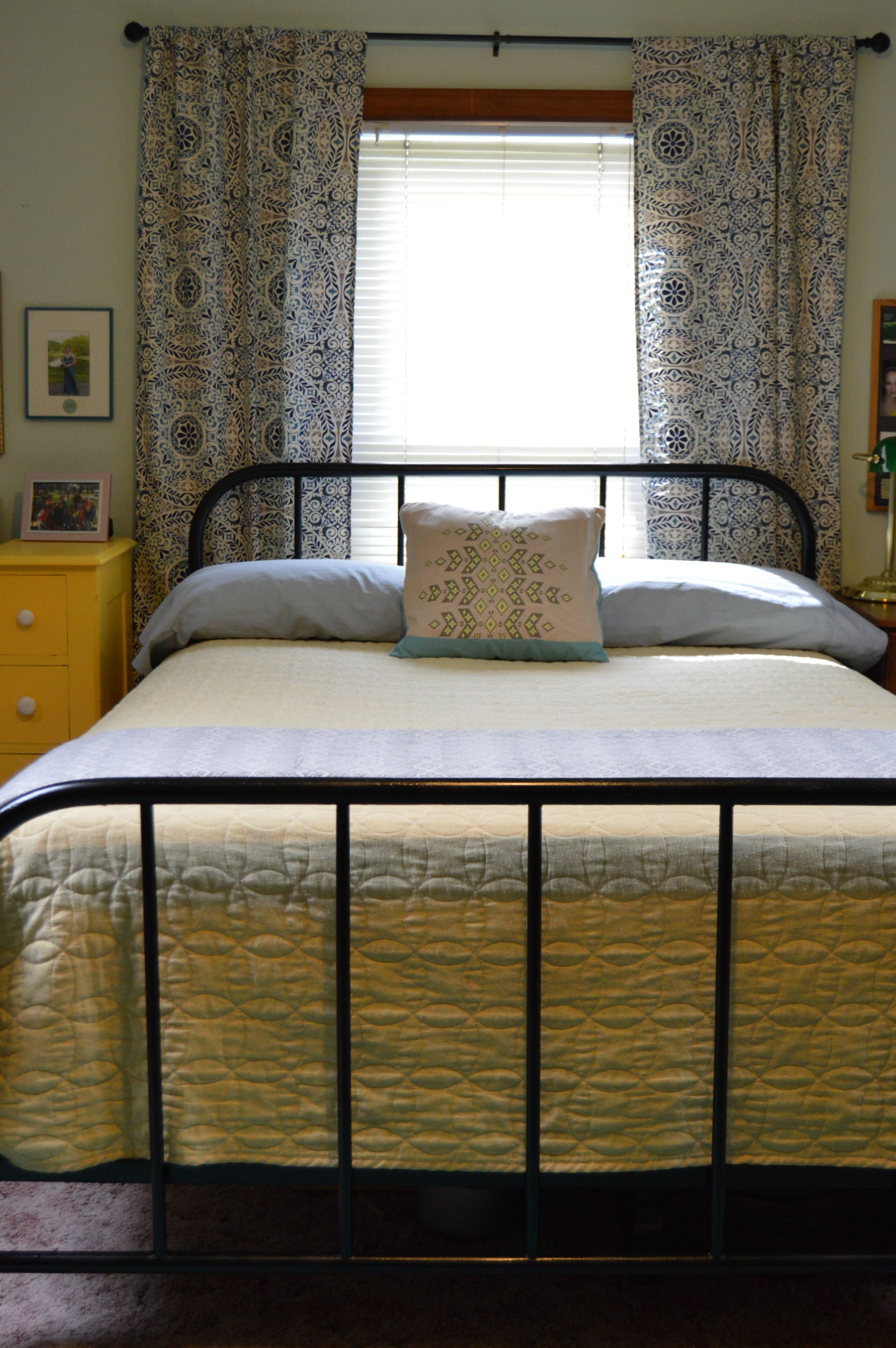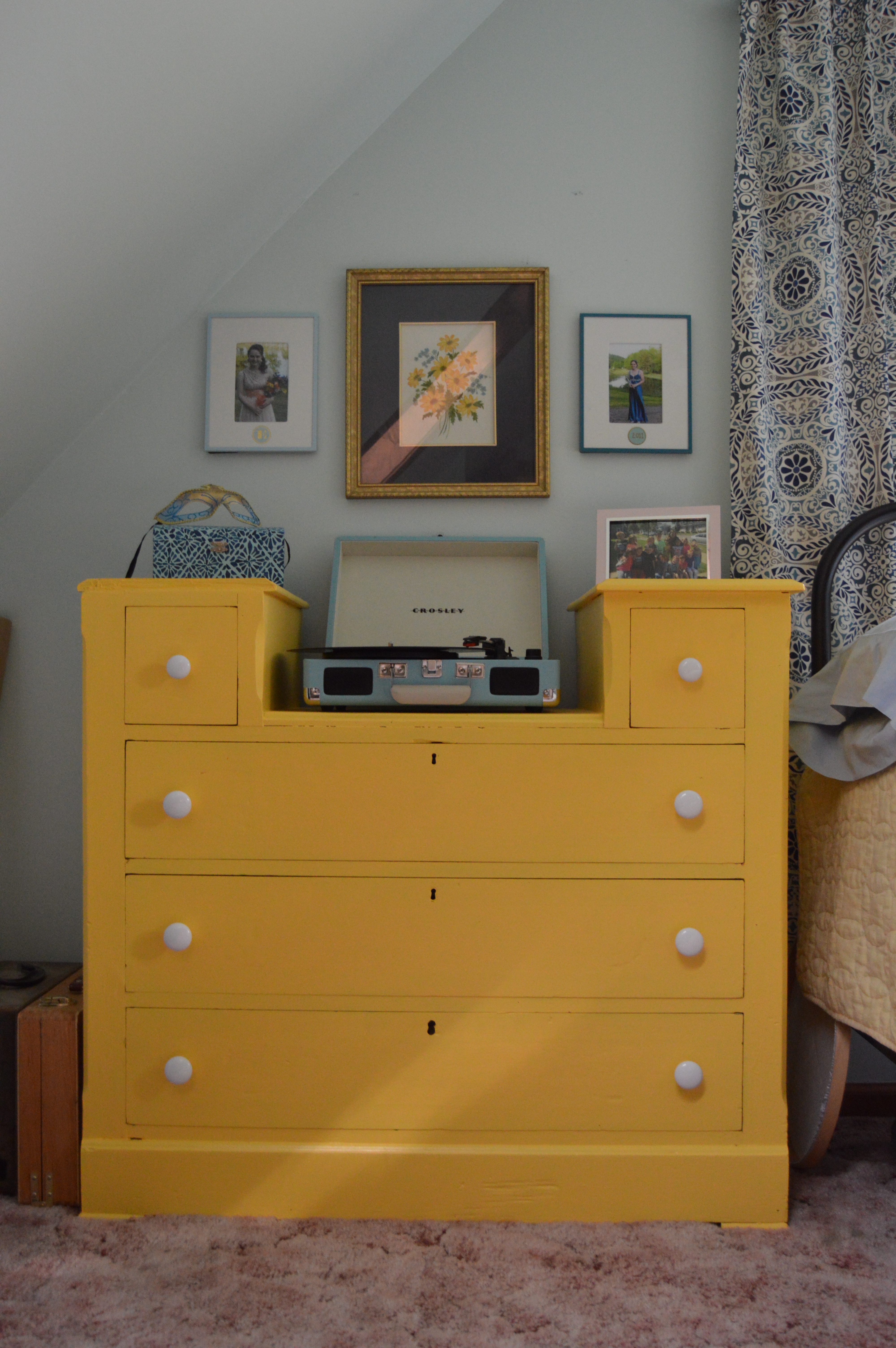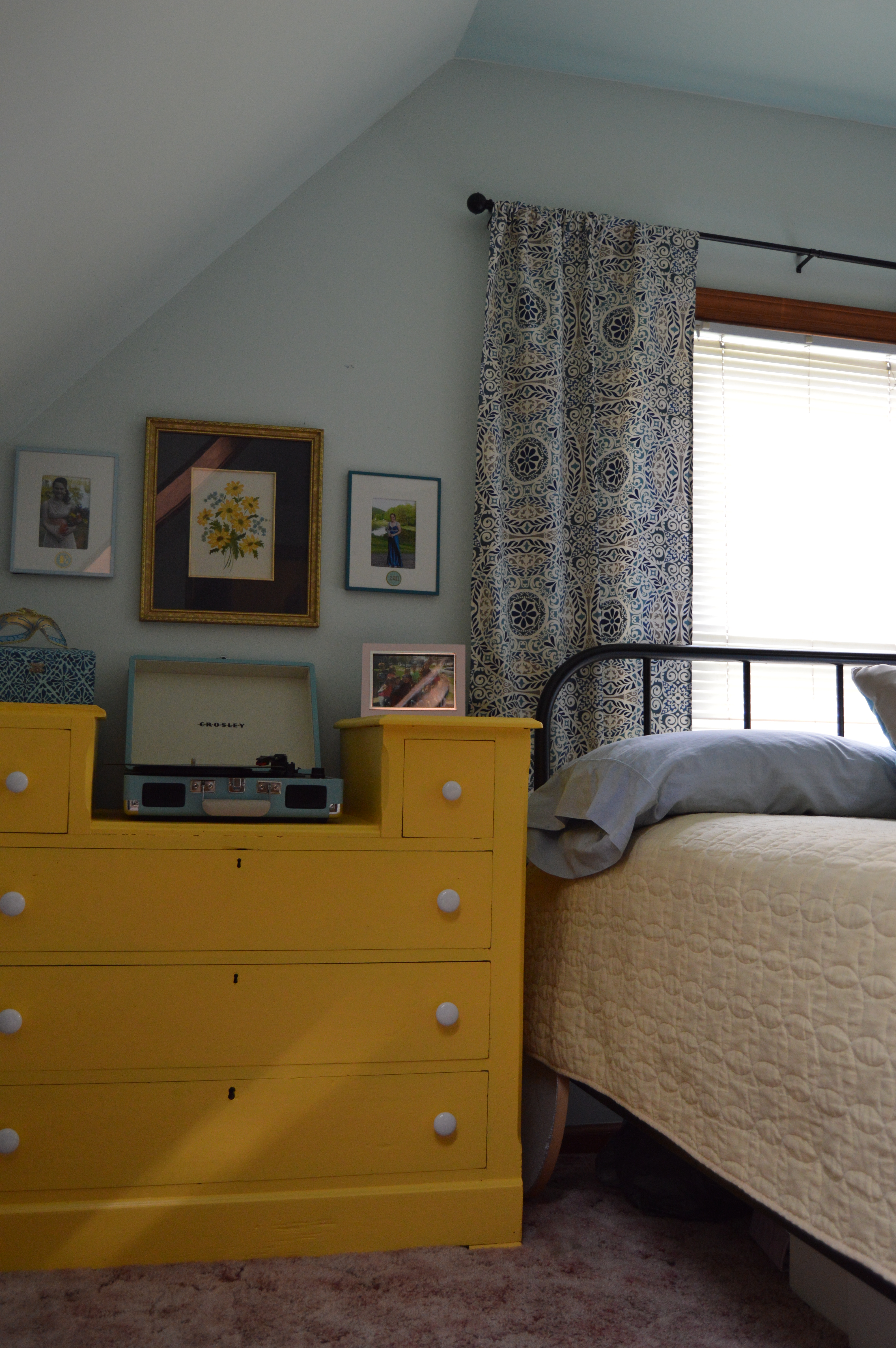 I am so, so happy with how the room turned out (even if it took me two years to finish!). The best part is that I spent very little on the transformation. I think all in all, including paint, the room cost under $200. The biggest expenses were on paint for the walls and ceiling, spray paint for the bed, and paint and knobs for the yellow dresser. The only other things I purchased were a few yard sale frames, a curtain rod ($3 from Dollar General!), and fabric for curtains (maybe $15 on clearance).