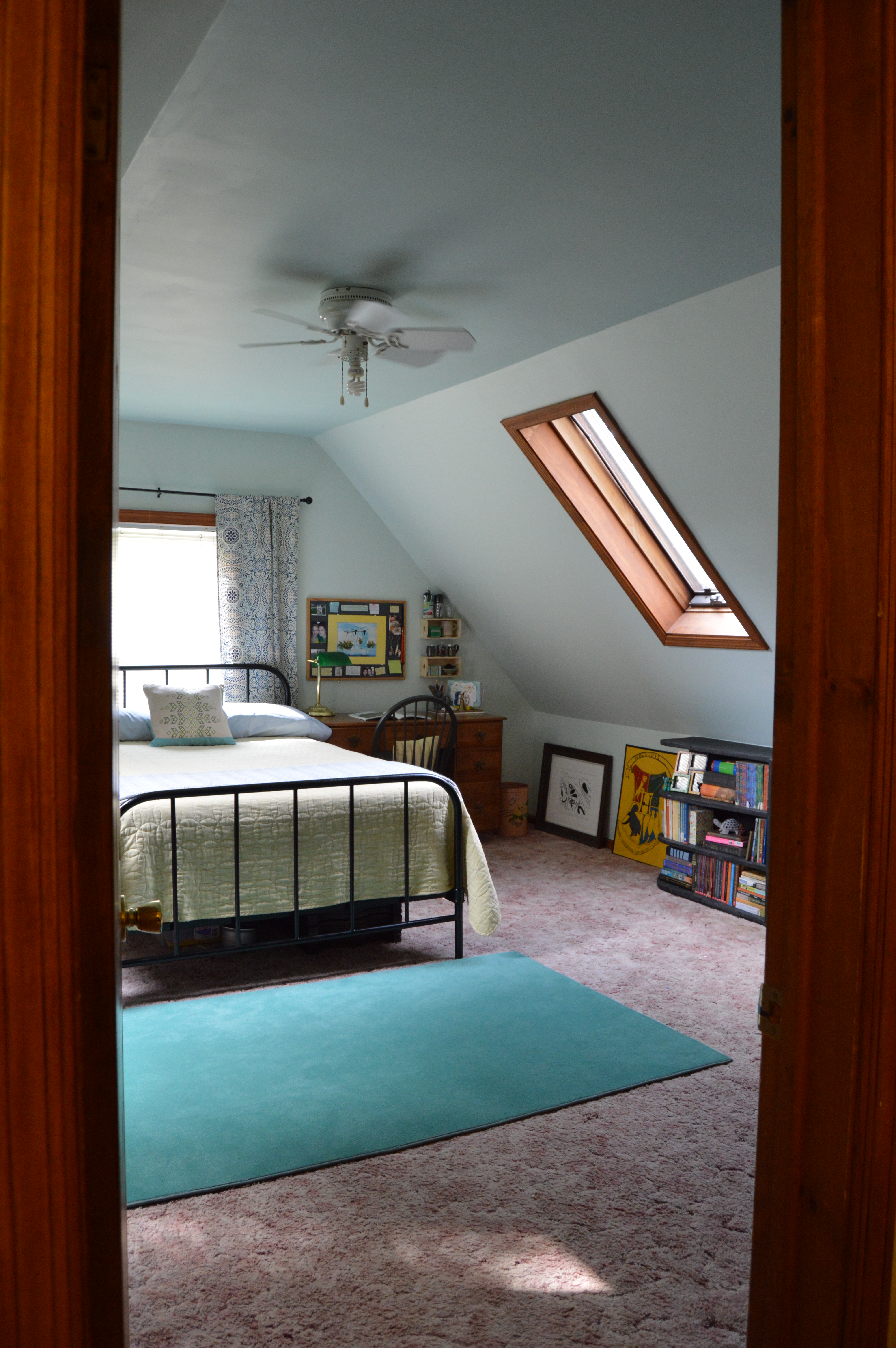 This is the view of the room as you enter from the hallway. Instead of nightstands on either side, I utilized the flat wall (there are only 2 in the room) by placing a desk on one side and a small dresser on the other. You can also see the ceiling in this photo. Because the ceiling is such a narrow strip, I didn’t want it to stand out. I considered painting it the same color as the walls, but thought that might be a bit much of one color, so I painted the ceiling a shade darker than the walls. I really like how it looks.