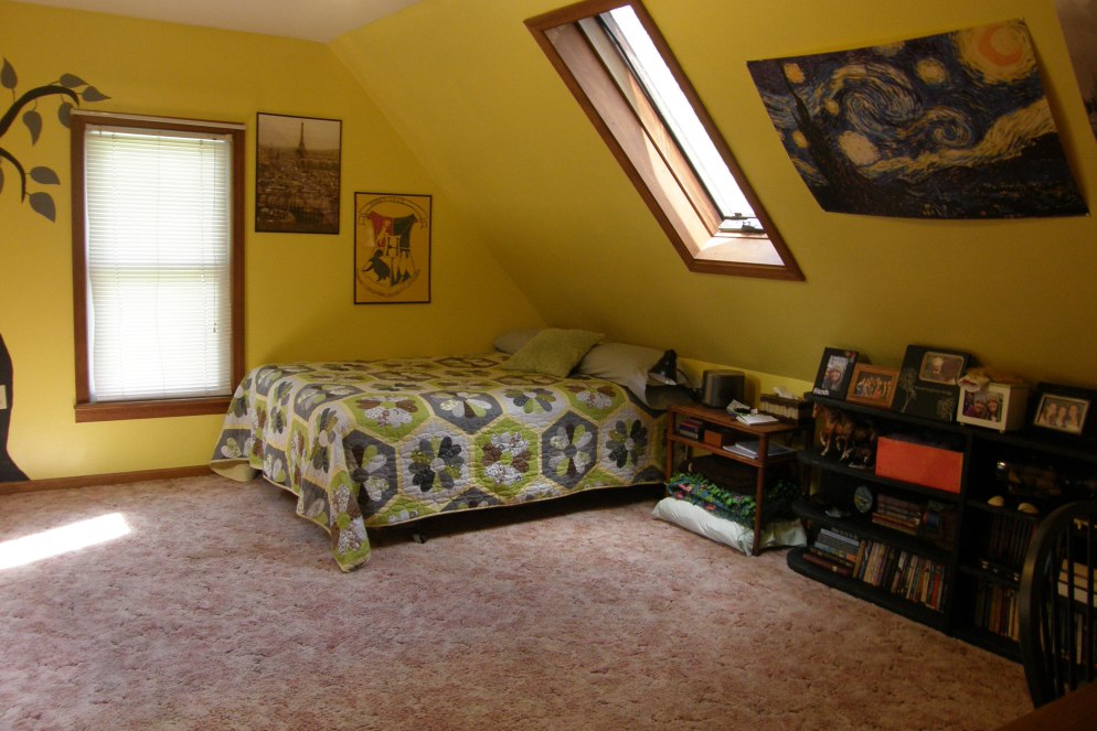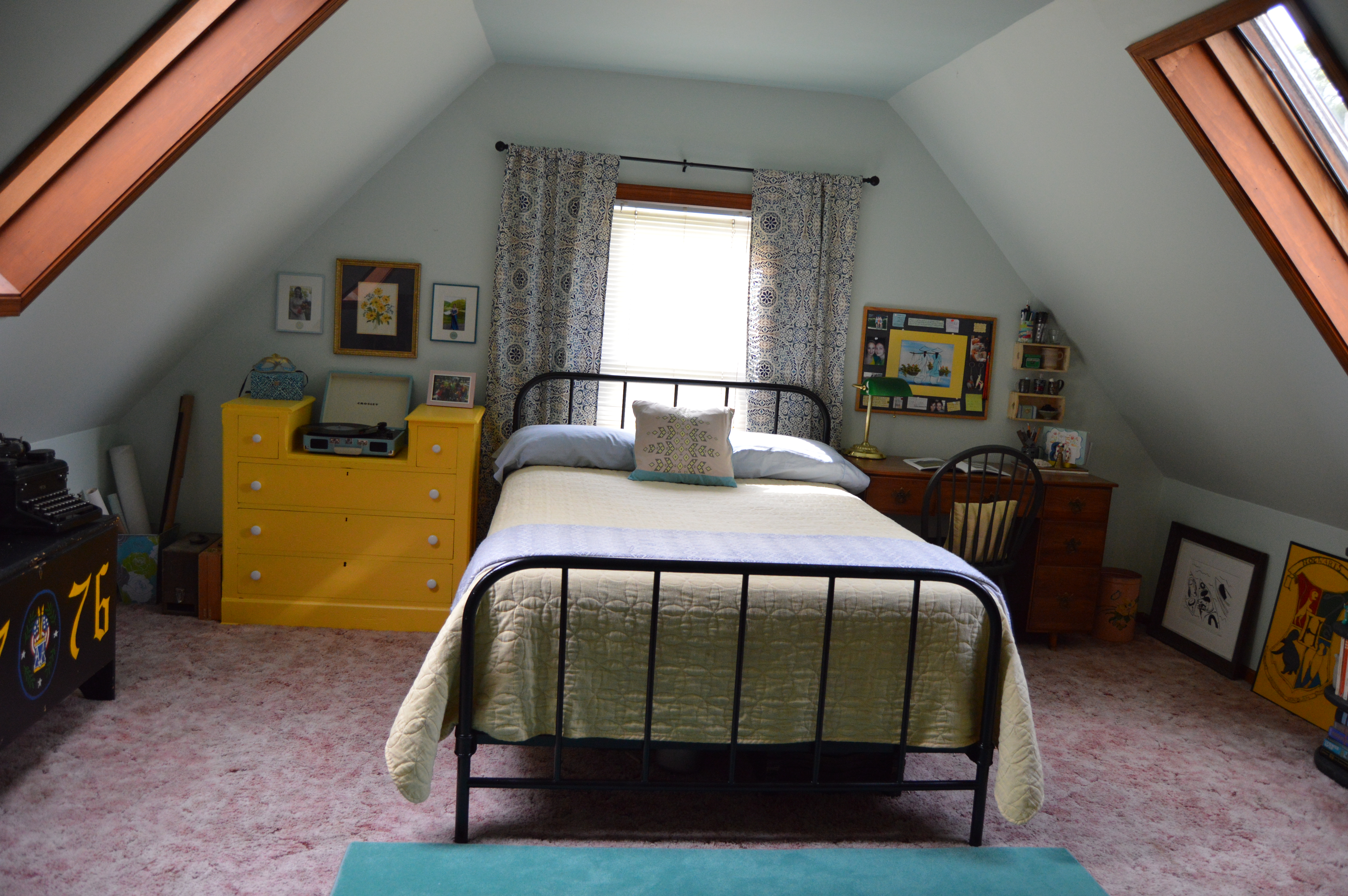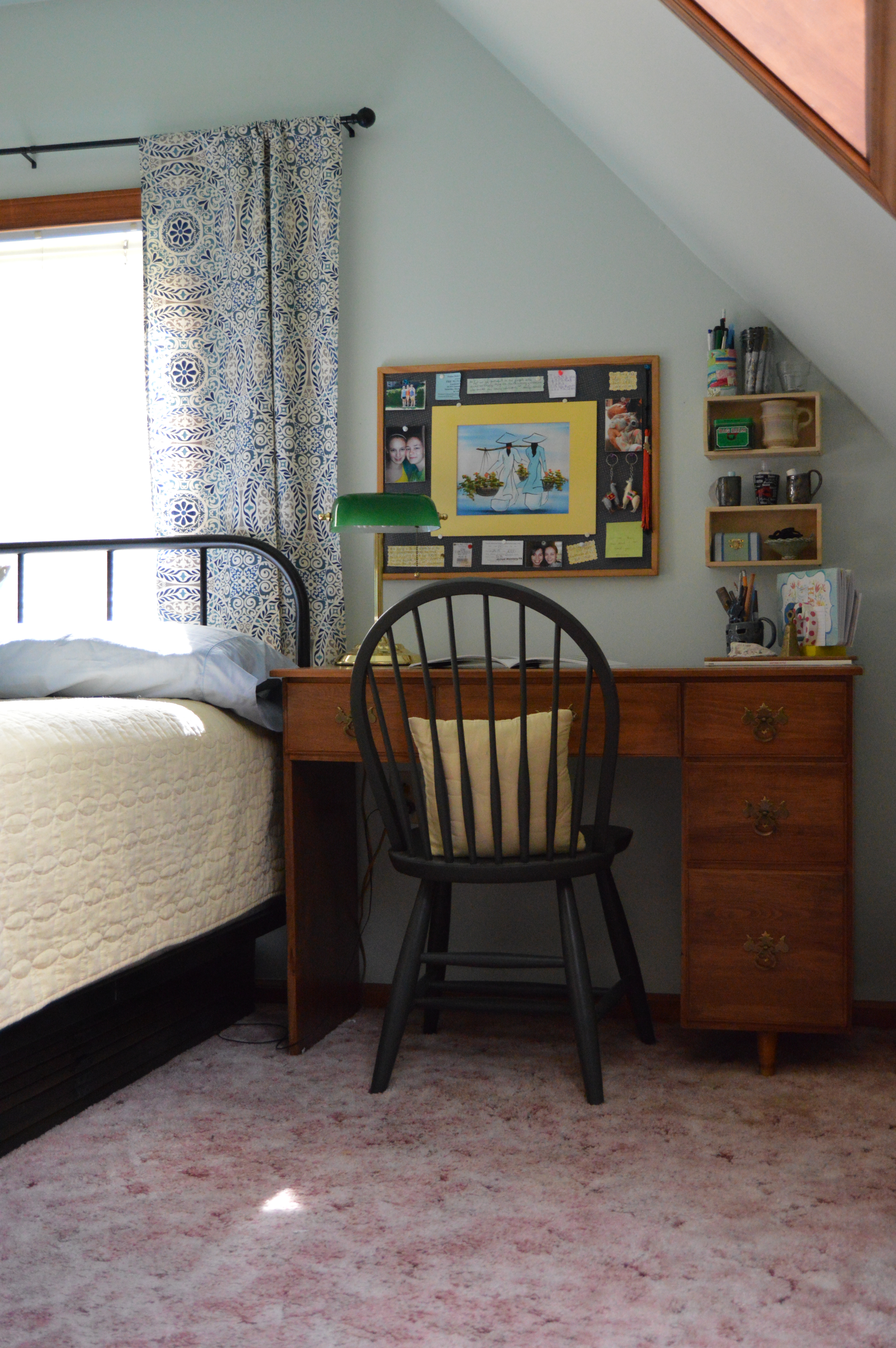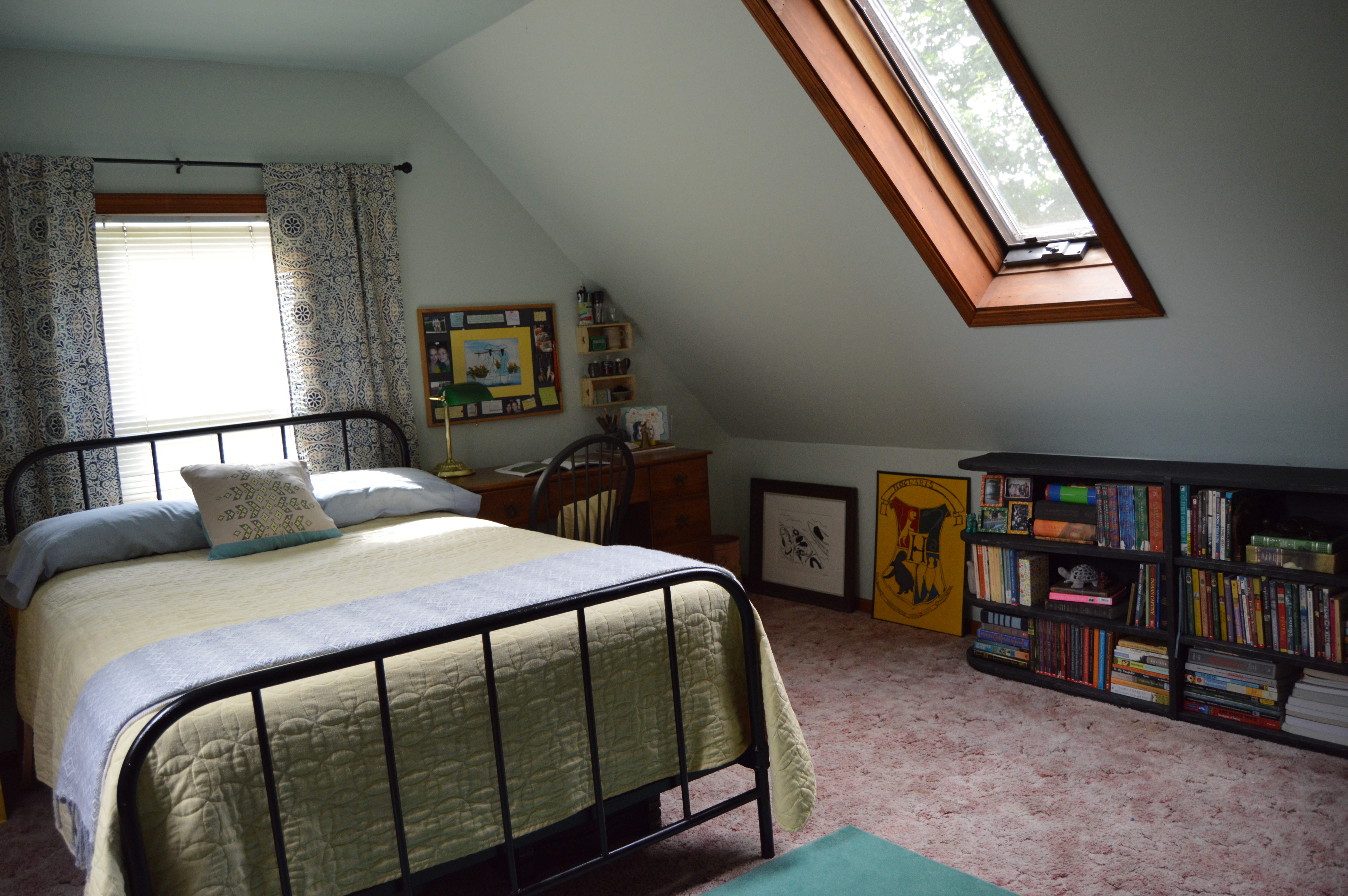 Because the room has slanted walls, the only place for the bed that really made sense was to center it on this wall, which meant placing it in front of the window. I made some curtains from fabric I got on clearance at JoAnn Fabrics. To make the bed seem less awkward in front of the window, I hung the curtains so that they would be wider than the bed.