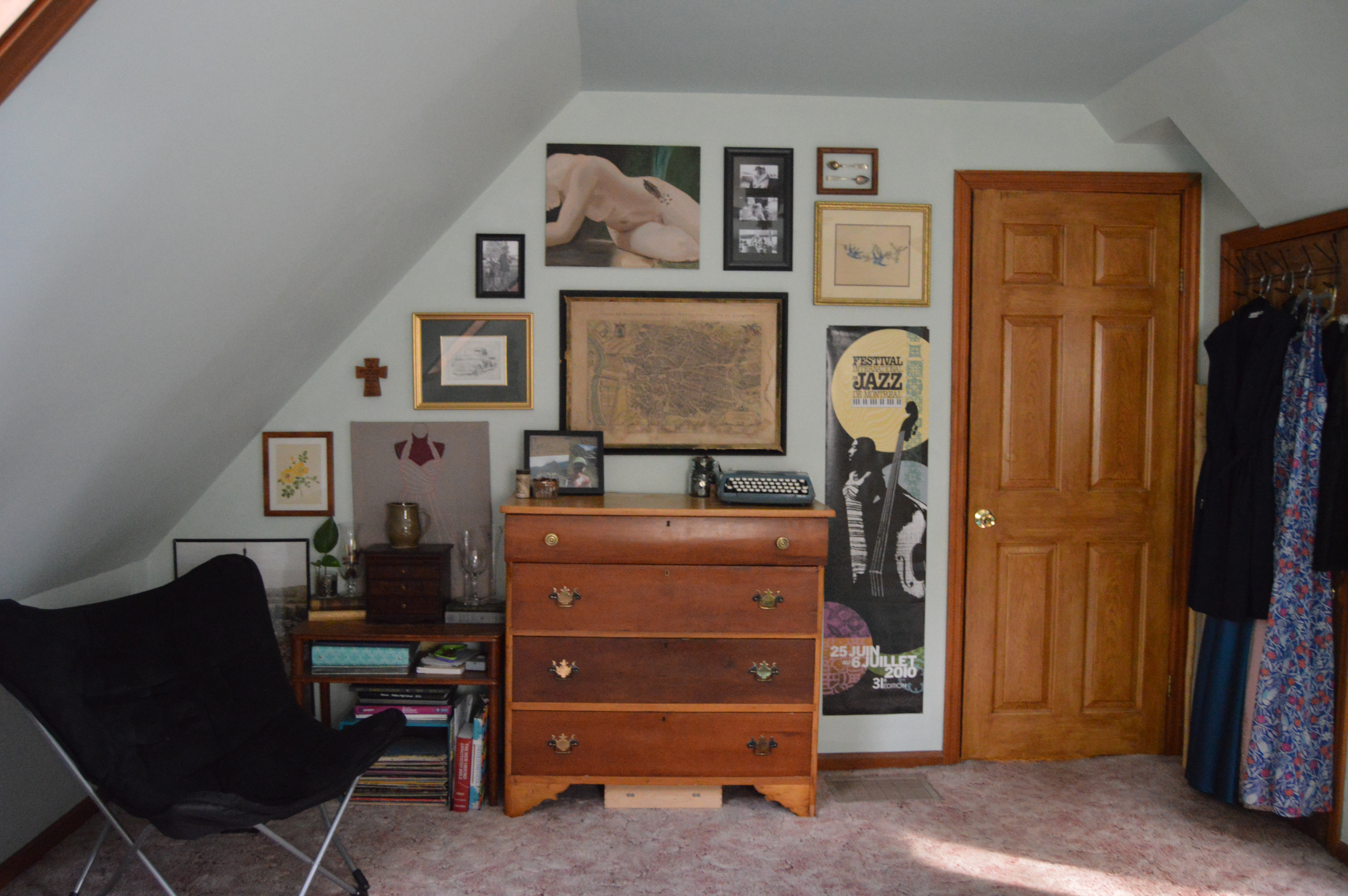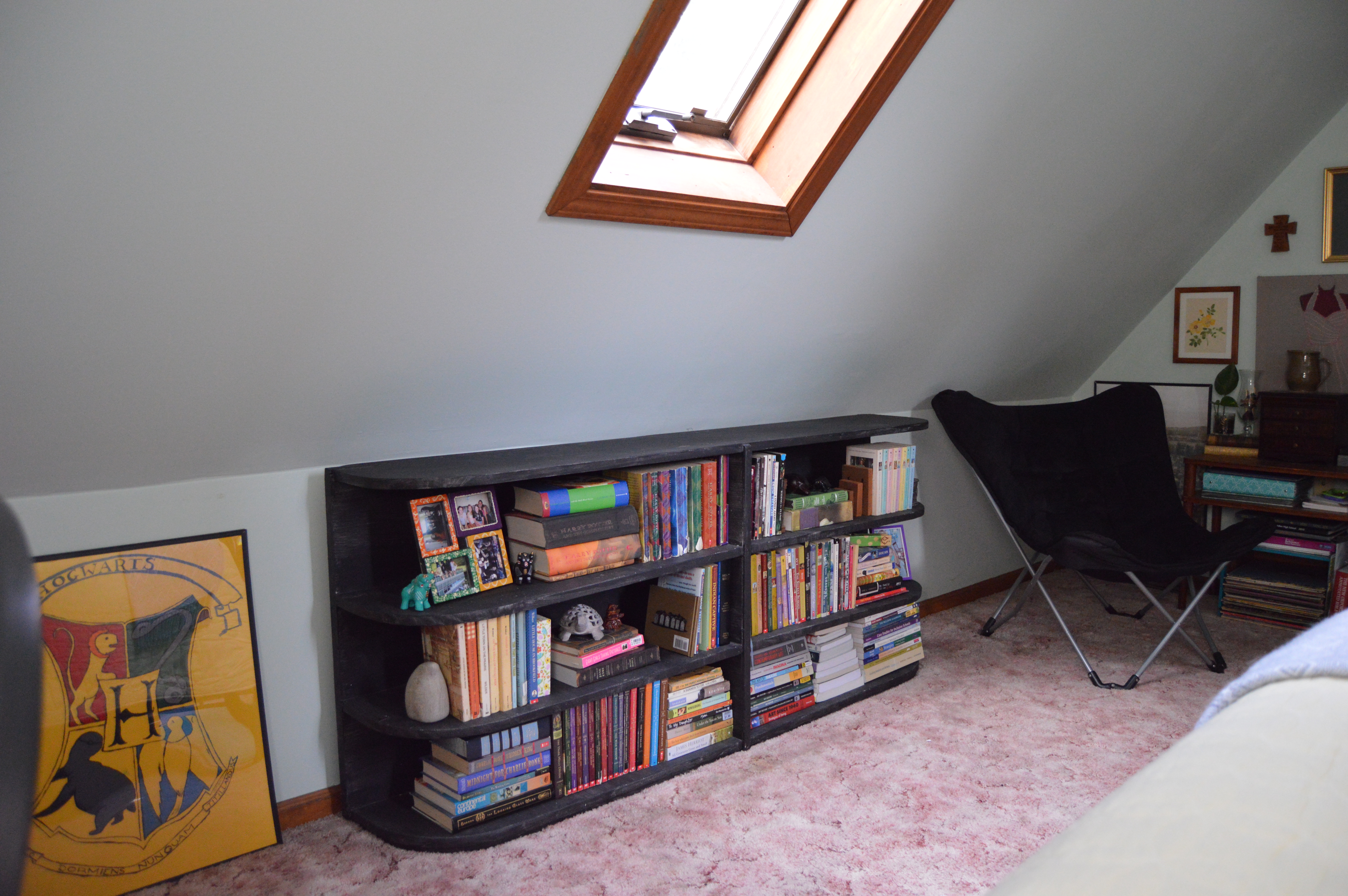 The right side wall holds my large bookshelf and some artwork. The shelf was a perfect find by my parents many years ago. It fits right under the slanted walls and holds a lot of books. I painted it black several years ago.