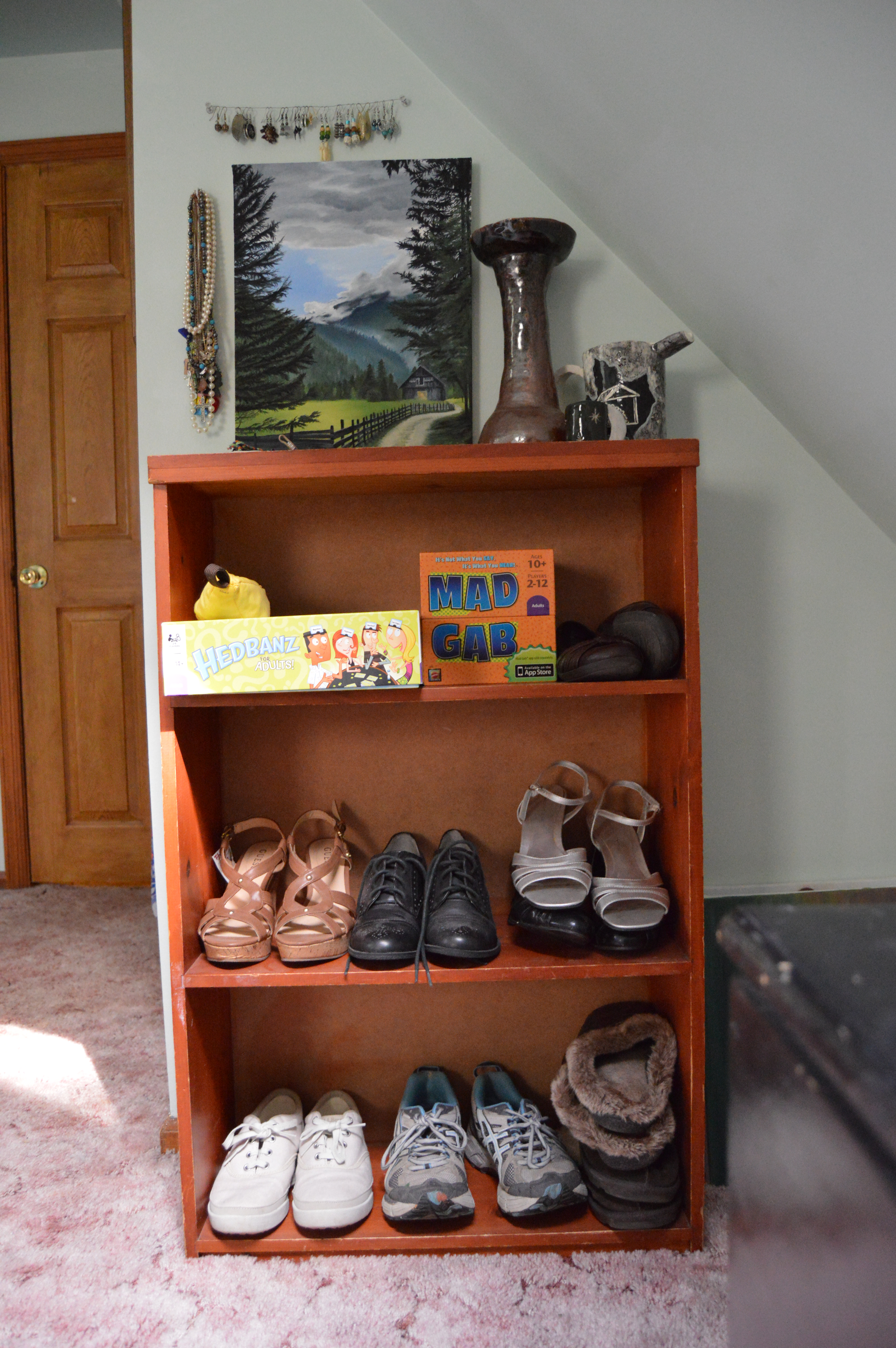 The closet also creates this little nook. A small bookshelf holds my shoes and some board games and the top functions as my vanity area. A wire hung with thumbtacks is the perfect place to store my earrings, and a hook holds my necklaces. The beautiful painting was done by one of my super-talented college friend, Jess.