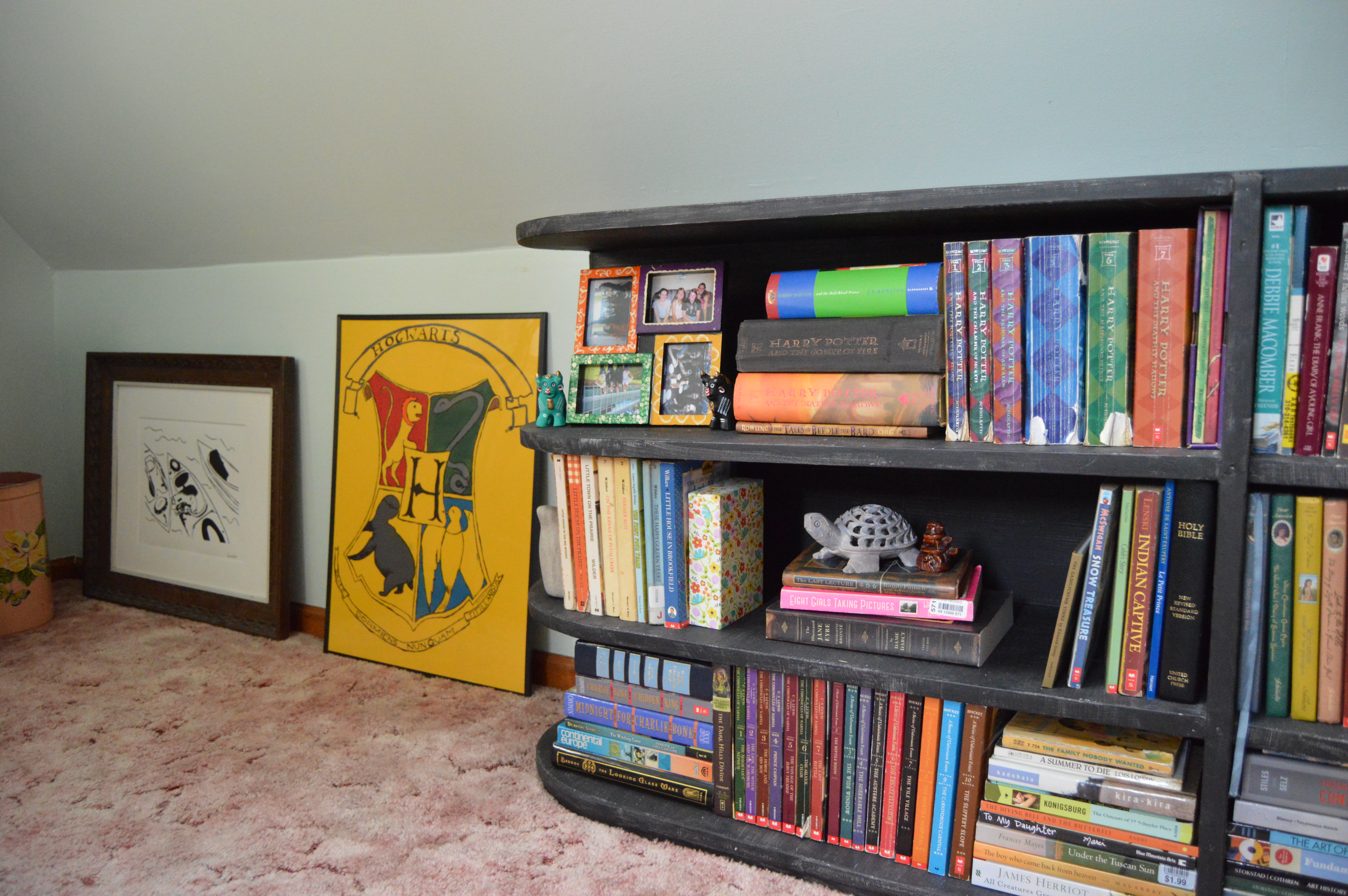 I love the bright pop of color the books on the shelf add. The bookshelf also holds my turtle collection, two of which you can see here. The Hogwarts crest was a painting I did in middle school and it sits next to a print I made in a printmaking class at college.