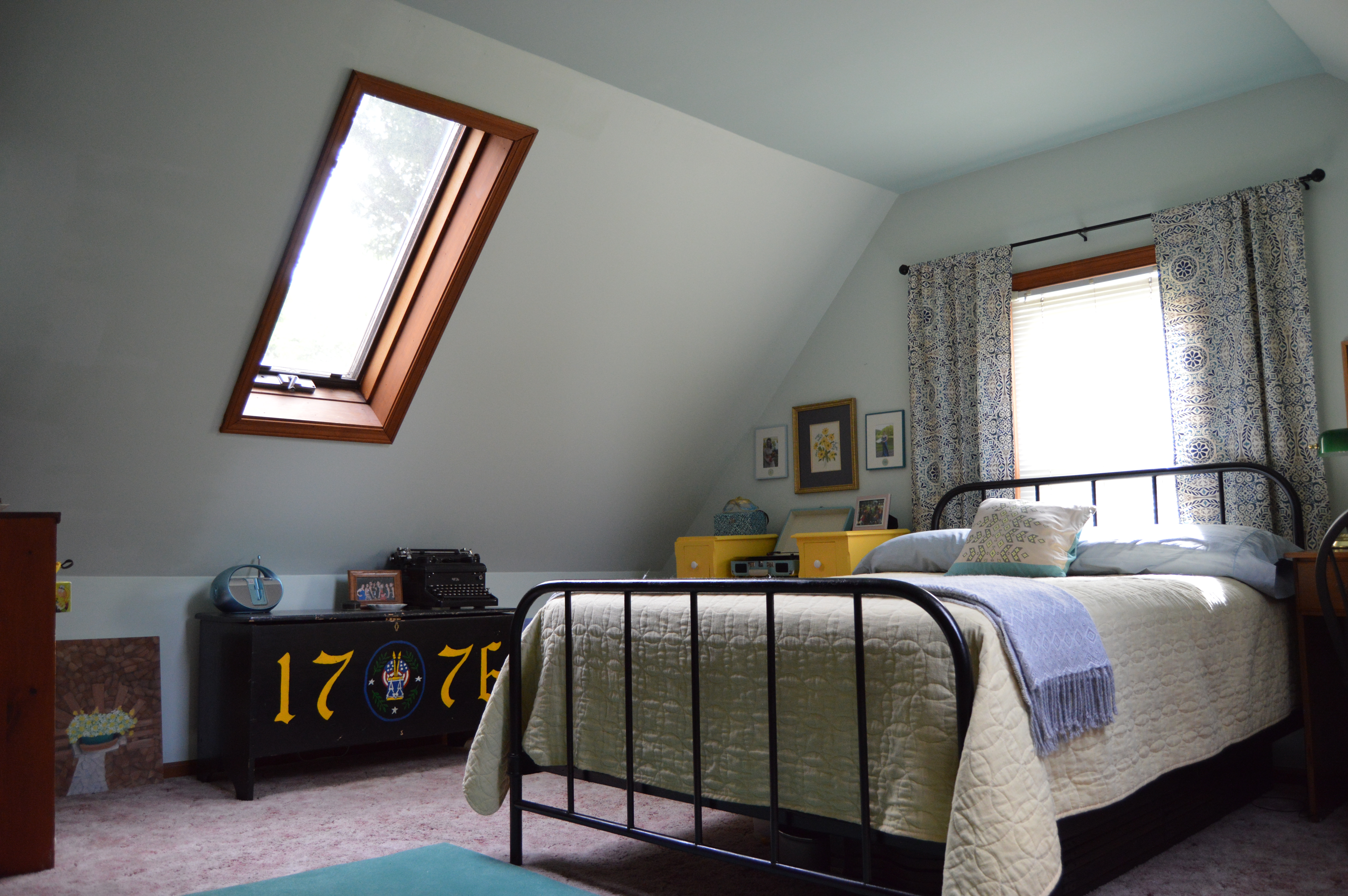 As much as I loved the yellow, it was a bit much, and the arrangement of the furniture made the room feel really big and empty. I painted the walls a light blue (I was really going for more of a mint color, but I ended up with a light blue, which ended up working out just fine). I also painted the ceiling a slightly darker shade of blue than the walls. I then rearranged the furniture, eventually settling on putting the bed in front of the window.