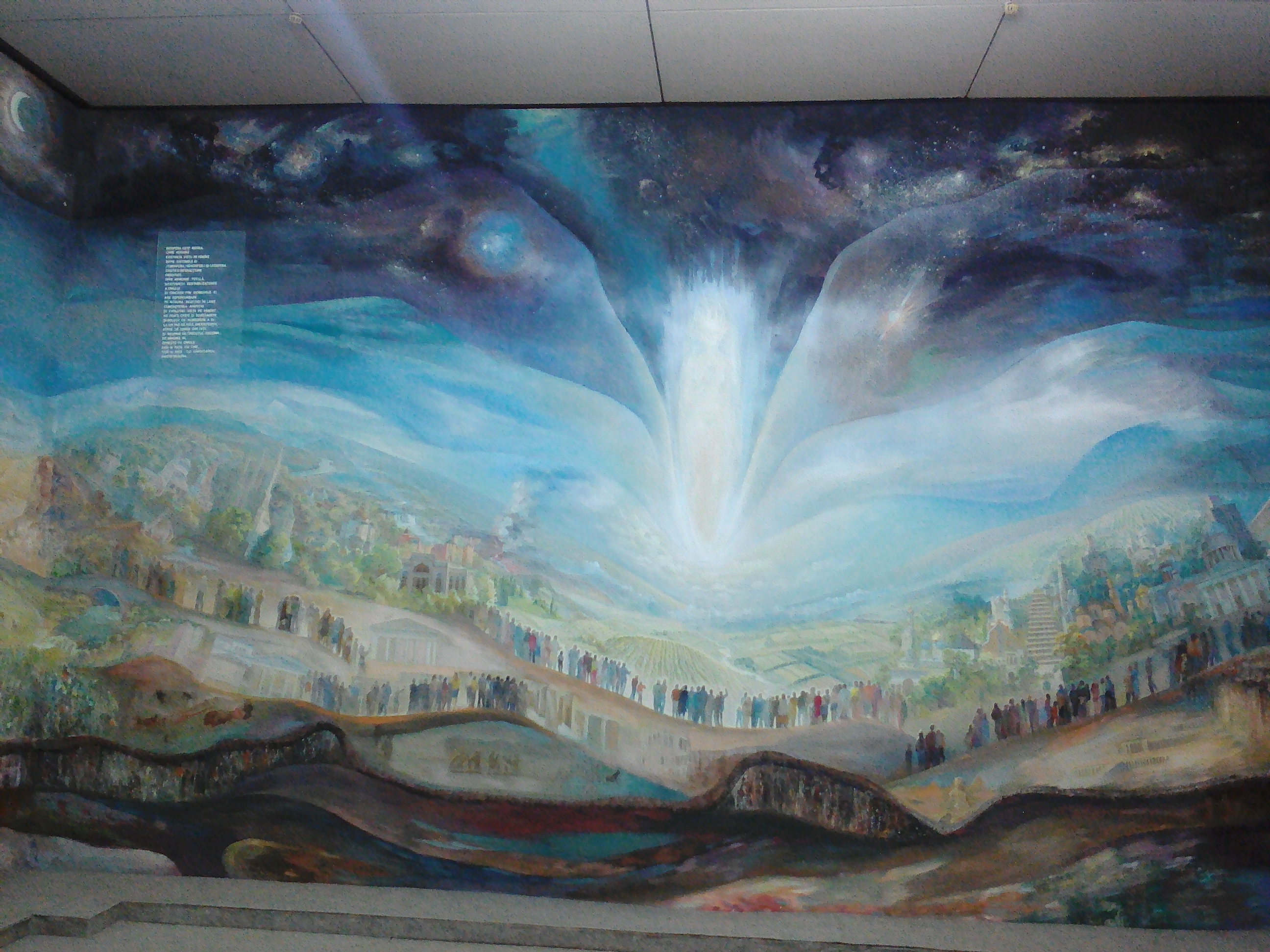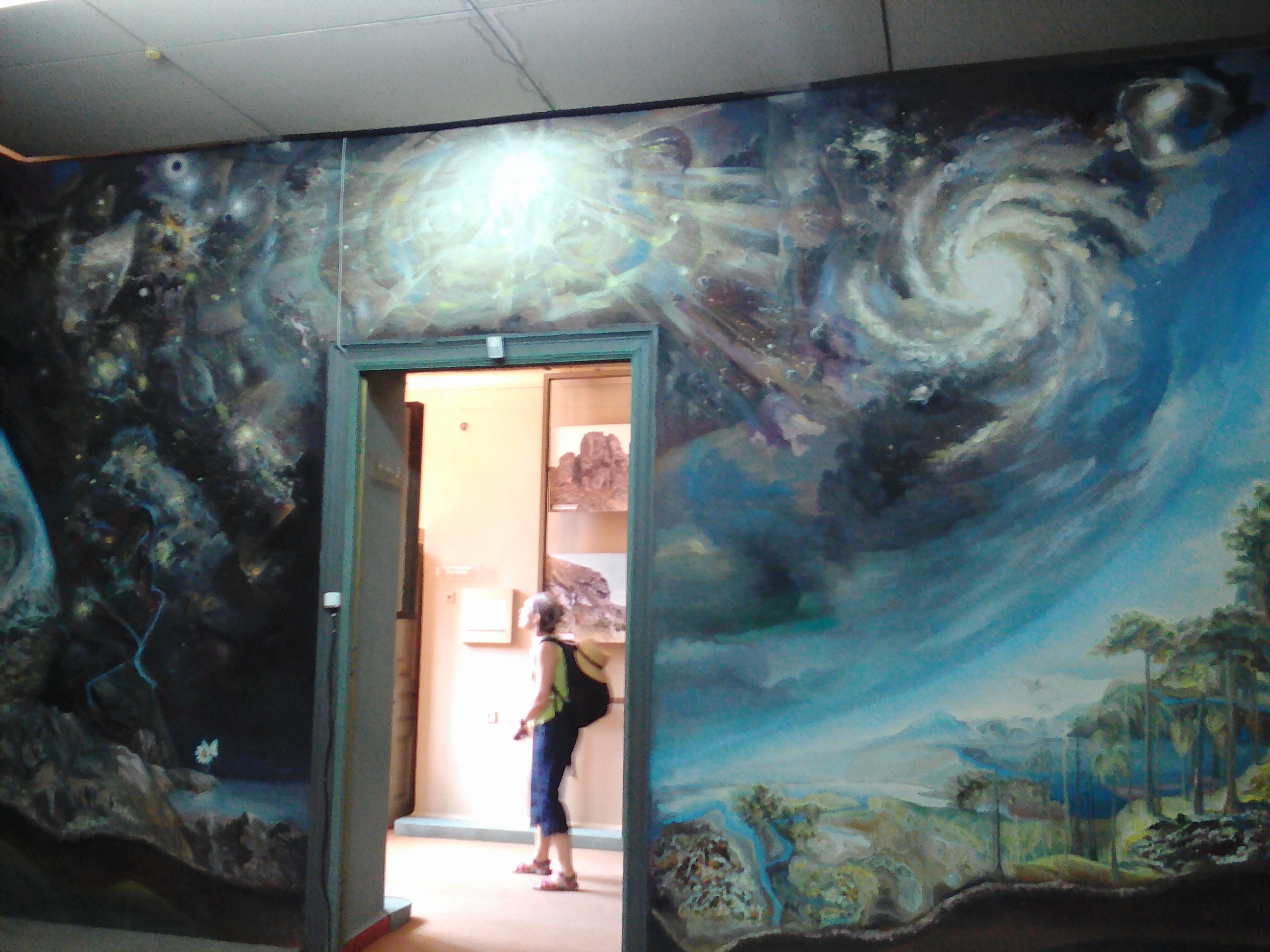 Wall #1 of the mural room at the National Museum of Ethnography and Natural Science (showing the big bang and the creation of the earth)Wall #2 of the mural room at National Museum of Ethnography and Natural Science (showing the natural environment before human arrival)Wall #3 of the mural room at the National Museum of Ethnography and Natural Science (showing humans and nature living in harmony- Mother Nature is the ghost-like white figure in the middle)Wall #4 of the mural room at National Museum of Ethnography and Natural Science (showing the destruction of the earth by humans)