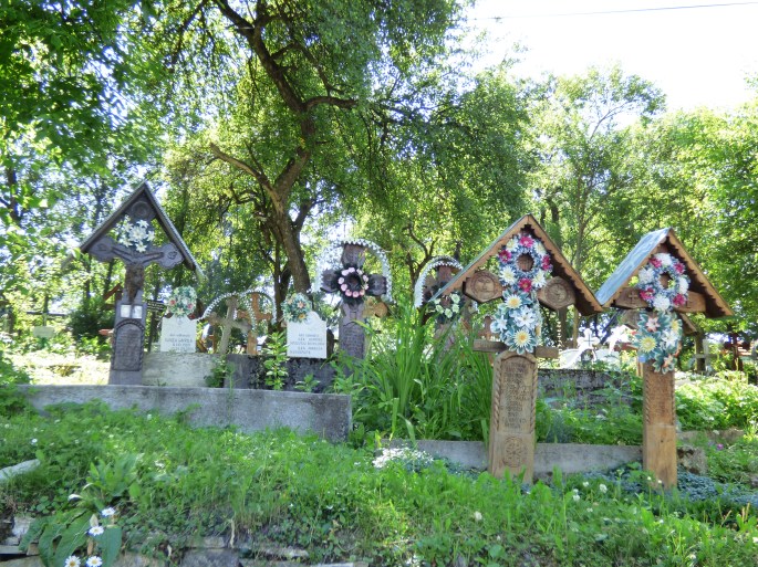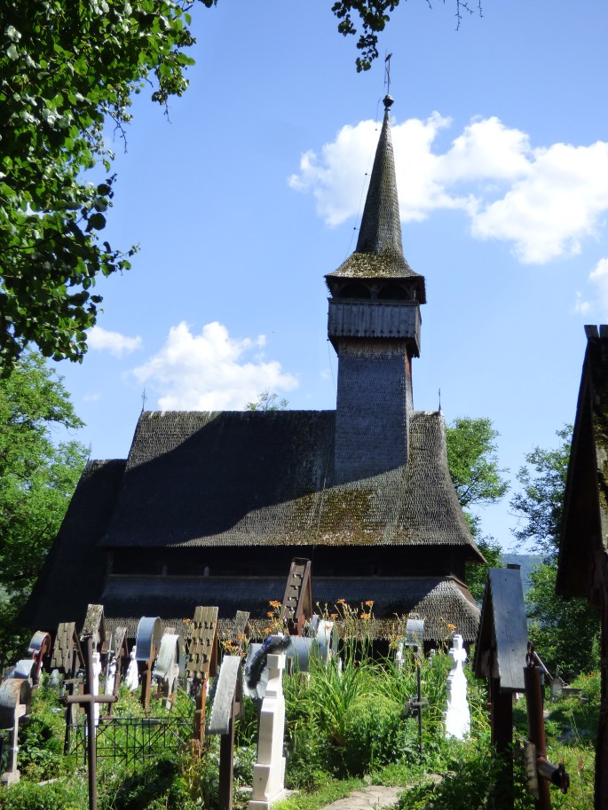 The first wooden church we visited was in Ieud. This church is believed to have been built in 1364 (though there is disagreement on this and some believe it wasn’t built until the 16th century) and as such is considered the oldest wooden church in the Maramureş area. It is built of fir and is a UNESCO heritage site. Pictures weren’t allowed inside, but the inside was covered in fairly well-preserved murals covering pretty much every surface. There is also a ladder inside that is built from one large piece of wood, which is quite unique. We went inside the church to admire the murals and spent a short time walking around the cemetery that surrounds the church.