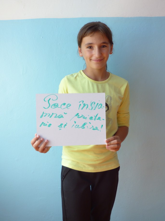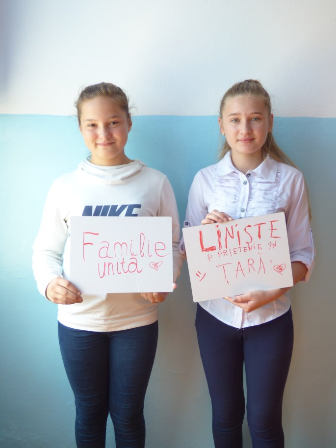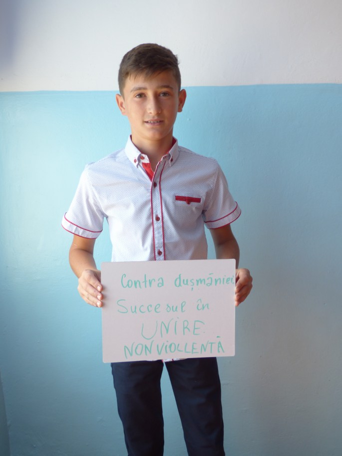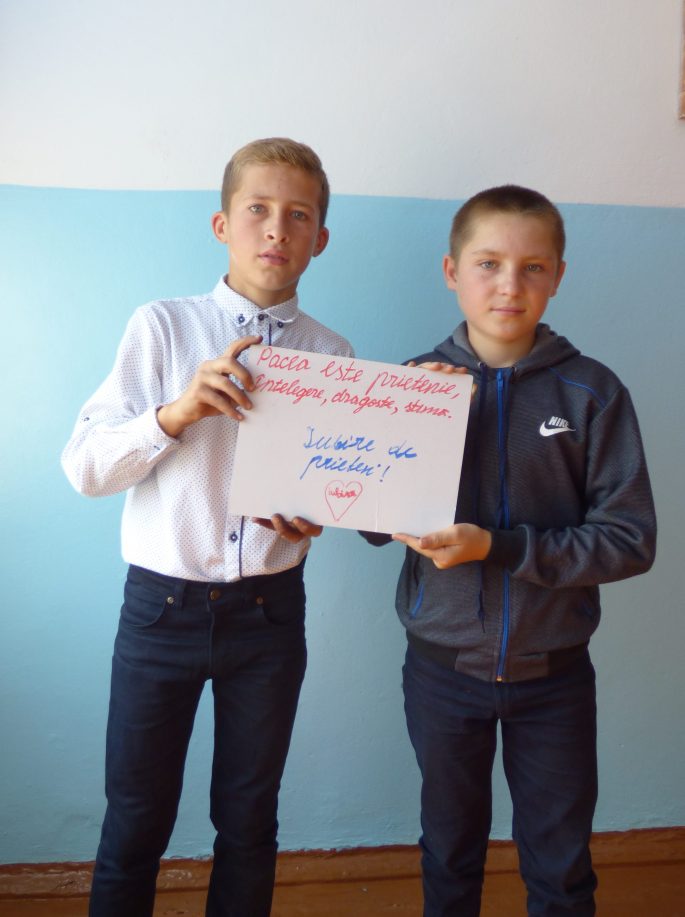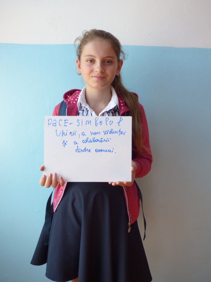 After a short assembly with students in 5th through 9th grade, where some 9th grade students read some information about the holiday and this year’s theme, we gathered all of the students and some of the teachers in the courtyard in front of our school. The students formed the shape of a peace sign, which most of the students but few of the teachers were familiar with.