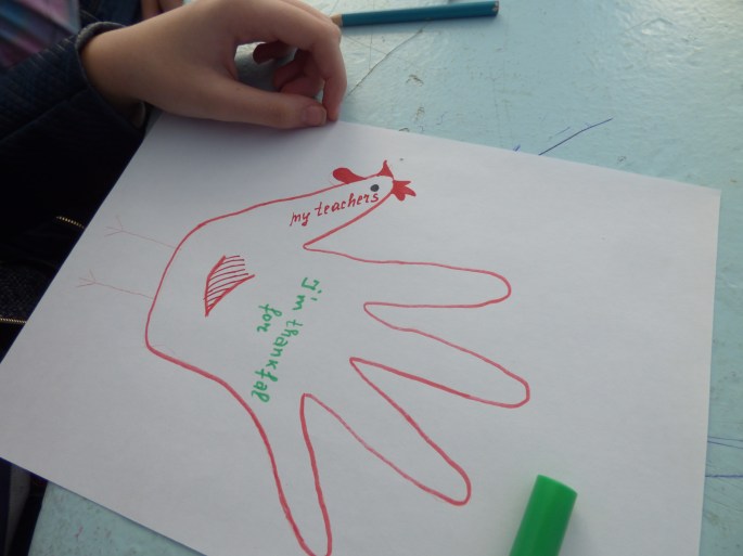 Day 71: Our dog, Rochie, sometimes likes to walk to school with me.Day 72: Our cat discovered he can watch us in the kitchen (his favorite room) from the window.Day 73: My host mom often leaves me boiled eggs on the days she leaves the house before I wake up. This morning, she also left me a note!Day 74: We celebrated Hram (our Village Day) with a beautiful masa (holiday meal).Day 75: Fresh rolls, right out of the oven in preparation of Thanksgiving celebrations.Day 76: In English Club, we made hand turkeys with things we are thankful- I think this student was trying to get on my good side :).Day 77: Our dog was sad he had to stay home while I went to the capital to celebrate Thanksgiving with other volunteers.