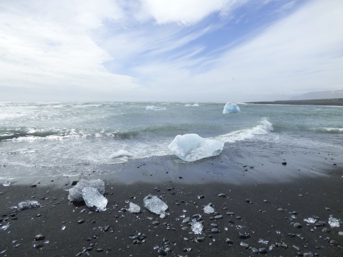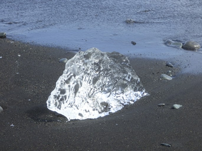 Across the road from the lagoon is Jokulsarlon Beach, which is generally known as Diamond Beach. We followed a path from the lagoon parking lot below the bridge and came out at the beach. It’s known as Diamond Beach because when pieces of ice break off the icebergs in the lagoon, they flow down the stream into the ocean, where they are then sometimes pushed up onto the black sand beach by the waves. These pieces of iceberg have begun melting, so they often look like diamonds glittering on the sand. The day we went, there weren’t many larger pieces, but it was still cool to walk along the beach and look at the smaller pieces contrasting with the dark sand.