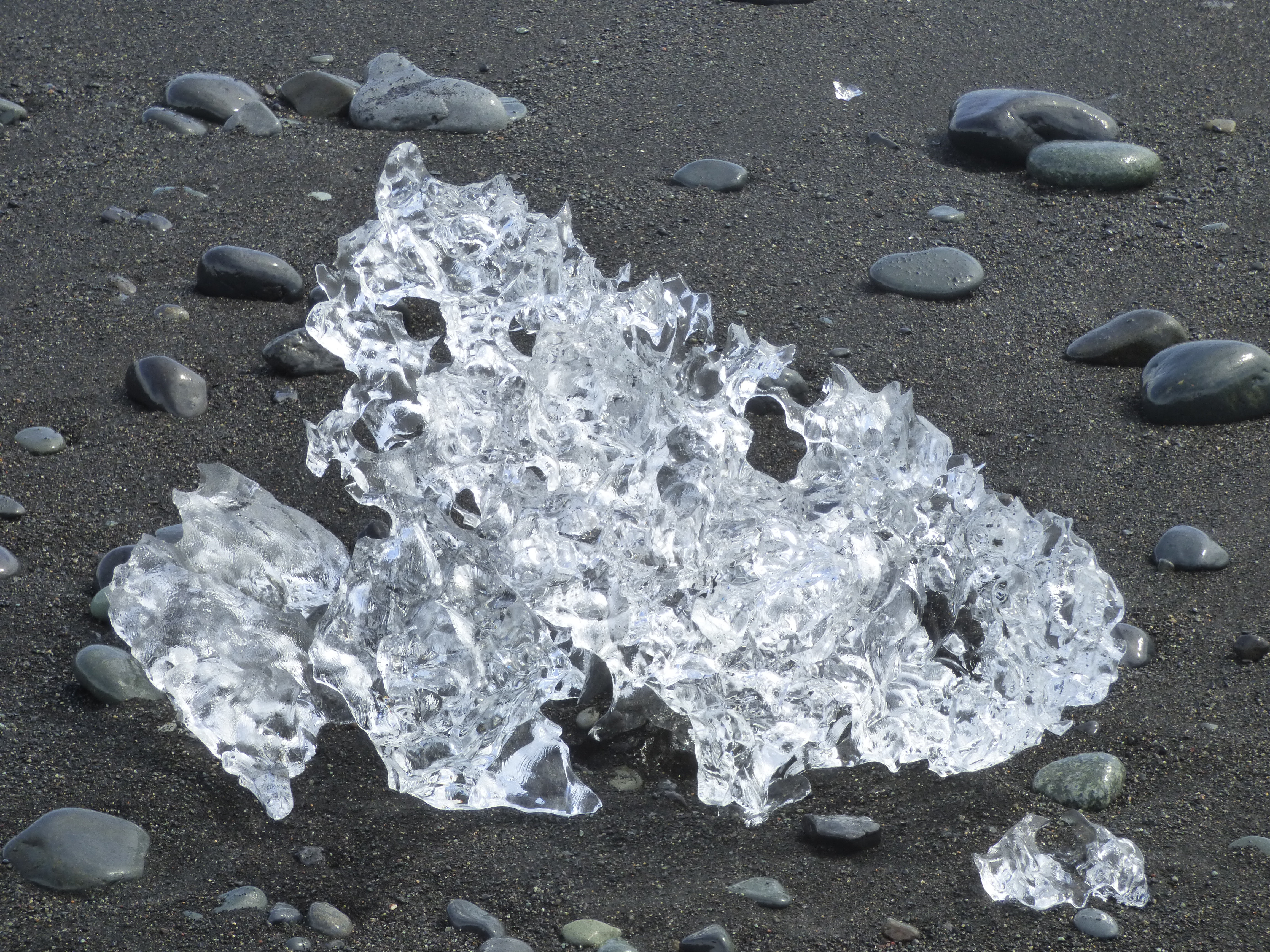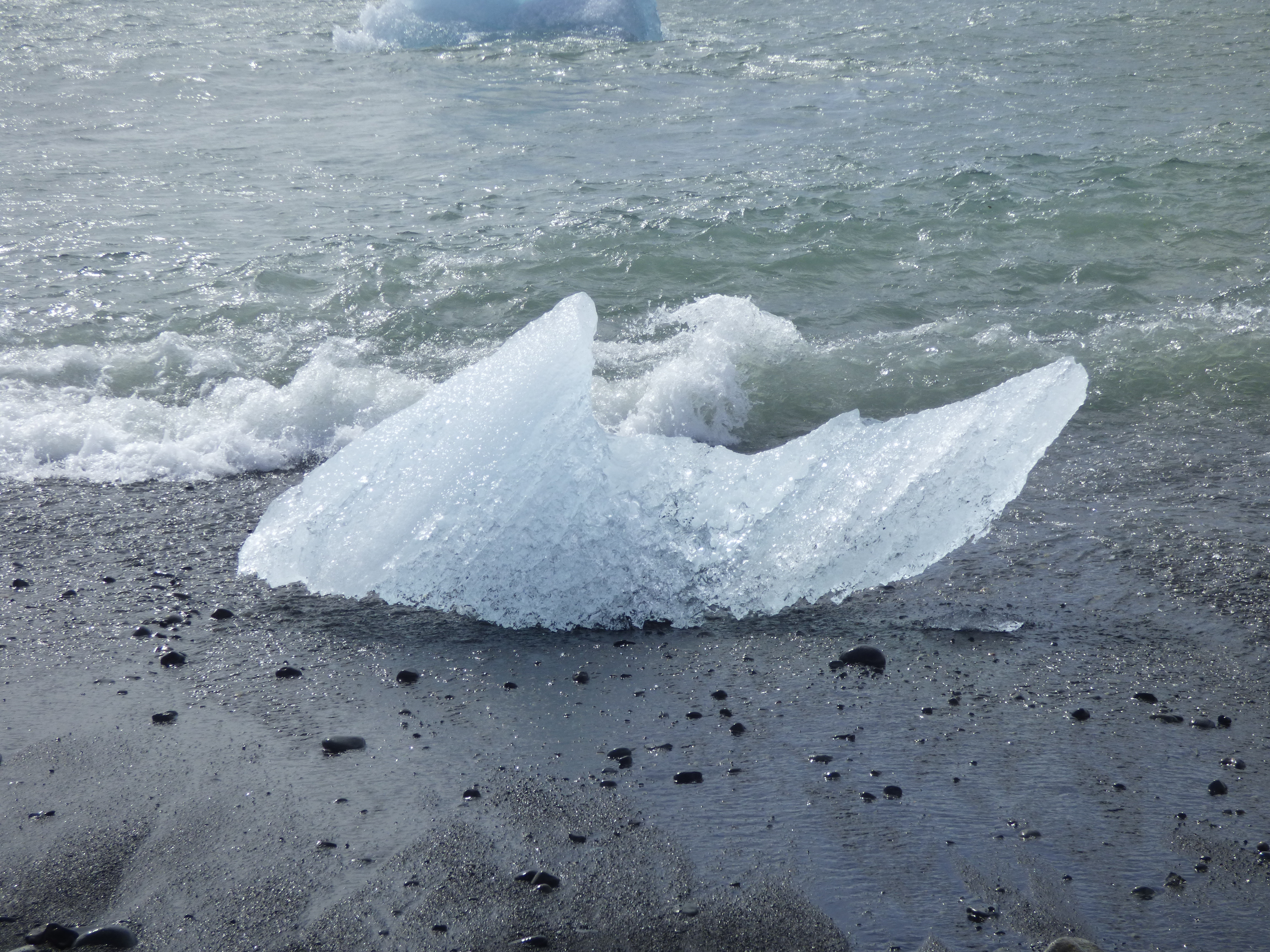 Across the road from the lagoon is Jokulsarlon Beach, which is generally known as Diamond Beach. We followed a path from the lagoon parking lot below the bridge and came out at the beach. It’s known as Diamond Beach because when pieces of ice break off the icebergs in the lagoon, they flow down the stream into the ocean, where they are then sometimes pushed up onto the black sand beach by the waves. These pieces of iceberg have begun melting, so they often look like diamonds glittering on the sand. The day we went, there weren’t many larger pieces, but it was still cool to walk along the beach and look at the smaller pieces contrasting with the dark sand.