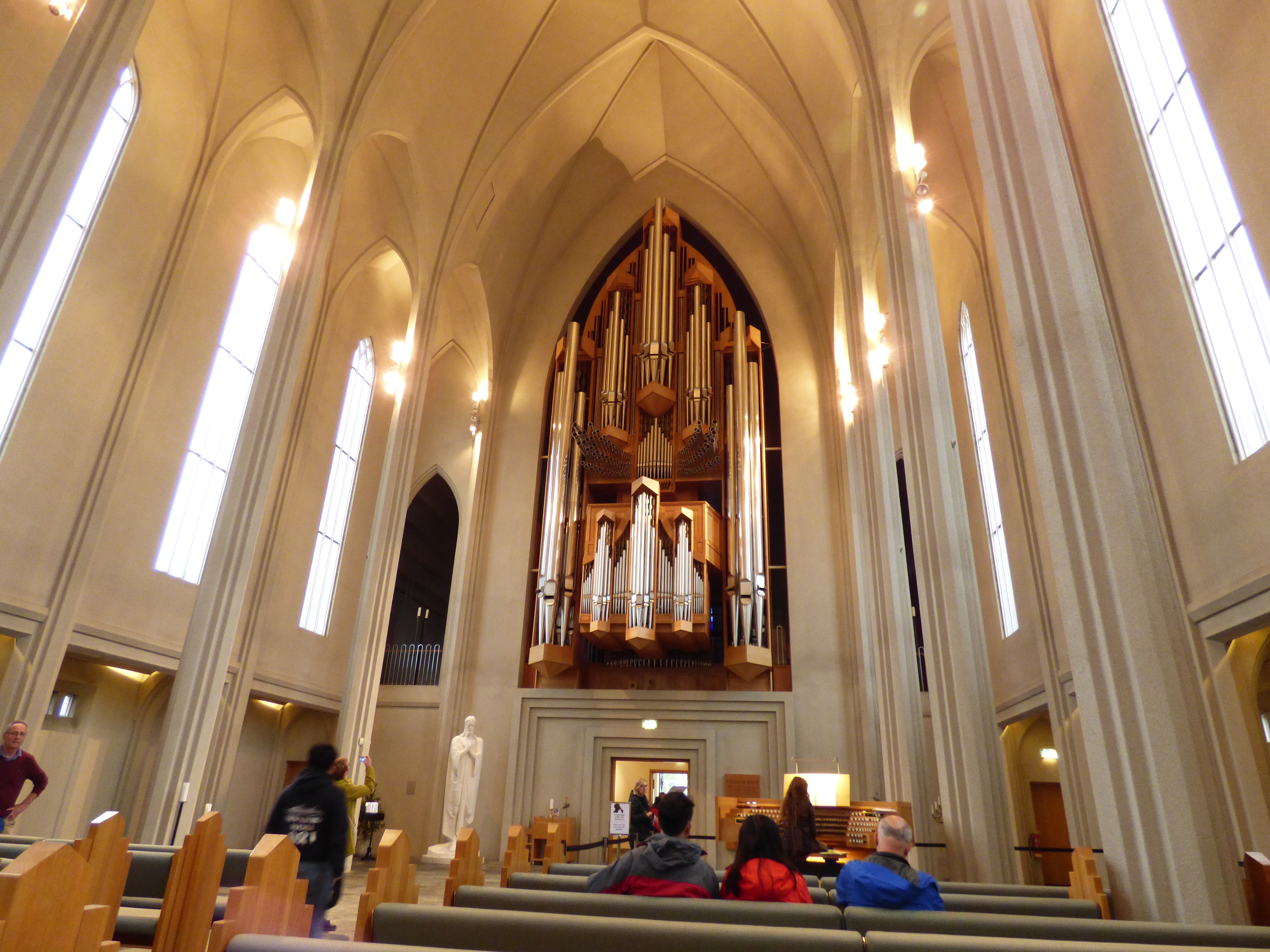 After we ate, we visited Hallgrimskirkja Church, which is visible from nearly everywhere in the city. Its design was inspired by the shapes and forms created when lava cools into basalt rock and it was built from 1945 to 1986. Inside, it has an enormous organ and in front of the church is a large statue of Leifur Eiriksson (970-1020 AD), who was the first European to discover America in the year 1000 AD. We walked around outside and then sat inside for a while. The organist was practicing, so we were able to listen to the organ being played.