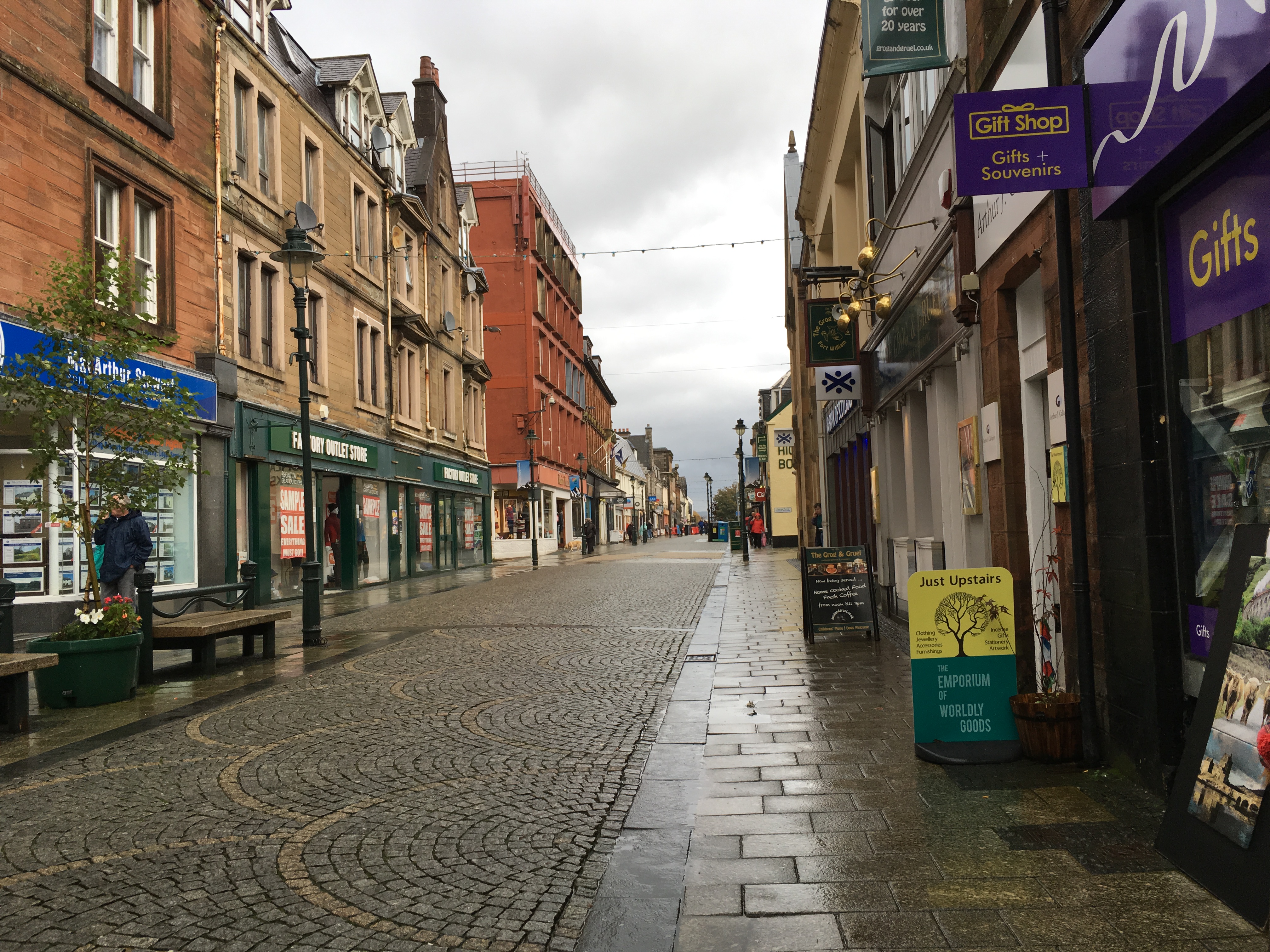 After wandering around the grounds of Urquhart Castle, we headed on to Fort William, where we ate lunch. It was raining hard when we arrived, so I only walked around a little bit. In the late 1800s, it was decided to extend the railroad to Fort William in hopes of increasing tourism. The town had to decide where to place the new train station. At the time, there was an old and very large fort in the town, but the townspeople determined that no one would want to see such a thing, so they tore it down (one wall remains) and used the space to build the train station and other buildings. So, while a cute town and a popular place to stop on tours and road trips in the Highlands, there is no longer the fort that gave the town its name.