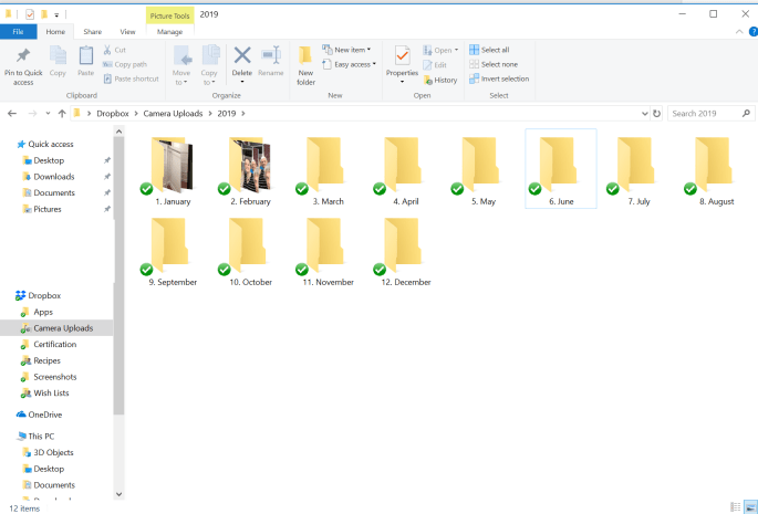 Because I upload my photos each month directly to Dropbox, the organizing step is actually very easy! At the beginning of each year, I create a folder in Dropbox with the year as the folder name. For example, this year’s folder name is “2019”. Inside that folder, I create 12 additional folders, one for each month of the year. These are labeled with the month. In order to keep them in the calendar order, each month name is preceded by the numerical for that month. So “1. January” for January or “9. September” for September. Once I’ve uploaded the photos to Dropbox, they can be found in the “Camera Uploads” folder on Dropbox. I just have to select them and drag them into the “2019” folder and then into the correct month folder. Since the file names are already by date, I’m all done!