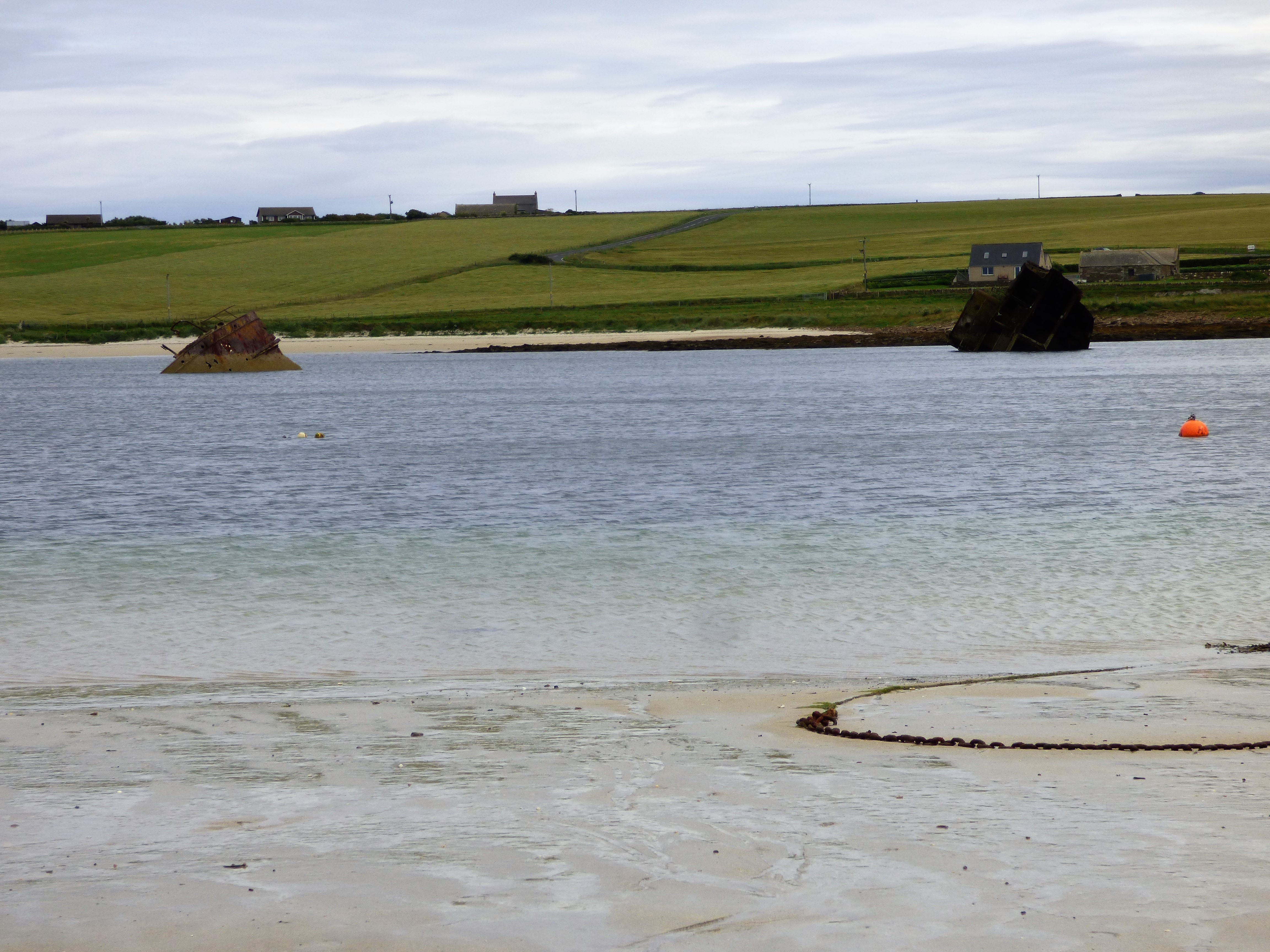 Eventually we reached Scrabster, where we got the ferry across to Stromness, which is a town on the Orkney Islands. The Orkney Island archipelago is made up of about 70 islands and has a population of about 20,000. About 20 of the 70 islands are inhabited. The Orkneys are known for their long history of inhabitation, dating back to the Neolithic era. Because of its remote location and low population, a number of prehistoric sites have remained. We spent the afternoon visiting a couple of locations. First we visited Scapa Flow. This is a beach and harbor where the entire German naval fleet was sunk at the end of World War I. A number of the ships are still visible where they stick out of the water.