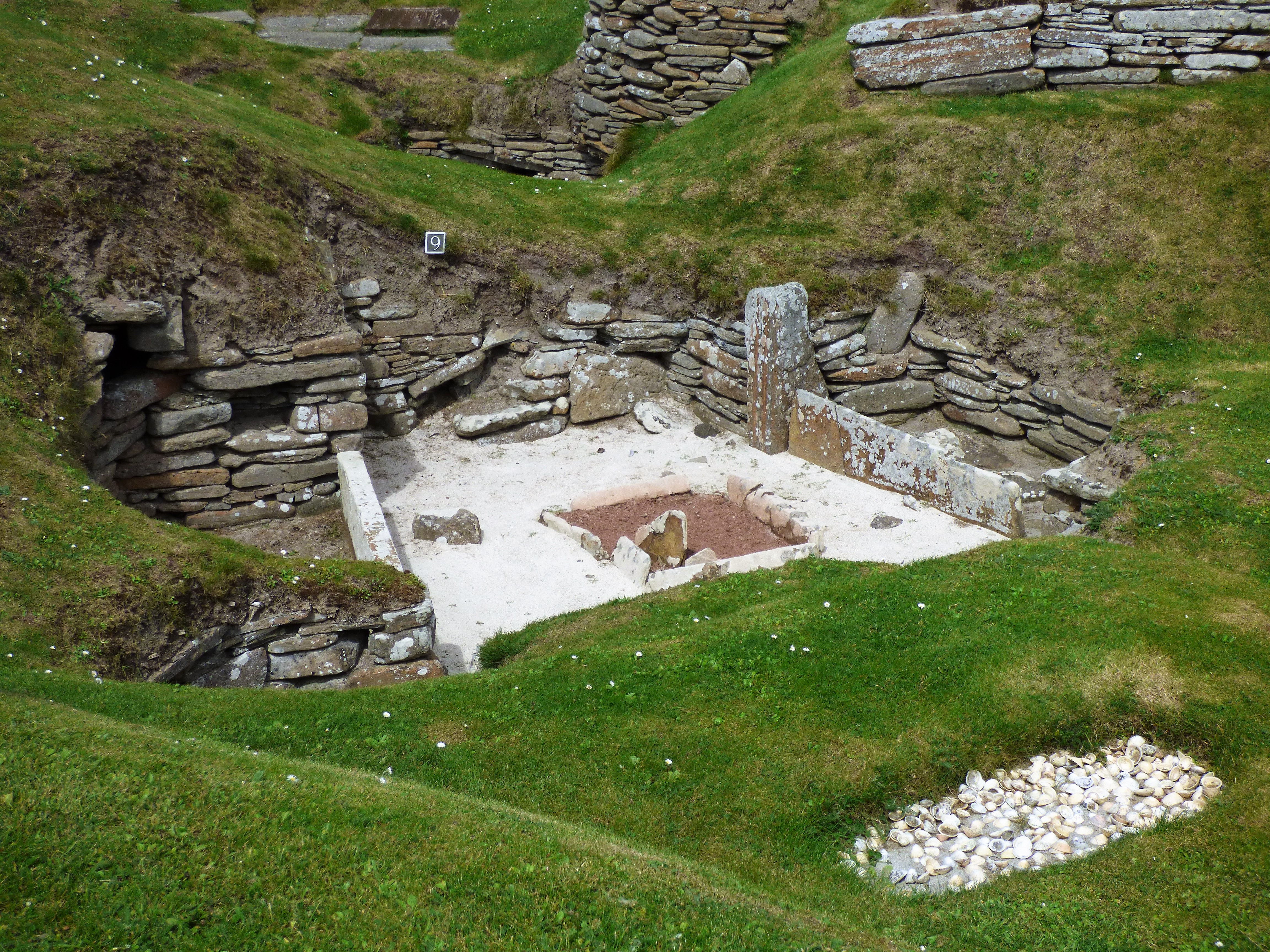 Our next stop was at Skara Brae (which also has an admission fee). Skara Brae is a largely intact Neolithic village that was occupied from about 3180 to 2500 BCE, making it older than Stone Henge or the Pyramids of Giza. It’s one of the best preserved Neolithic settlements in the world. At some point after the village was abandoned, it was covered with sand. It sat untouched and unnoticed until 1850, when a big storm ripped up the grass that had covered the sand mound. In subsequent excavations, more and more buildings were found. The houses have not been repaired- this is how they were found. One of the coolest parts is the stone furniture that was found inside the homes: beds, dressers, pantries.